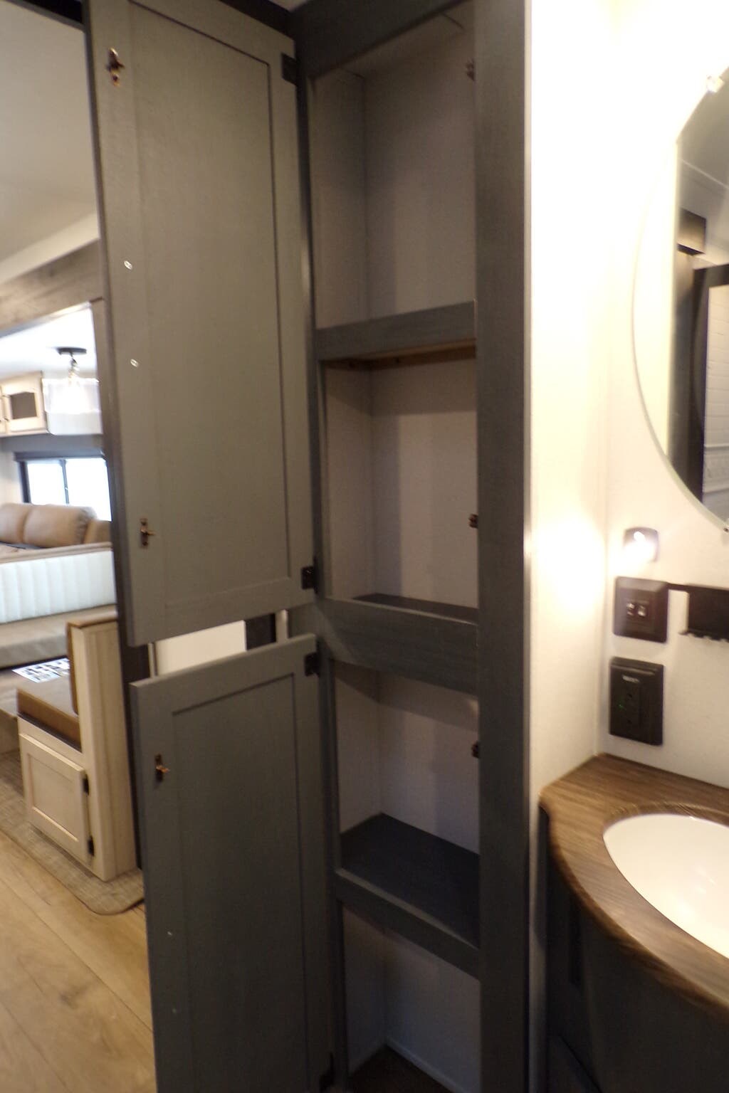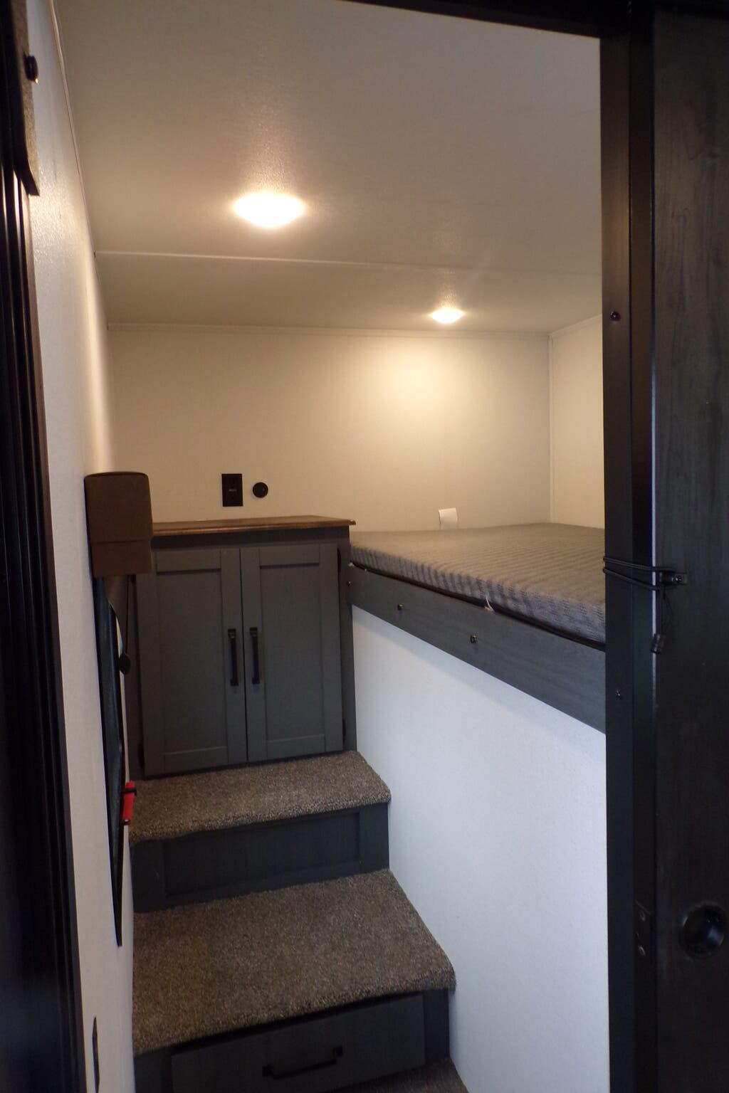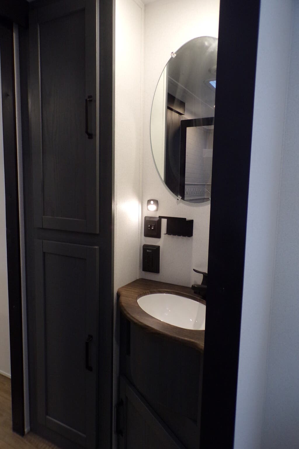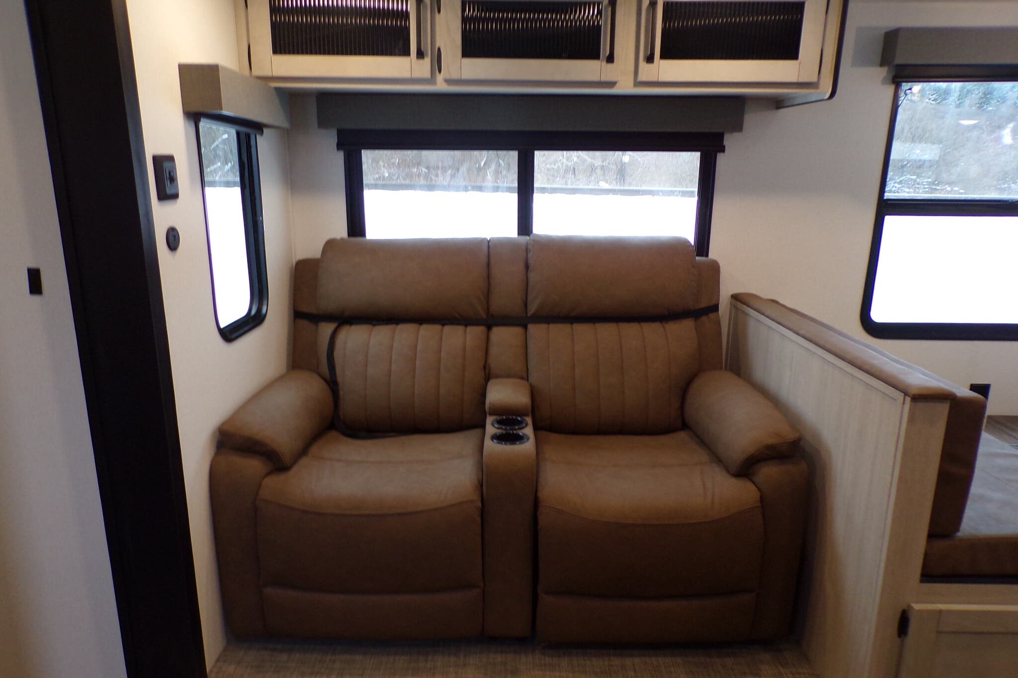 Booth Dinette, Bunk Beds, Bunkhouse, Dinette, Dinette Bed, Fireplace, Glass Shower Door, Pantry, Pocket Door(s), Queen Bed, Queen Mattress, Shower, Theater Seating, Toilet, Vanity