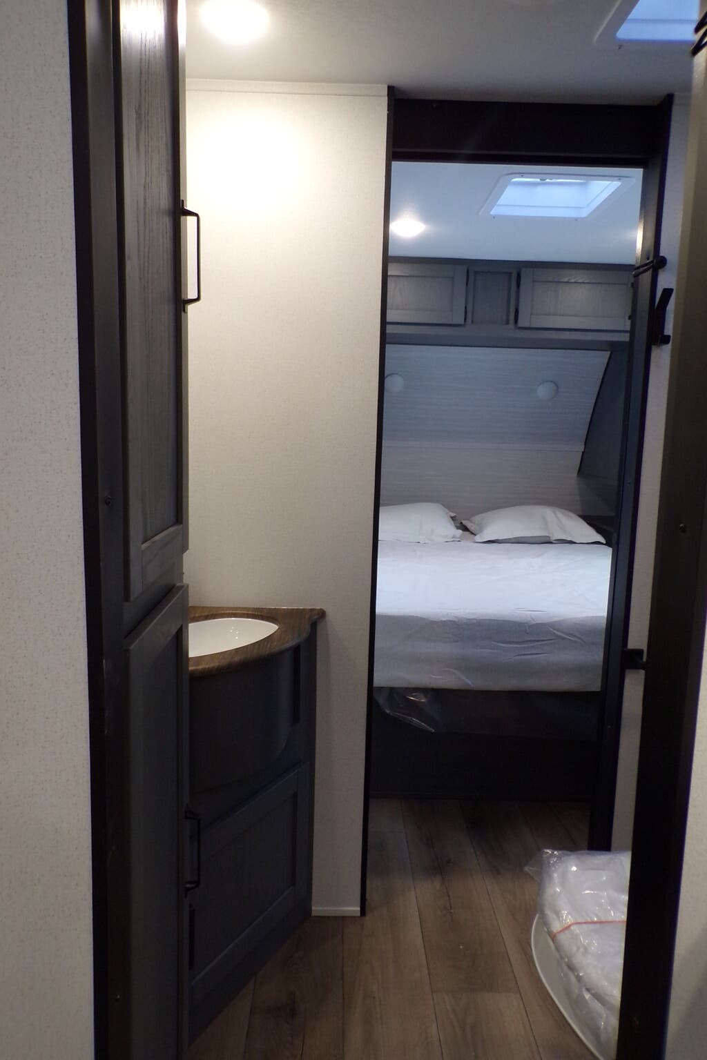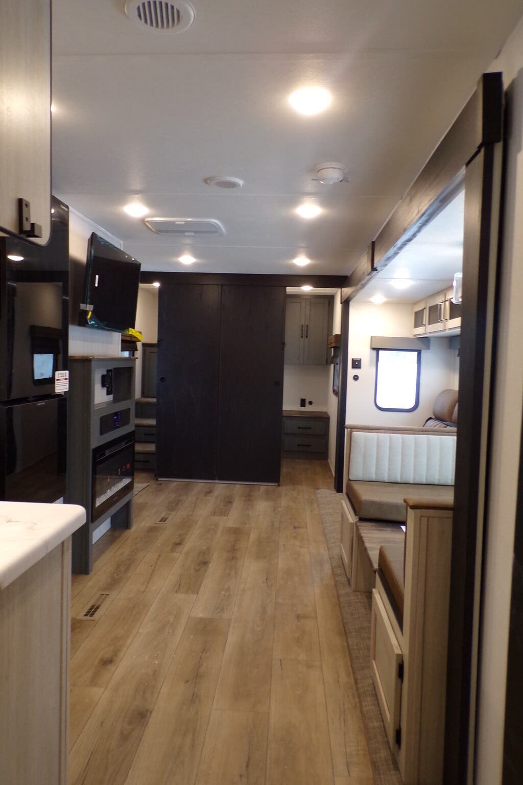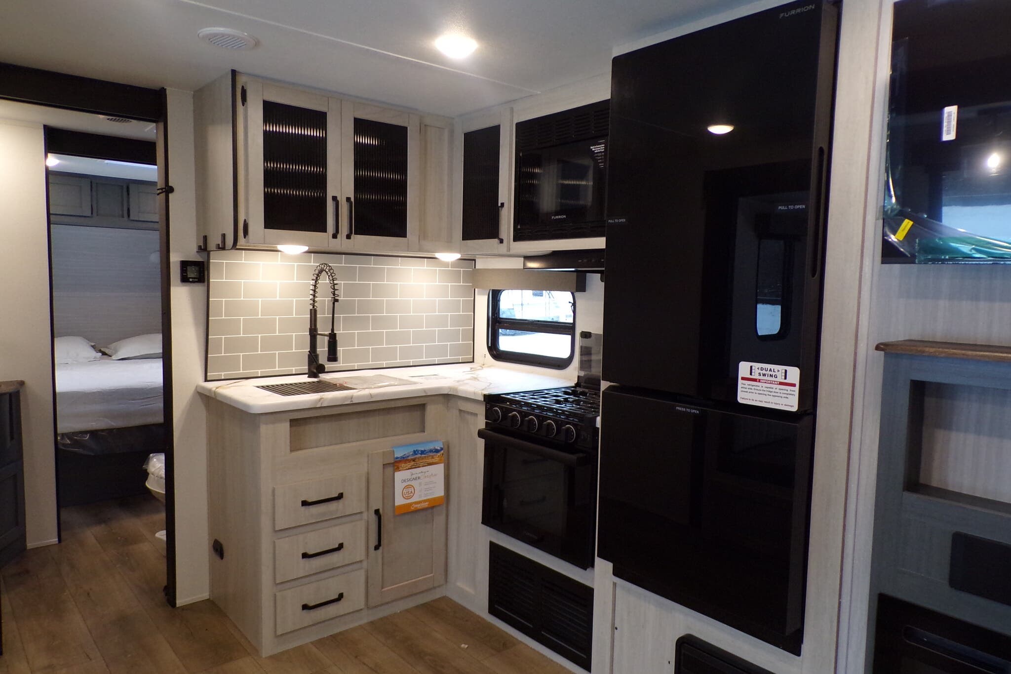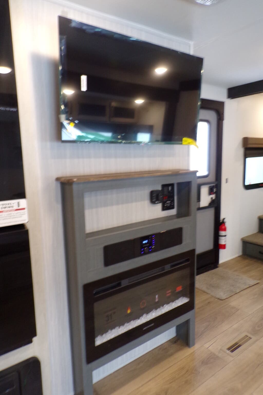 Designed for easy living on the road, this travel trailer integrates a full kitchen with a microwave, oven, and refrigerator, plus a cozy living area highlighted by a fireplace for supplemental warmth on chilly evenings. The one dedicated slide-out helps maximize interior space, creating an open feel for meals, games, and movie nights via the onboard TV and Bluetooth stereo. With a 13,500 BTU ducted air conditioner, you can stay cool in warm climates, while the skylight and roof vent brighten the space with natural light.