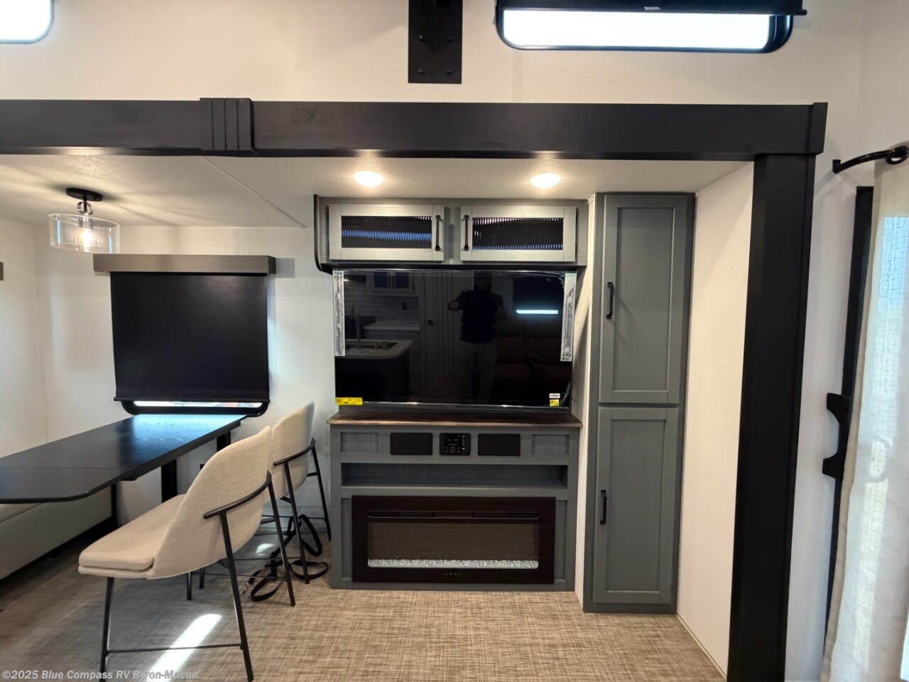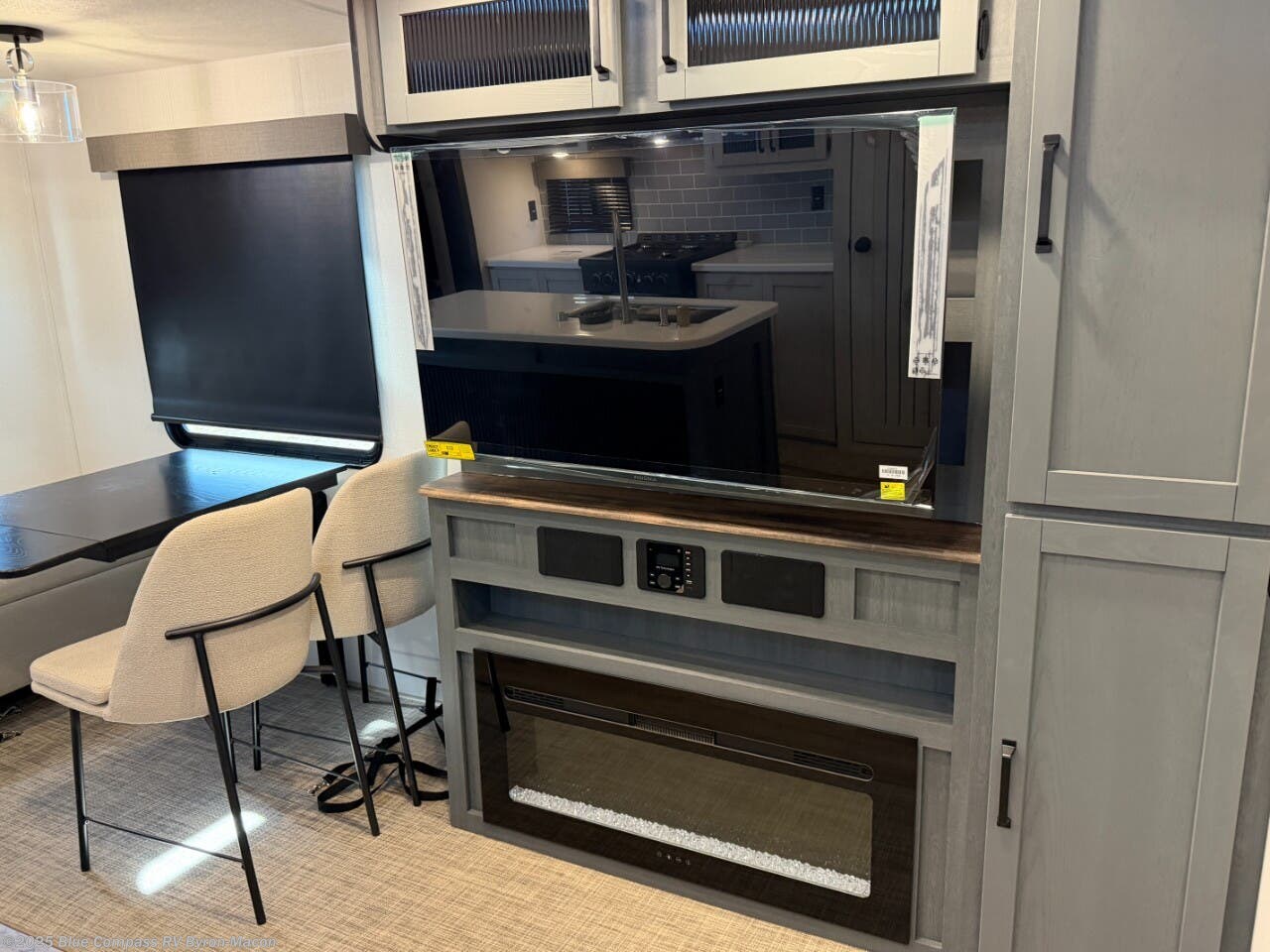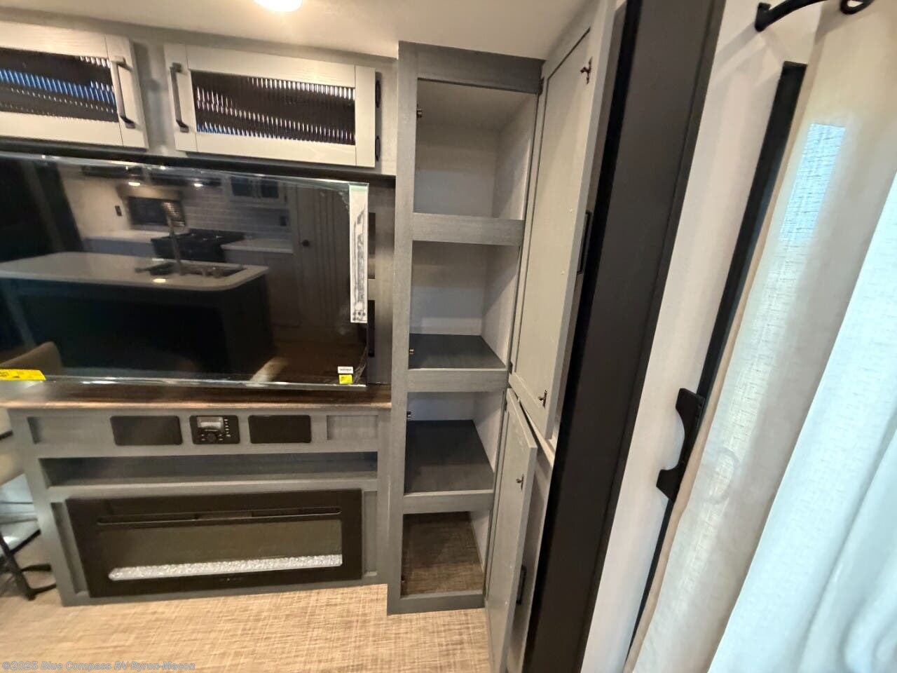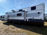 Head to your favorite spots with this destination trailer! With two entry doors, you can easily enter or exit the unit. The front private bedroom includes a king bed slide out, a wardrobe and dresser to keep your clothes organized, plus a countertop for your books or jewelry. Just outside this room is the ladder that leads to the large loft area with two 32" x 80" bunk mats, a cubby, a counter, a nightstand, and cabinets. Once you've headed back downstairs, you can relax on the L-shaped sofa across from the entertainment center with a fireplace and slide-out cabinet or the free-standing table with a bench and two seats. And the chef of your group will love the kitchen with its residential style refrigerator and pantry, kitchen island, and four burner cooktop. The full rear bathroom not only has a 32" x 40" shower with a seat to freshen up in and a closet prepped to add the optional washer and dryer, but is also below the second loft with a 32" x 80" bunk mat and closet for storage!