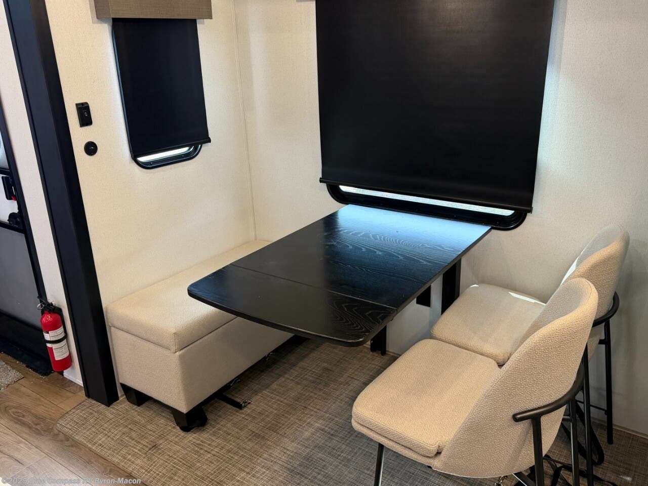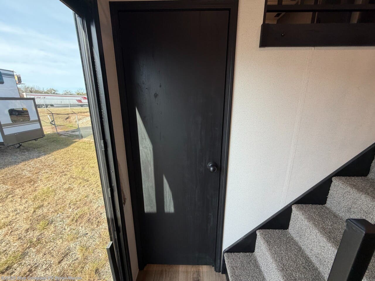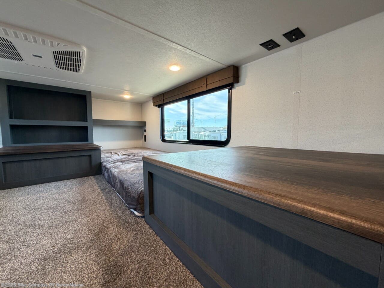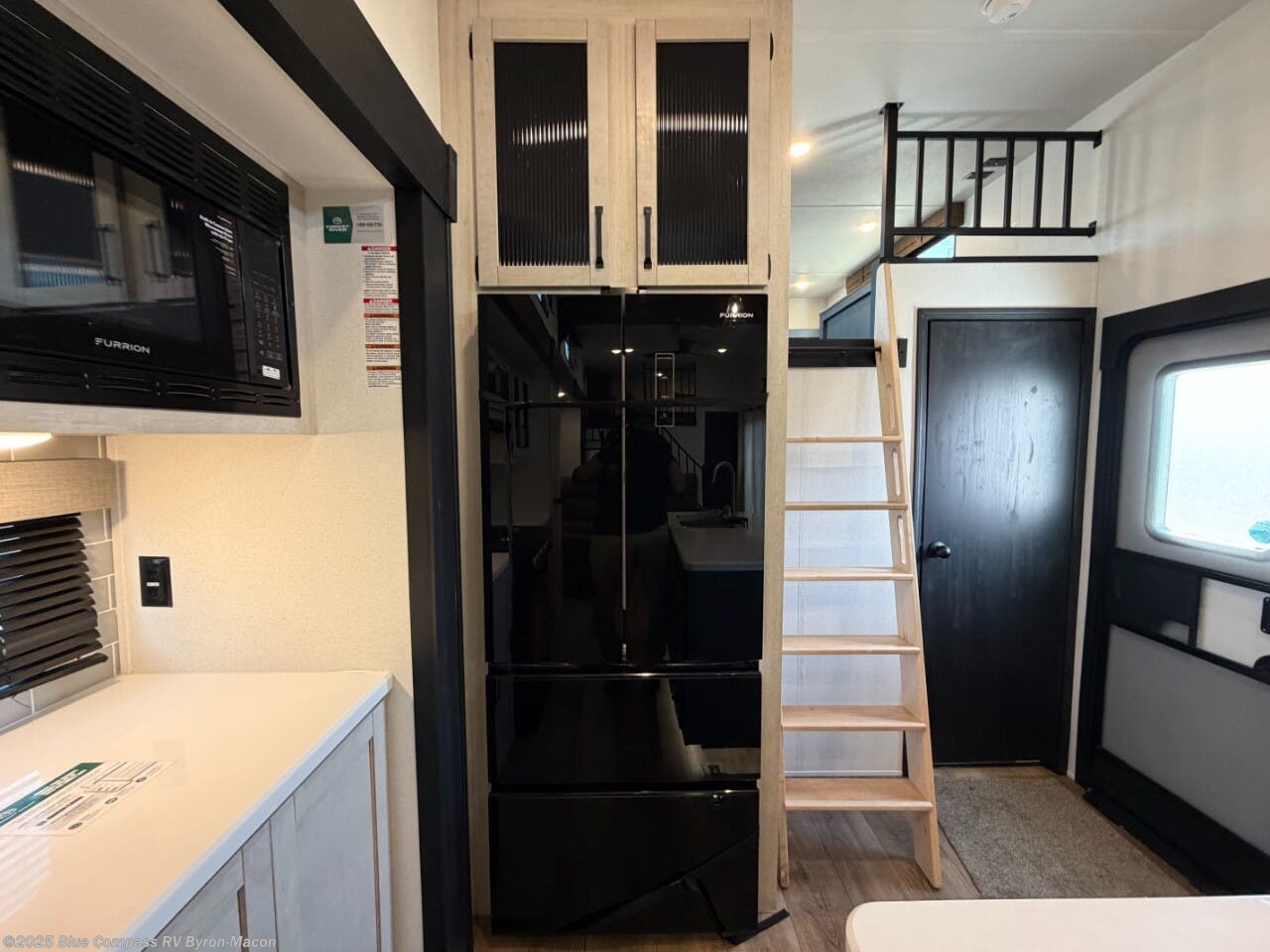 Head to your favorite spots with this destination trailer! With two entry doors, you can easily enter or exit the unit. The front private bedroom includes a king bed slide out, a wardrobe and dresser to keep your clothes organized, plus a countertop for your books or jewelry. Just outside this room is the ladder that leads to the large loft area with two 32" x 80" bunk mats, a cubby, a counter, a nightstand, and cabinets. Once you've headed back downstairs, you can relax on the L-shaped sofa across from the entertainment center with a fireplace and slide-out cabinet or the free-standing table with a bench and two seats. And the chef of your group will love the kitchen with its residential style refrigerator and pantry, kitchen island, and four burner cooktop. The full rear bathroom not only has a 32" x 40" shower with a seat to freshen up in and a closet prepped to add the optional washer and dryer, but is also below the second loft with a 32" x 80" bunk mat and closet for storage!