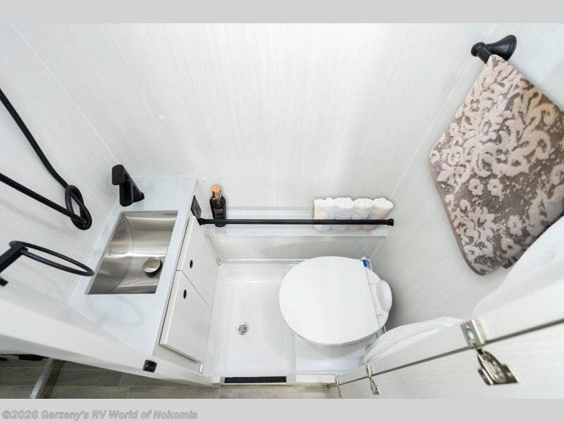 When you step inside this coach, you’re greeted by driver and passenger power swivel seats, each heated and equipped with four-way lumbar support and three-stage heating controls to ensure personalized comfort on every journey. Just to the side, a spacious closet with a hanging rod keeps your wardrobe and travel essentials neatly organized. Nearby, the private enclosed wet bath offers all the comforts of home, featuring a shower with curtain, handheld Matte Black Moen® showerhead, vanity with storage, stainless steel sink, and a towel rack for added convenience. The 3.2 cu. ft. refrigerator/freezer lets you keep your groceries fresh and drinks perfectly chilled, while across the aisle, the fully equipped galley kitchen makes it easy to prepare meals with a one-burner induction cooktop, microwave, and stainless-steel sink. Toward the rear, the living and sleeping area provides a cozy retreat with a 73" x 76" power sofa and two ottomans that easily convert into a queen-size bed, complete with memory foam cushions for ultimate relaxation after a day of adventure.