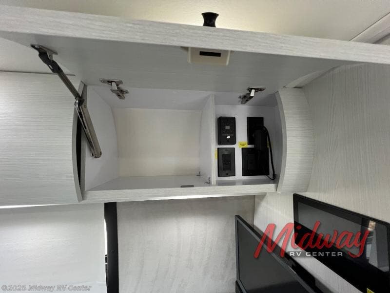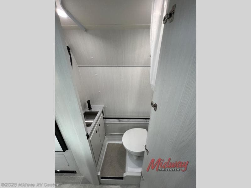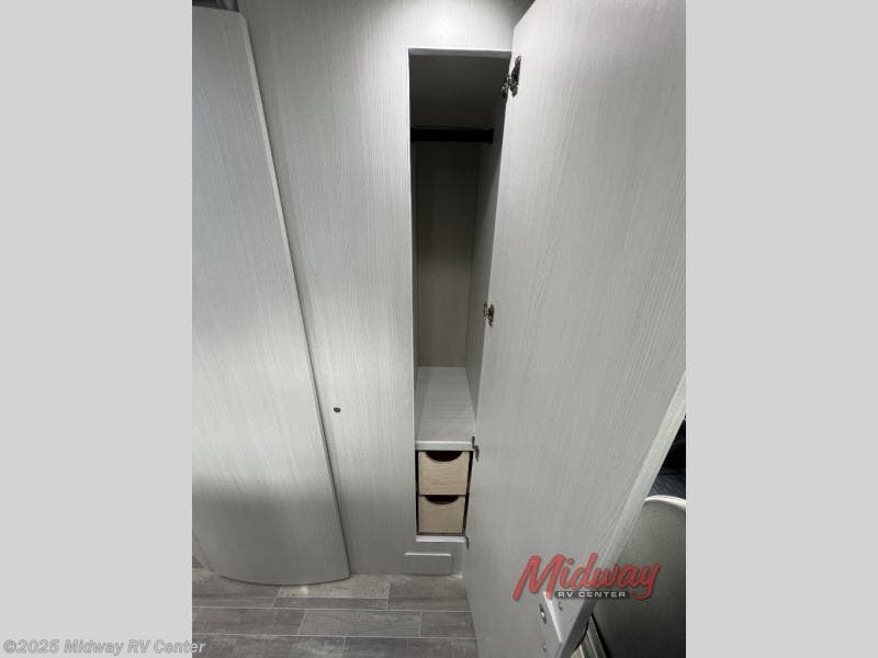 When you step inside this coach, you’re greeted by driver and passenger power swivel seats, each heated and equipped with four-way lumbar support and three-stage heating controls to ensure personalized comfort on every journey. Just to the side, a spacious closet with a hanging rod keeps your wardrobe and travel essentials neatly organized. Nearby, the private enclosed wet bath offers all the comforts of home, featuring a shower with curtain, handheld Matte Black Moen® showerhead, vanity with storage, stainless steel sink, and a towel rack for added convenience. The 3.2 cu. ft. refrigerator/freezer lets you keep your groceries fresh and drinks perfectly chilled, while across the aisle, the fully equipped galley kitchen makes it easy to prepare meals with a one-burner induction cooktop, microwave, and stainless-steel sink. Toward the rear, the living and sleeping area provides a cozy retreat with a 73" x 76" power sofa and two ottomans that easily convert into a queen-size bed, complete with memory foam cushions for ultimate relaxation after a day of adventure.