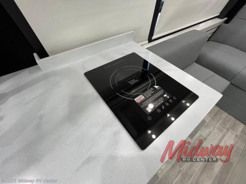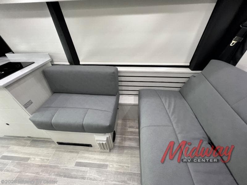 This 2.2 Ontour model is similar to model 2.0, but with a larger refrigerator, and more storage space in the bath. The rear power sofa converts to a 68" x 76" queen-sized bed with memory foam cushions for all-around comfort and the wet bath allows you to clean up each day. There is also a vanity with storage, a sink, and a Corian countertop in the bath for added convenience. Prepare meals either on the one burner induction stove top or in the microwave oven and clean up will be a breeze with a stainless steel sink that includes a high-arc faucet.