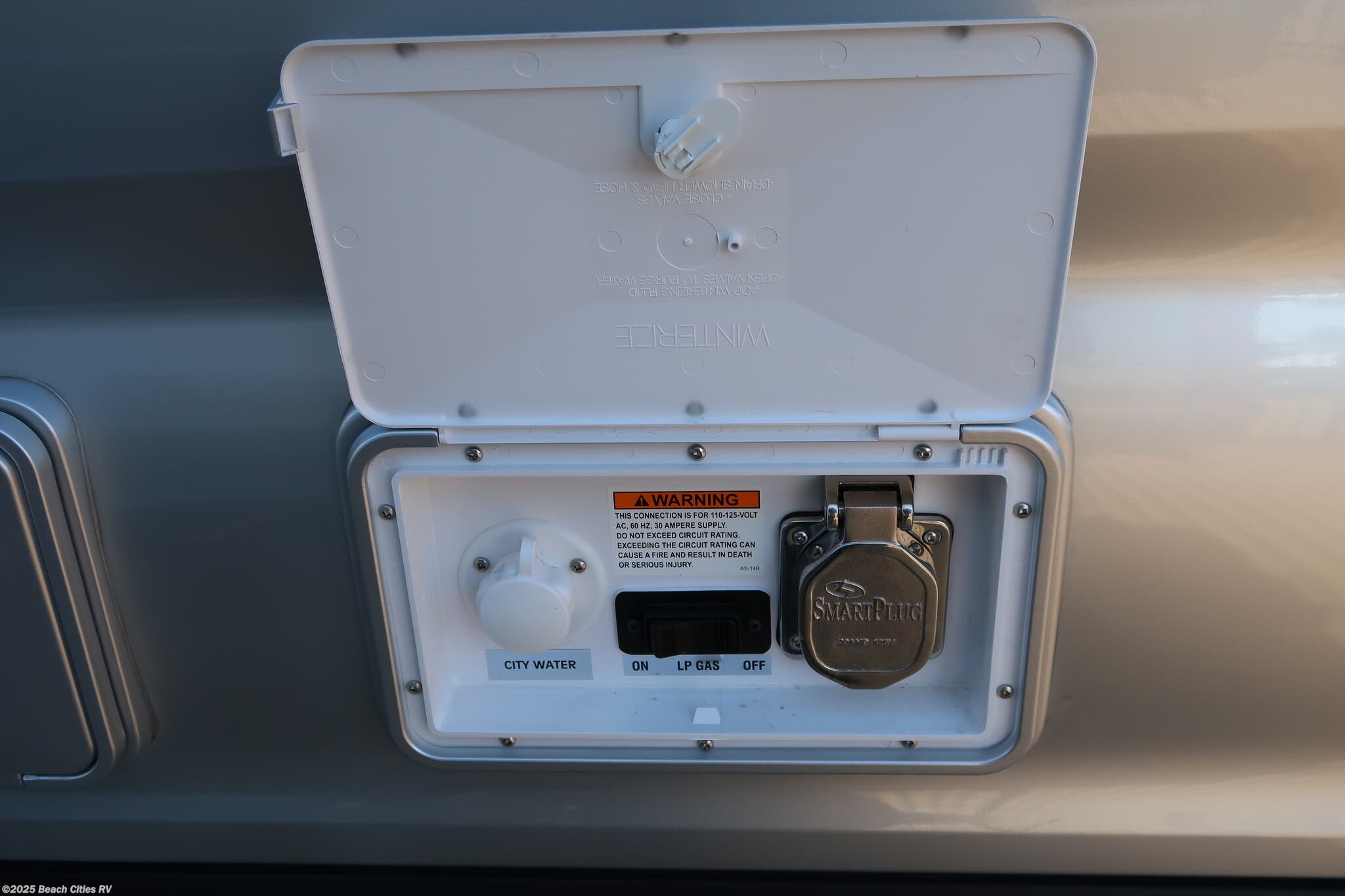 - Utility center (LP switch, 30-amp power outlet, city water connection)