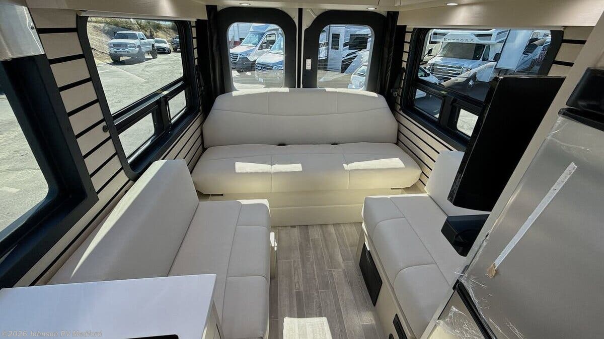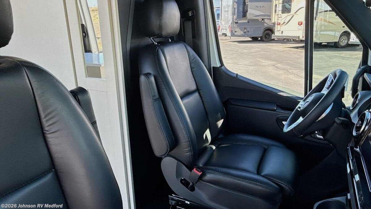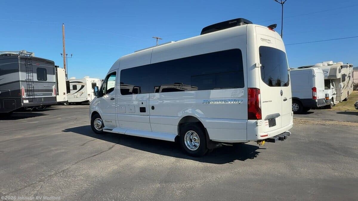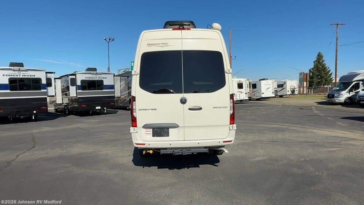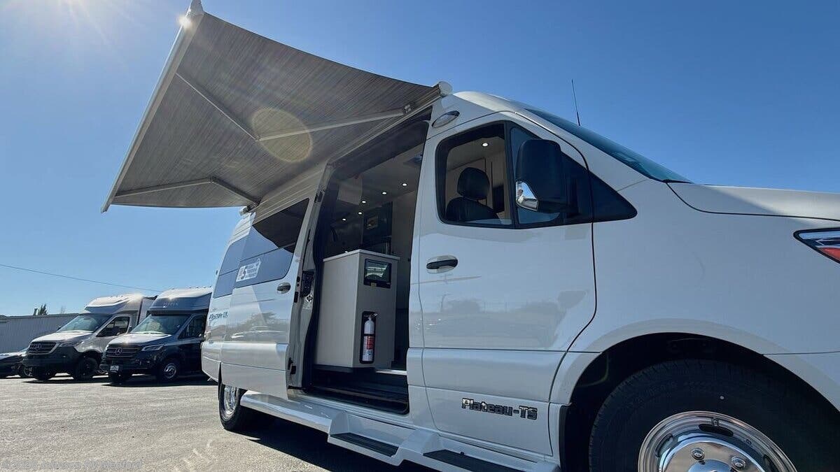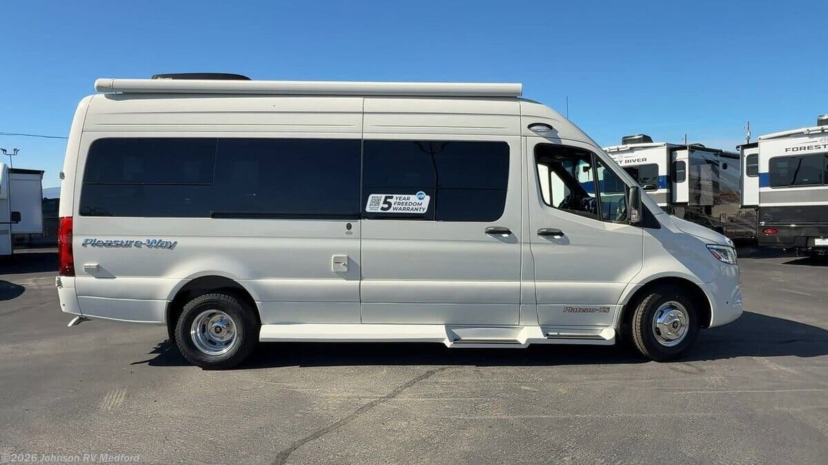 The 2026 Pleasure-Way Plateau TS is a luxurious and versatile Class B recreational vehicle designed for those who seek comfort and convenience on the road. Built on the reliable Mercedes-Benz Sprinter 3500 chassis, this RV combines advanced technology with high-end amenities to provide an exceptional travel experience. Under the hood, the Plateau TS is powered by a 4-cylinder high-output diesel engine, delivering 211 horsepower. It features a 9G-Tronic automatic transmission, ensuring smooth and efficient driving. The vehicle is equipped with a comprehensive braking system, including 4-wheel disc brakes with ABS, and stability and traction control for enhanced safety. Safety and security are paramount in the Plateau TS, with features such as: - Active Brake Assist - Active Distance Assist Distronic - Active Lane Keeping Assist - Adaptive Cruise Control, Distronic Plus - Driver and Passenger Airbags - Attention Assist - Blind Spot Assist - Crosswind Assist - Drive Away Assist - LED Headlamps - Locking Fuel Fill - Tire Repair Kit with Air Compressor and Liquid - Traffic Sign Assist The cab is designed for comfort and functionality, featuring: - MB Leather Power Heated Swivel Seats with four-way lumbar support - Power adjustments and memory settings - Three-stage heating controls - MBUX Multimedia System with a 10-inch touchscreen - Navigation and Bluetooth connectivity with audio streaming - "Hey Mercedes" voice control - Smartphone integration with hands-free function - Wireless charging tray - Keyless ignition - Rearview camera system - Air conditioning - Power windows, door locks, and mirrors - Tilt/telescopic steering wheel - Overhead control panel with reading lights Entertainment options include: - Rear 24-inch Smart LED TV with a swing-out mount - Bose soundbar with Bluetooth - Winegard Rayzar Automatic HDTV antenna - Cable TV hookup - USB-A and USB-C charging ports The interior is thoughtfully designed with: - Inflatable air bed fitted for the cab - Blackout roller shades with magnetic catch - Folding privacy/sun shades for windshield and cab door windows - Radius laminate cabinet doors with hidden push-to-open latches - Recessed LED lighting under cabinets and along the roof - Full-size wardrobe with a hanging rod - Laminate-wrapped kitchen, wall partitions, and cabinet boxes - Vinyl soft-touch headliner and flooring - Microfiber suede upholstery on rear walls - 3M Thinsulate insulation inside walls - Foil-faced fiberglass insulation along the roof - Fire extinguisher and LP, CO smoke detectors The galley is equipped with: - 12V, 2-door, 8.2 cu. ft. refrigerator/freezer - 1-burner induction stove - Microwave/convection oven - Large undermount stainless steel sink with Corian cover - High-arc, single-handle faucet with pull-out sprayer - Corian solid surface countertop - Full extension ball bearing drawer glides with soft close The bathroom offers: - Private enclosed wet bath with shower - Shower curtain and handheld showerhead - Medicine cabinet with mirror - Vanity with storage - Stainless steel sink - Corian countertop - Residential-style ceramic bowl toilet with foot flush - Towel rack - 110-120 volt GFCI power outlet Electrical and control systems include: - Dual 10-inch touchscreen control panels - 600Ah Eco-Ion Earth Smart Lithium coach batteries - Internal/automatic coach battery heating system - Xantrex Freedom XC Pro 3000-Watt True Sine Wave Inverter/Charger - Available 300-Watt Go Power! solar package - 2.5 KW Onan QG 2500i LP generator with automatic start - Multiplex wiring and dimmable LED lighting - 30-amp power cord and AC distribution panel The exterior features: - Fiamma power awning with LED lights - LED porch light - Awning style frameless windows - Exterior shower with handheld wand - Fiberglass running boards with integrated entrance steps Heating, ventilation, and cooling systems include: - Truma VarioHeat 11,500 BTU Furnace - Power lift Dometic Fan-Tastic Vent fan with rain sensor - Truma Aventa Eco 13,500 BTU air conditioner The rear seating area is designed for relaxation and versatility, featuring: - Lagun table mount system with 360-degree swivel tabletop - Power sofa with two three-point seat belts - Memory foam sofa cushions - Ultraleather fabric The 2026 Pleasure-Way Plateau TS is a perfect blend of luxury, technology, and practicality, making it an ideal choice for those who love to explore the open road with all the comforts of home. ???