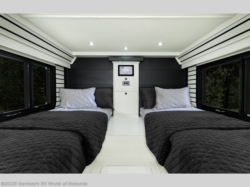 Travel in complete comfort in this coach! Since there are two 32" x 74" raised beds in the back, you can enjoy your own space at night, plus there is storage below the beds to keep your things tidy. A large wet bath includes a handheld showerhead, Corian countertop and backsplash, an awning style opening window, plus more comforts. You can prepare your best meals on the one burner induction cooktop or in the microwave oven, and there is a 5.3 cu. ft. Norcold 12V refrigerator/freezer to keep your food fresh. The lounge dinette up front includes a lagun table that can also be utilized when sitting in the swivel chairs in the cab!