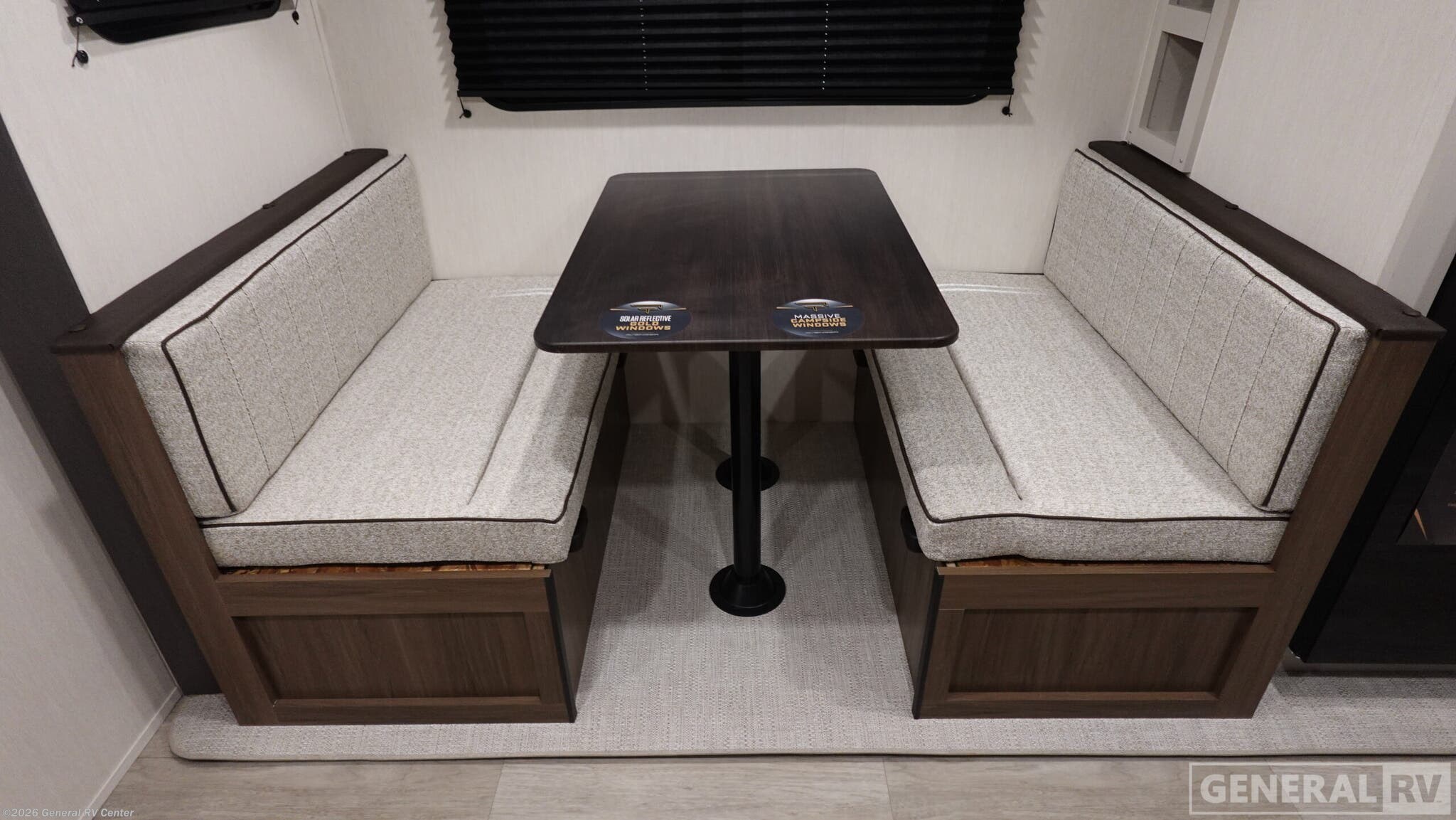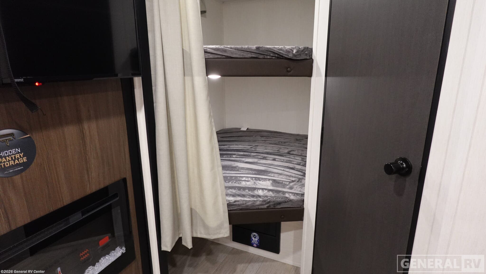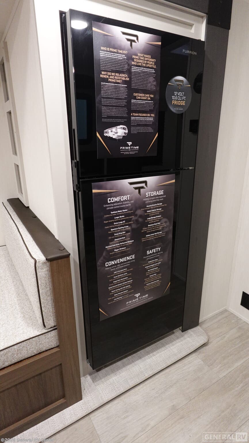 Prime Time Avenger travel trailer 23BHS highlights: Booth Dinette Slide TV and Fireplace Oversized Window Double-Size Bunks Outdoor Storage You'll appreciate the added sleeping space in this unit with double-size bunks! You'll have your own space up front in the private bedroom, complete with a camp king bed and storage for your things, and if you need even more sleeping space, the dinette can be used as well. The chef of your group will find a three-burner cooktop and a built-in convection microwave with an air fryer to cook meals, plus there is a 12V refrigerator and large hidden pantry for food storage. This unit also includes a power awning outdoors and an outside refrigerator to keep cold drinks close by. With any Avenger travel trailer by Prime Time RV, you will find innovation, a solid build, and comfort at every turn. Each model is built with Tuff Coat on the exterior metal, a fully enclosed underbelly, and a PVC roof membrane to help extend the life of your trailer. You will also find automotive name badging on the exterior, along with an exterior shower, front rail LED light strips, plus an XL padded entry grab handle to name a few conveniences. There are plenty of storage spaces inside, as well as Congoleum flooring and woven PVC marine grade slide out flooring, a designer shower surround, and seamless pressed countertops. You are sure to appreciate the onboard water filtration system, tankless water heater, plus 30K BTU furnace and 15K ducted A/C to help keep you comfortable.