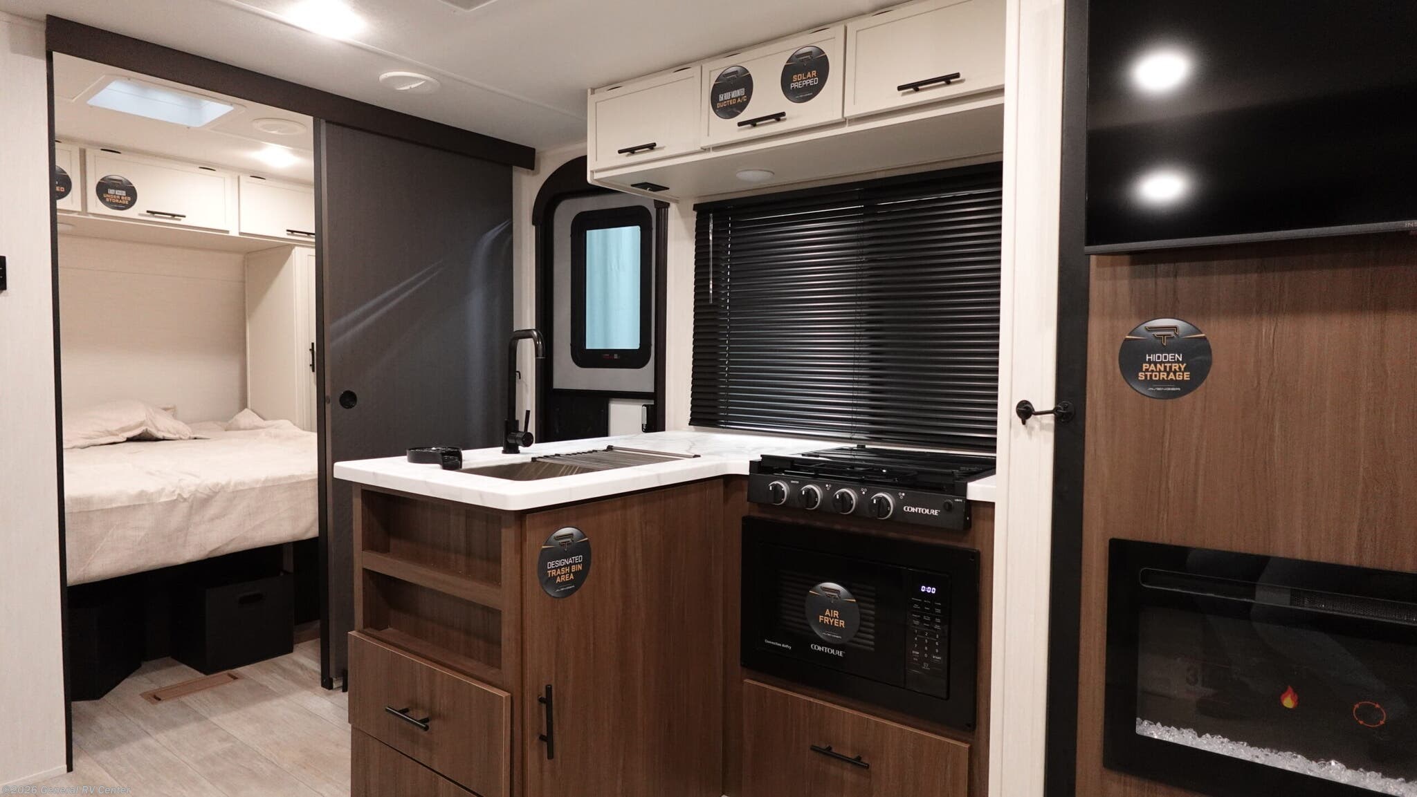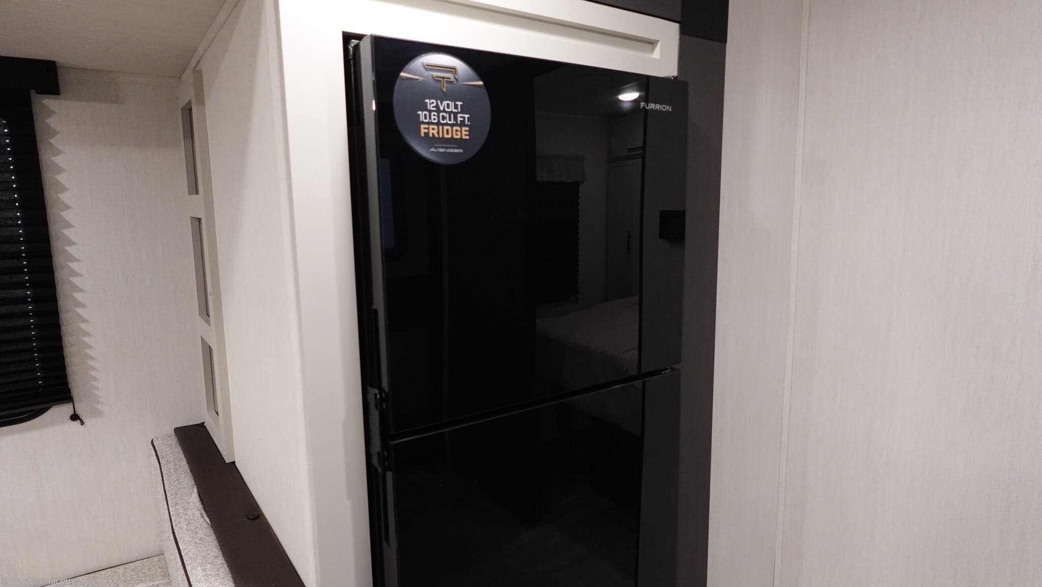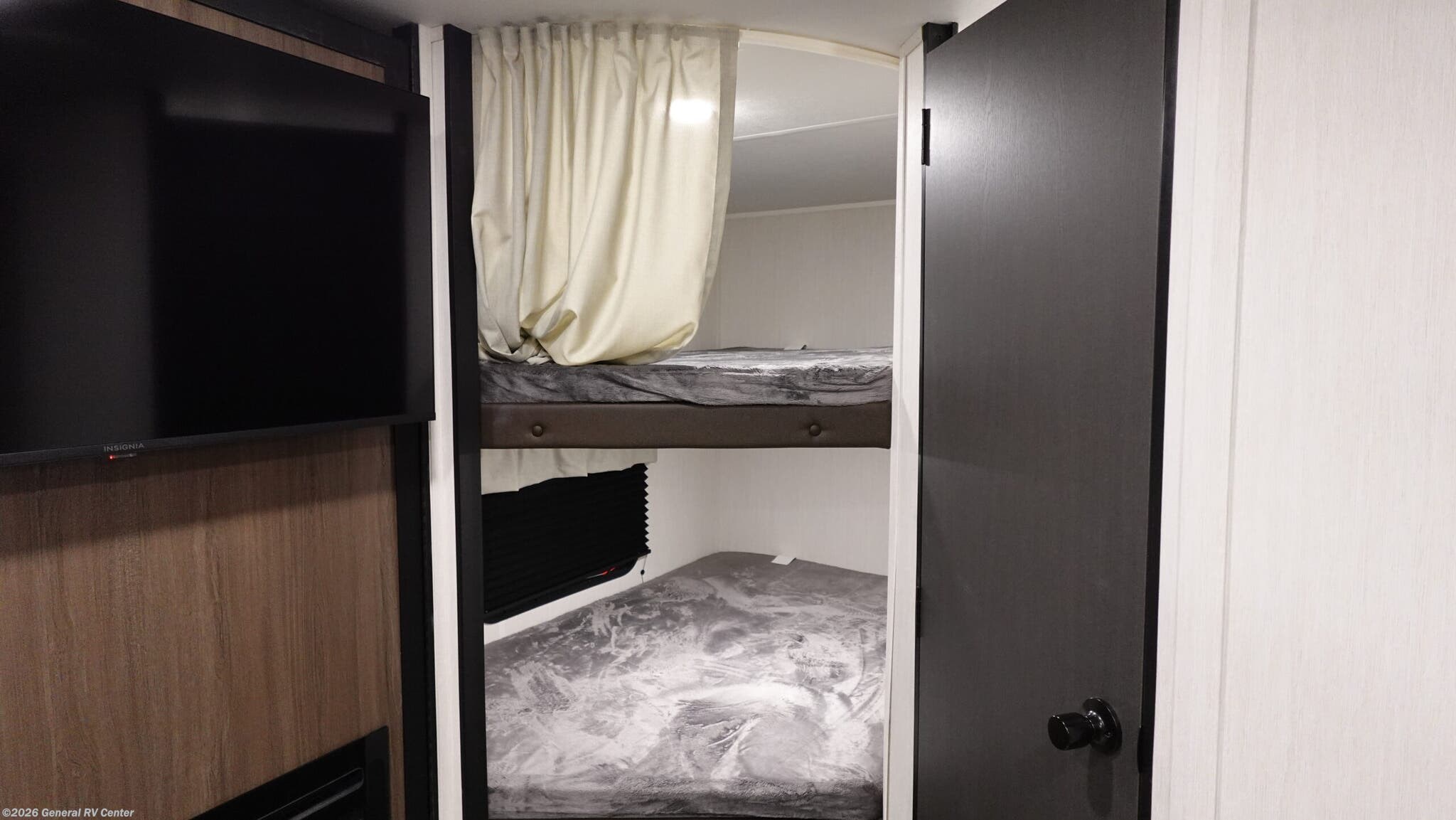 Prime Time Avenger travel trailer 23BHS highlights: Booth Dinette Slide TV and Fireplace Oversized Window Double-Size Bunks Outdoor Storage You'll appreciate the added sleeping space in this unit with double-size bunks! You'll have your own space up front in the private bedroom, complete with a camp king bed and storage for your things, and if you need even more sleeping space, the dinette can be used as well. The chef of your group will find a three-burner cooktop and a built-in convection microwave with an air fryer to cook meals, plus there is a 12V refrigerator and large hidden pantry for food storage. This unit also includes a power awning outdoors and an outside refrigerator to keep cold drinks close by. With any Avenger travel trailer by Prime Time RV, you will find innovation, a solid build, and comfort at every turn. Each model is built with Tuff Coat on the exterior metal, a fully enclosed underbelly, and a PVC roof membrane to help extend the life of your trailer. You will also find automotive name badging on the exterior, along with an exterior shower, front rail LED light strips, plus an XL padded entry grab handle to name a few conveniences. There are plenty of storage spaces inside, as well as Congoleum flooring and woven PVC marine grade slide out flooring, a designer shower surround, and seamless pressed countertops. You are sure to appreciate the onboard water filtration system, tankless water heater, plus 30K BTU furnace and 15K ducted A/C to help keep you comfortable.