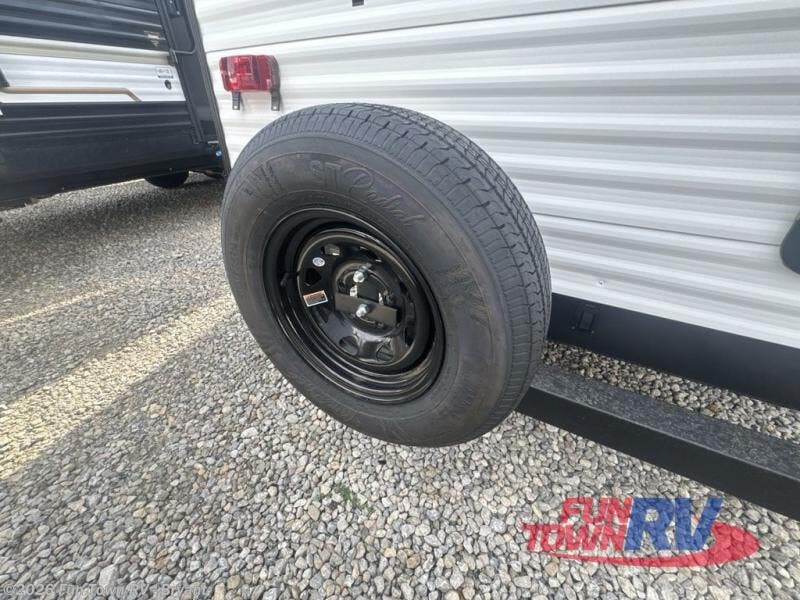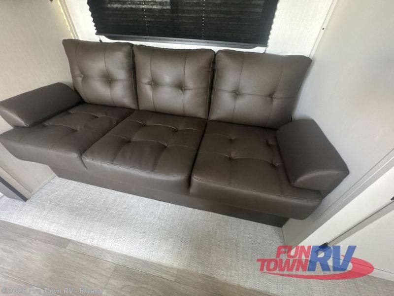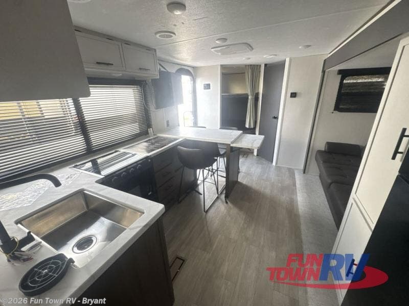 Head to your local state park in this spacious travel trailer! You'll love the oversized windows to let more natural light in, and the sofa slide out will provide more interior space. An L-shaped counter with stools provides a place to enjoy your morning coffee at, or you may find yourselves on the sofa within the slide out. The 12V refrigerator and pantry can hold all your food for the week. You'll feel right at home in the front private bedroom that includes a camp king bed, dual wardrobes, and an overhead cabinet for even more storage, while your guests take the double-size bunks in the back!