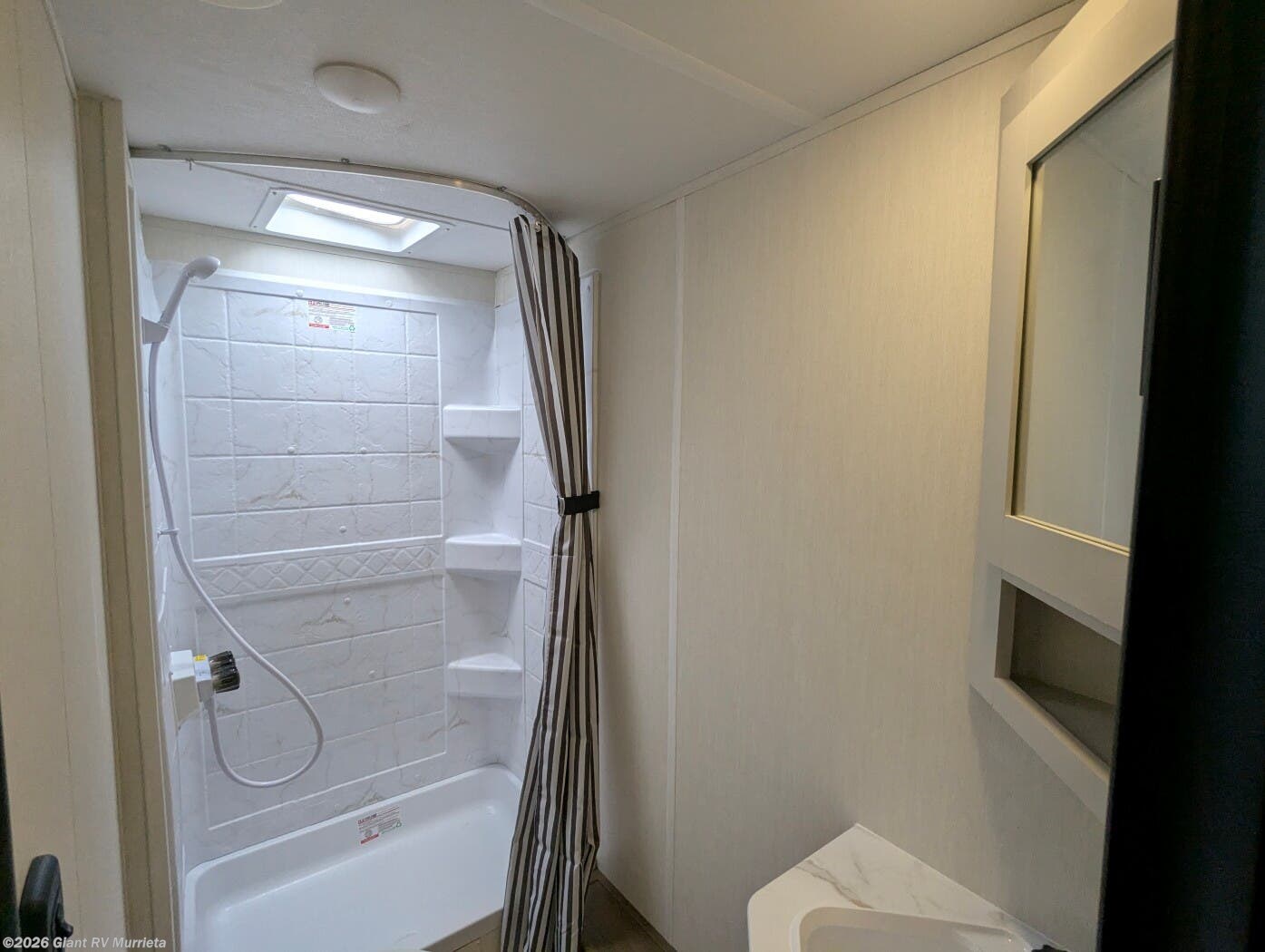 - Spacious Rear Bathroom: Features a full bath with a radius shower, skylight, and vanity, ensuring privacy in this Avenger 25MKO model.
