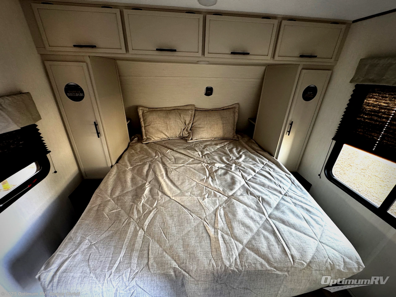 You'll appreciate the added space in this travel trailer thanks to the large slide out! The booth dinette and sofa are found here, and there is a moveable storage ottoman for extra blankets or board games. You'll have your own space up front in the private bedroom, complete with a camp king bed and storage for your things. The chef of your group will find a three burner cooktop and a built-in convection microwave with an air fryer to cook meals, plus there is a 12V refrigerator and hidden pantry for food storage. This unit also includes a power awning outdoors and an outside refrigerator to keep cold drinks close by.