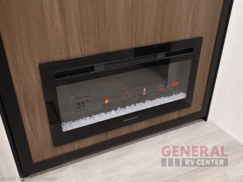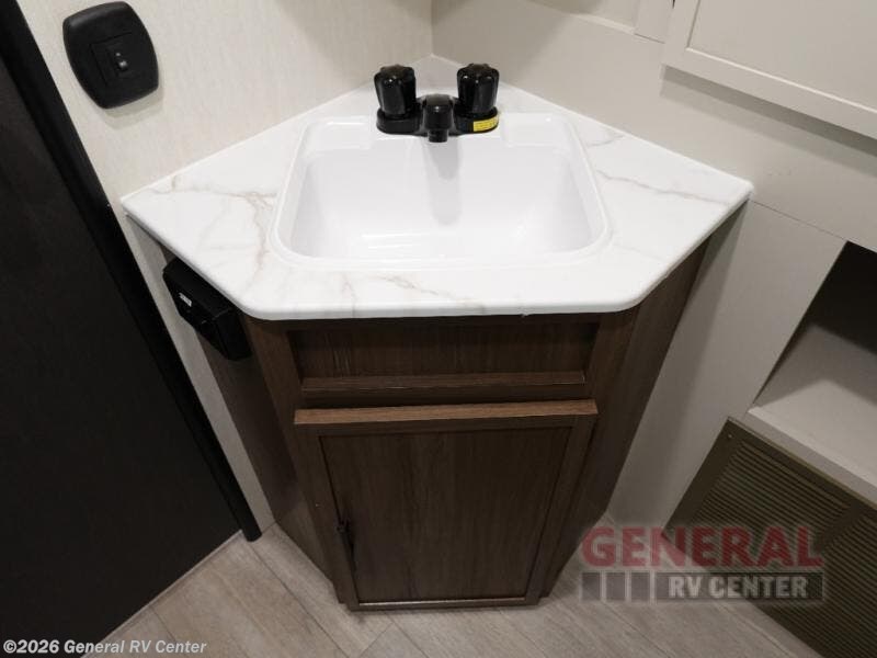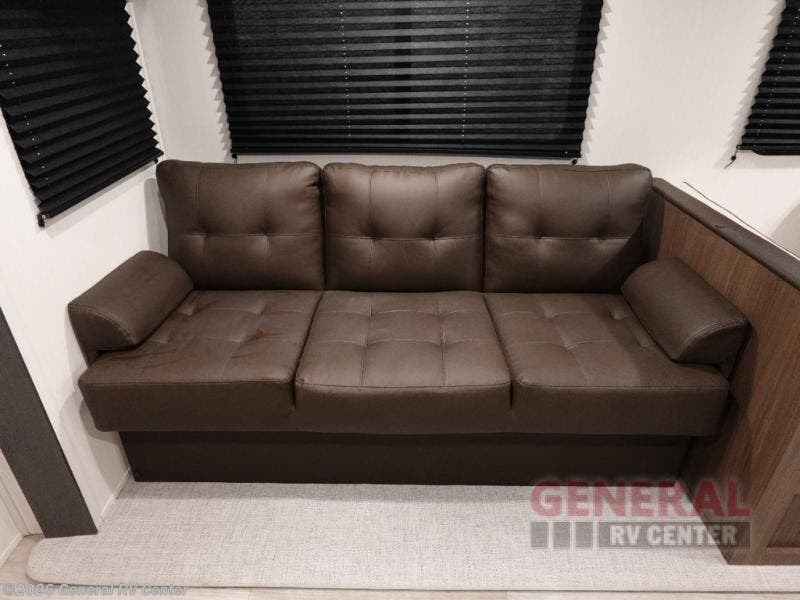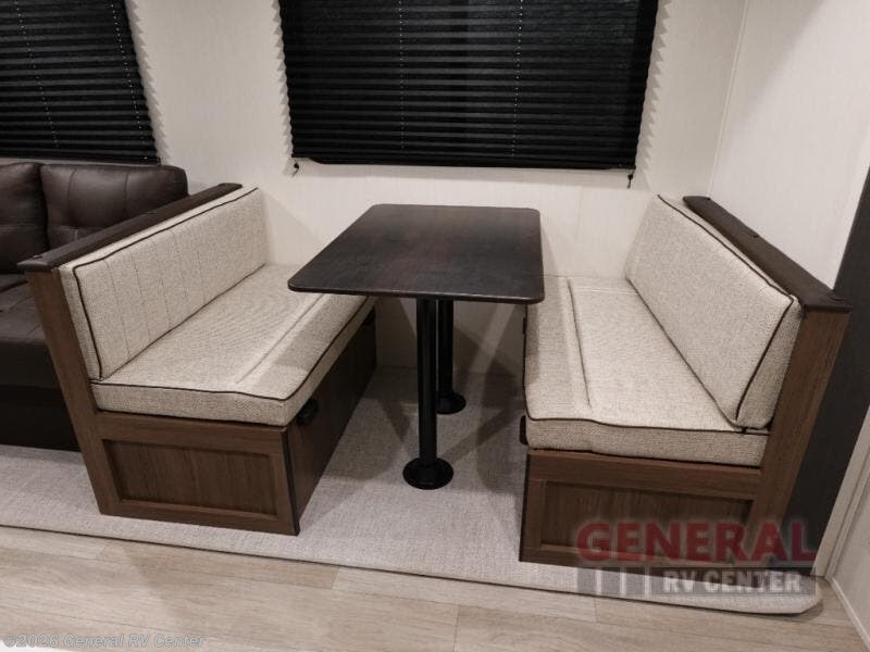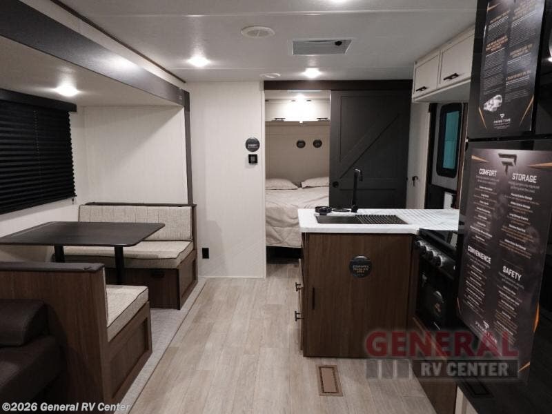 You'll appreciate the added space in this travel trailer thanks to the large slide out! The booth dinette and sofa are found here, and there is a moveable storage ottoman for extra blankets or board games. You'll have your own space up front in the private bedroom, complete with a camp king bed and storage for your things. The chef of your group will find a three burner cooktop and a built-in convection microwave with an air fryer to cook meals, plus there is a 12V refrigerator and hidden pantry for food storage. This unit also includes a power awning outdoors and an outside refrigerator to keep cold drinks close by.