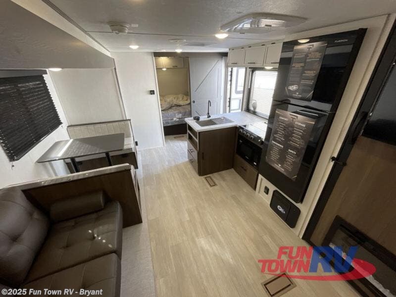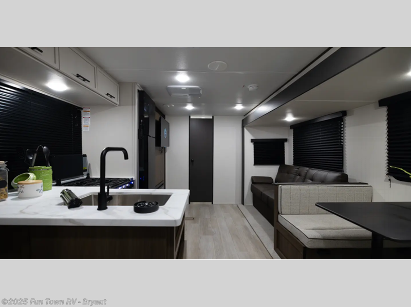 You'll appreciate the added space in this travel trailer thanks to the large slide out! The booth dinette and sofa are found here, and there is a moveable storage ottoman for extra blankets or board games. You'll have your own space up front in the private bedroom, complete with a camp king bed and storage for your things. The chef of your group will find a three burner cooktop and a built-in convection microwave with an air fryer to cook meals, plus there is a 12V refrigerator and hidden pantry for food storage. This unit also includes a power awning outdoors and an outside refrigerator to keep cold drinks close by.