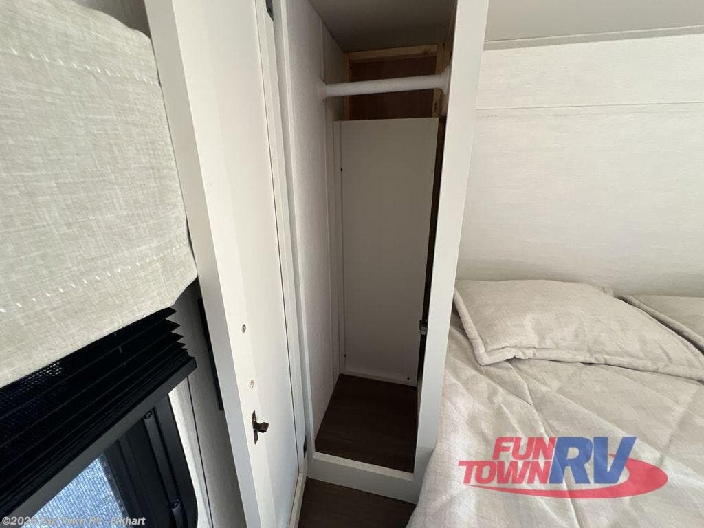 You'll appreciate the added space in this travel trailer thanks to the large slide out! The booth dinette and sofa are found here, and there is a moveable storage ottoman for extra blankets or board games. You'll have your own space up front in the private bedroom, complete with a camp king bed and storage for your things. The chef of your group will find a three burner cooktop and a built-in convection microwave with an air fryer to cook meals, plus there is a 12V refrigerator and hidden pantry for food storage. This unit also includes a power awning outdoors and an outside refrigerator to keep cold drinks close by.