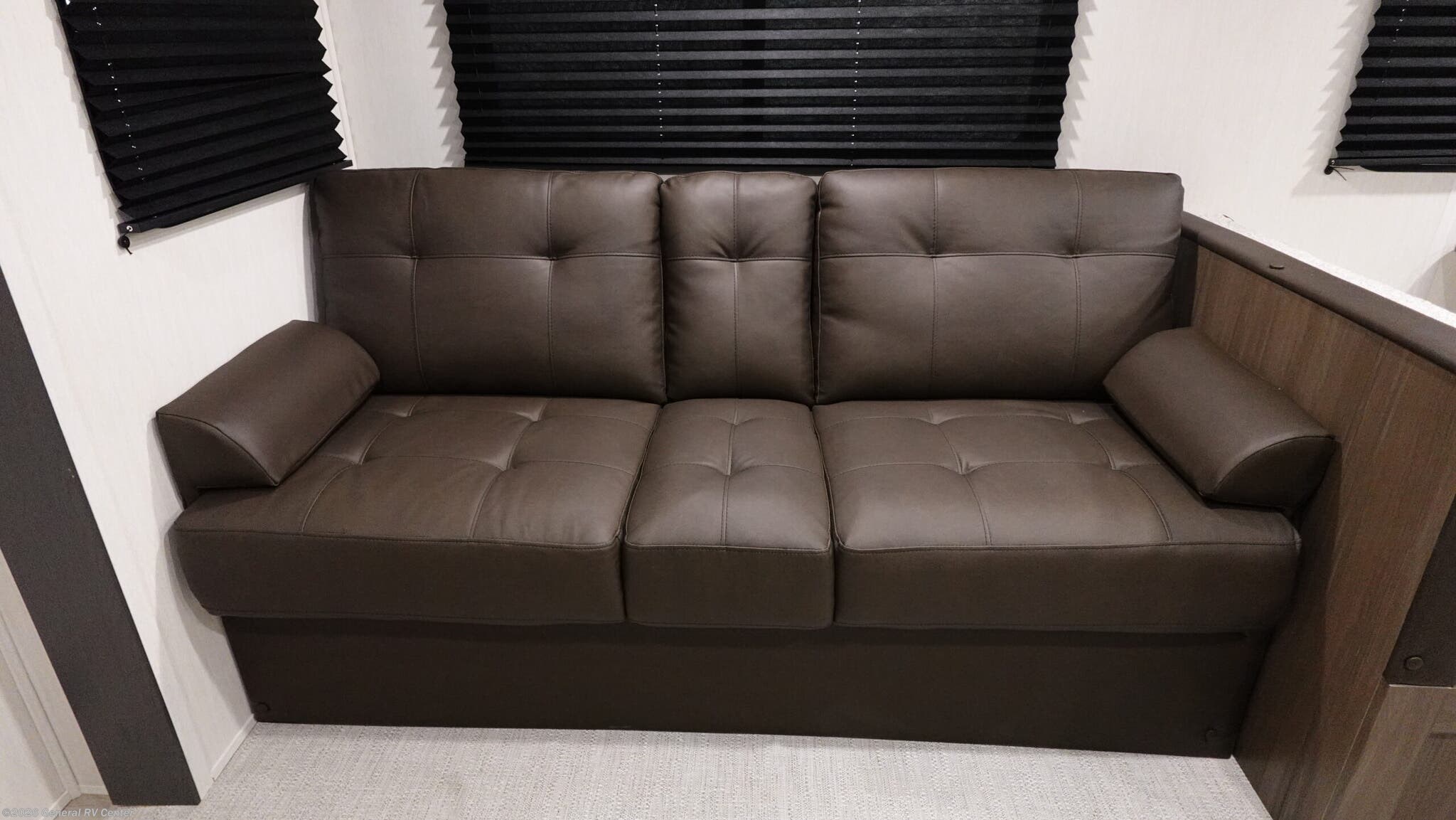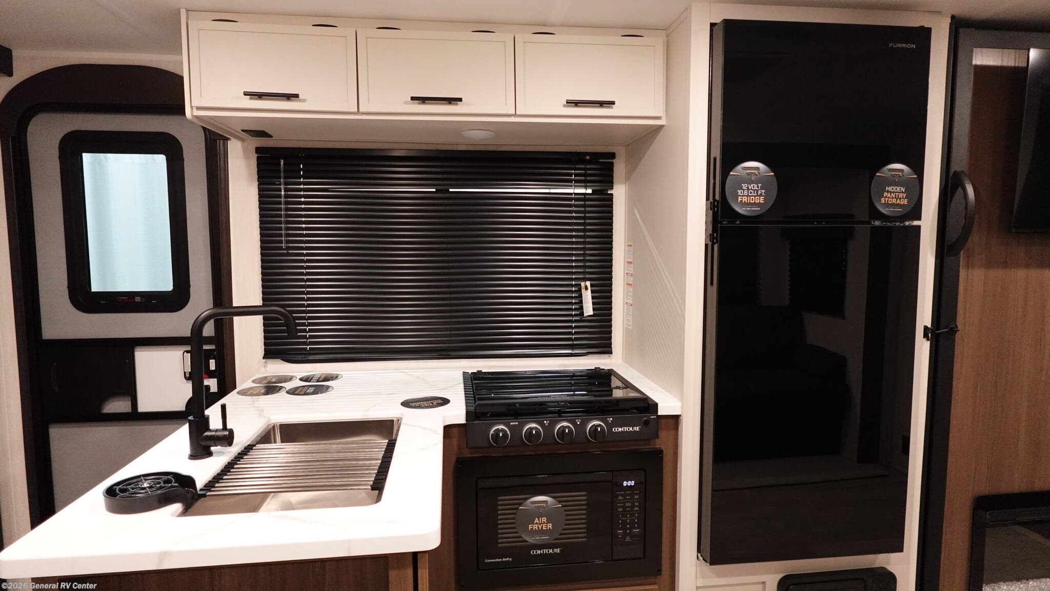 Prime Time Avenger travel trailer 25RBS highlights: Large Slide Out TV and Fireplace Oversized Window Full Rear Bath You'll appreciate the added space in this travel trailer thanks to the large slide out! The booth dinette and sofa are found here, and there is a moveable storage ottoman for extra blankets or board games. You'll have your own space up front in the private bedroom, complete with a camp king bed and storage for your things. The chef of your group will find a three burner cooktop and a built-in convection microwave with an air fryer to cook meals, plus there is a 12V refrigerator and hidden pantry for food storage. This unit also includes a power awning outdoors and an outside refrigerator to keep cold drinks close by. With any Avenger travel trailer by Prime Time RV, you will find innovation, a solid build, and comfort at every turn. Each model is built with Tuff Coat on the exterior metal, a fully enclosed underbelly, and a PVC roof membrane to help extend the life of your trailer. You will also find automotive name badging on the exterior, along with an exterior shower, front rail LED light strips, plus an XL padded entry grab handle to name a few conveniences. There are plenty of storage spaces inside, as well as Congoleum flooring and woven PVC marine grade slide out flooring, a designer shower surround, and seamless pressed countertops. You are sure to appreciate the onboard water filtration system, tankless water heater, plus 30K BTU furnace and 15K ducted A/C to help keep you comfortable.