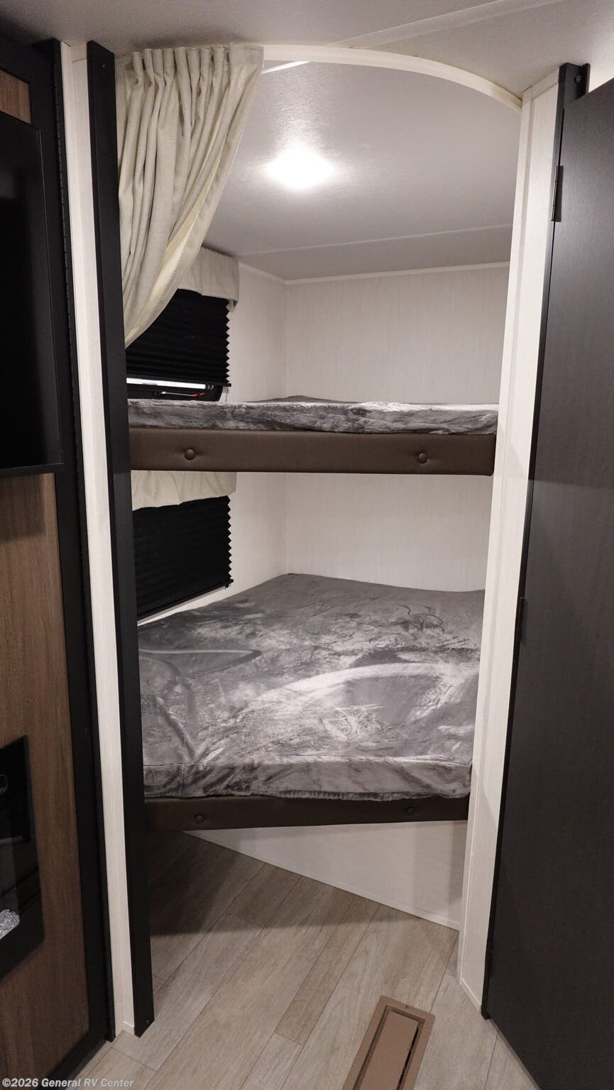 **Prime Time Avenger travel trailer 26DBS highlights:** - Large Slide Out - TV and Fireplace - Oversized Window - Double-Size Bunks You'll appreciate the added space in this travel trailer thanks to the large slide out! The booth dinette and sofa are found here, and there is a moveable storage ottoman for extra blankets or board games. You'll have your own space up front in the private bedroom, complete with a camp king bed and storage for your things, while your guests take the double-size bunk beds towards the back. The chef of your group will find a three burner cooktop and a built-in convection microwave with an air fryer to cook meals, plus there is a 12V refrigerator and large hidden pantry for food storage. This unit also includes a power awning outdoors and an outside refrigerator to keep cold drinks close by. With any Avenger travel trailer by Prime Time RV, you will find innovation, a solid build, and comfort at every turn. Each model is built with Tuff Coat on the exterior metal, a fully enclosed underbelly, and a PVC roof membrane to help extend the life of your trailer. You will also find automotive name badging on the exterior, along with an exterior shower, front rail LED light strips, plus an XL padded entry grab handle to name a few conveniences. There are plenty of storage spaces inside, as well as Congoleum flooring and woven PVC marine grade slide out flooring, a designer shower surround, and seamless pressed countertops. You are sure to appreciate the onboard water filtration system, tankless water heater, plus 30K BTU furnace and 15K ducted A/C to help keep you comfortable.