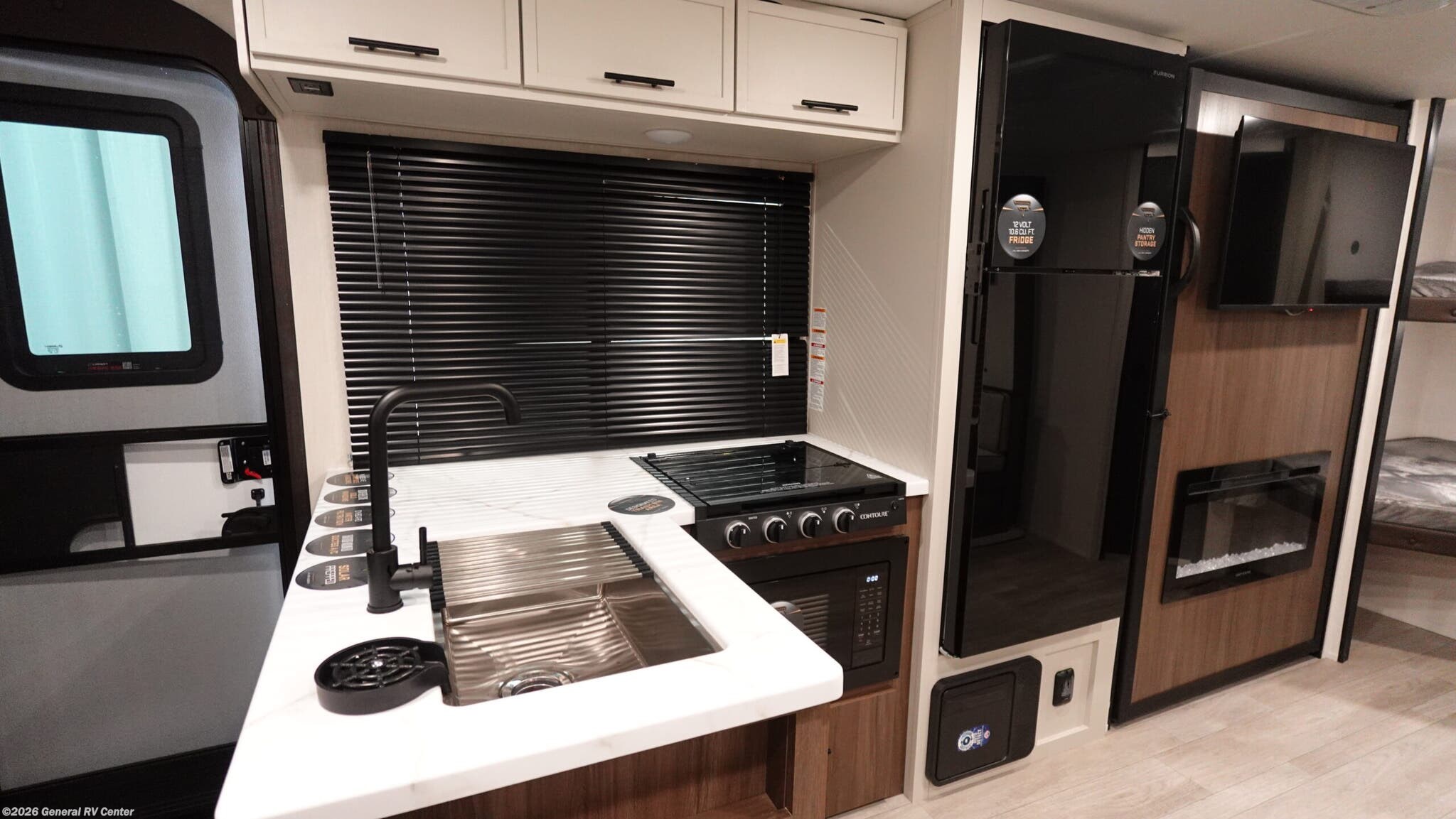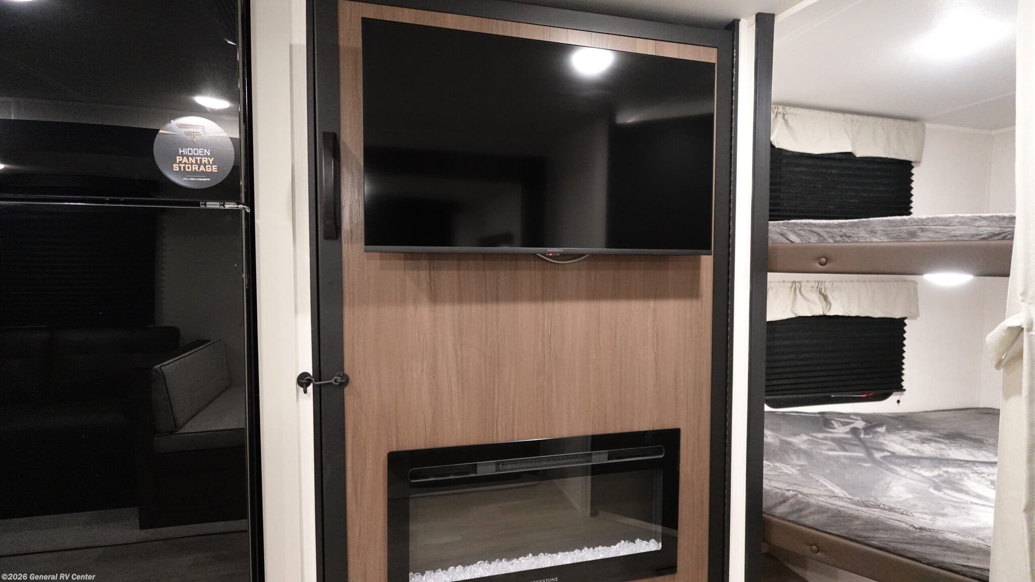 **Prime Time Avenger travel trailer 26DBS highlights:** - Large Slide Out - TV and Fireplace - Oversized Window - Double-Size Bunks You'll appreciate the added space in this travel trailer thanks to the large slide out! The booth dinette and sofa are found here, and there is a moveable storage ottoman for extra blankets or board games. You'll have your own space up front in the private bedroom, complete with a camp king bed and storage for your things, while your guests take the double-size bunk beds towards the back. The chef of your group will find a three burner cooktop and a built-in convection microwave with an air fryer to cook meals, plus there is a 12V refrigerator and large hidden pantry for food storage. This unit also includes a power awning outdoors and an outside refrigerator to keep cold drinks close by. With any Avenger travel trailer by Prime Time RV, you will find innovation, a solid build, and comfort at every turn. Each model is built with Tuff Coat on the exterior metal, a fully enclosed underbelly, and a PVC roof membrane to help extend the life of your trailer. You will also find automotive name badging on the exterior, along with an exterior shower, front rail LED light strips, plus an XL padded entry grab handle to name a few conveniences. There are plenty of storage spaces inside, as well as Congoleum flooring and woven PVC marine grade slide out flooring, a designer shower surround, and seamless pressed countertops. You are sure to appreciate the onboard water filtration system, tankless water heater, plus 30K BTU furnace and 15K ducted A/C to help keep you comfortable.