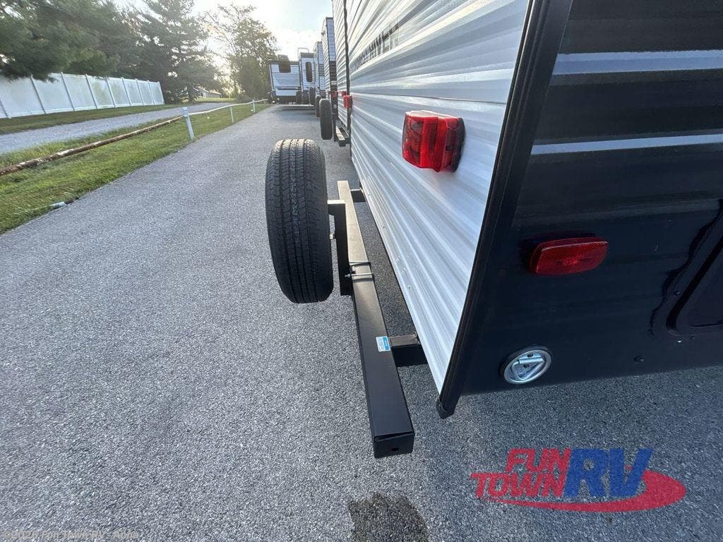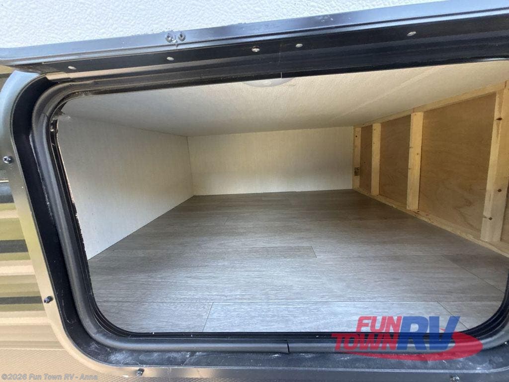 You'll appreciate the added space in this travel trailer thanks to the large slide out! The booth dinette and sofa are found here, and there is a moveable storage ottoman for extra blankets or board games. You'll have your own space up front in the private bedroom, complete with a camp king bed and storage for your things, while your guests take the double-size bunk beds towards the back. The chef of your group will find a three burner cooktop and a built-in convection microwave with an air fryer to cook meals, plus there is a 12V refrigerator and large hidden pantry for food storage. This unit also includes a power awning outdoors and an outside refrigerator to keep cold drinks close by.