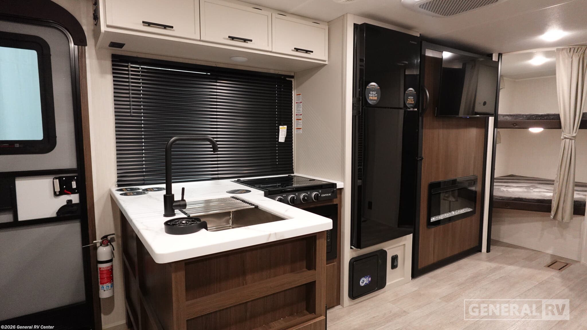 **Prime Time Avenger travel trailer 26DBS highlights:** - Large Slide Out - TV and Fireplace - Oversized Window - Double-Size Bunks You'll appreciate the added space in this travel trailer thanks to the large slide out! The booth dinette and sofa are found here, and there is a moveable storage ottoman for extra blankets or board games. You'll have your own space up front in the private bedroom, complete with a camp king bed and storage for your things, while your guests take the double-size bunk beds towards the back. The chef of your group will find a three burner cooktop and a built-in convection microwave with an air fryer to cook meals, plus there is a 12V refrigerator and large hidden pantry for food storage. This unit also includes a power awning outdoors and an outside refrigerator to keep cold drinks close by. With any Avenger travel trailer by Prime Time RV, you will find innovation, a solid build, and comfort at every turn. Each model is built with Tuff Coat on the exterior metal, a fully enclosed underbelly, and a PVC roof membrane to help extend the life of your trailer. You will also find automotive name badging on the exterior, along with an exterior shower, front rail LED light strips, plus an XL padded entry grab handle to name a few conveniences. There are plenty of storage spaces inside, as well as Congoleum flooring and woven PVC marine grade slide out flooring, a designer shower surround, and seamless pressed countertops. You are sure to appreciate the onboard water filtration system, tankless water heater, plus 30K BTU furnace and 15K ducted A/C to help keep you comfortable.