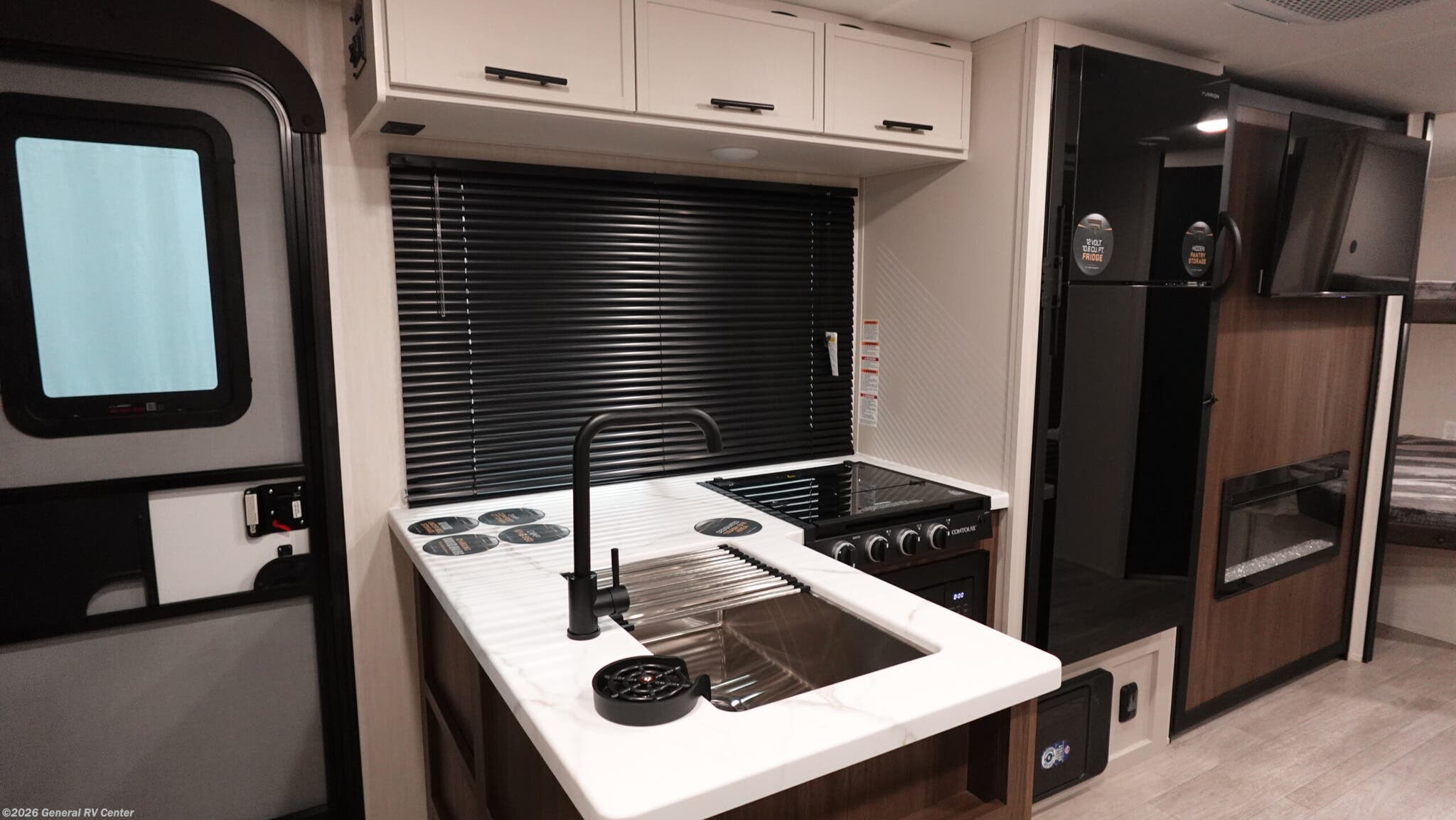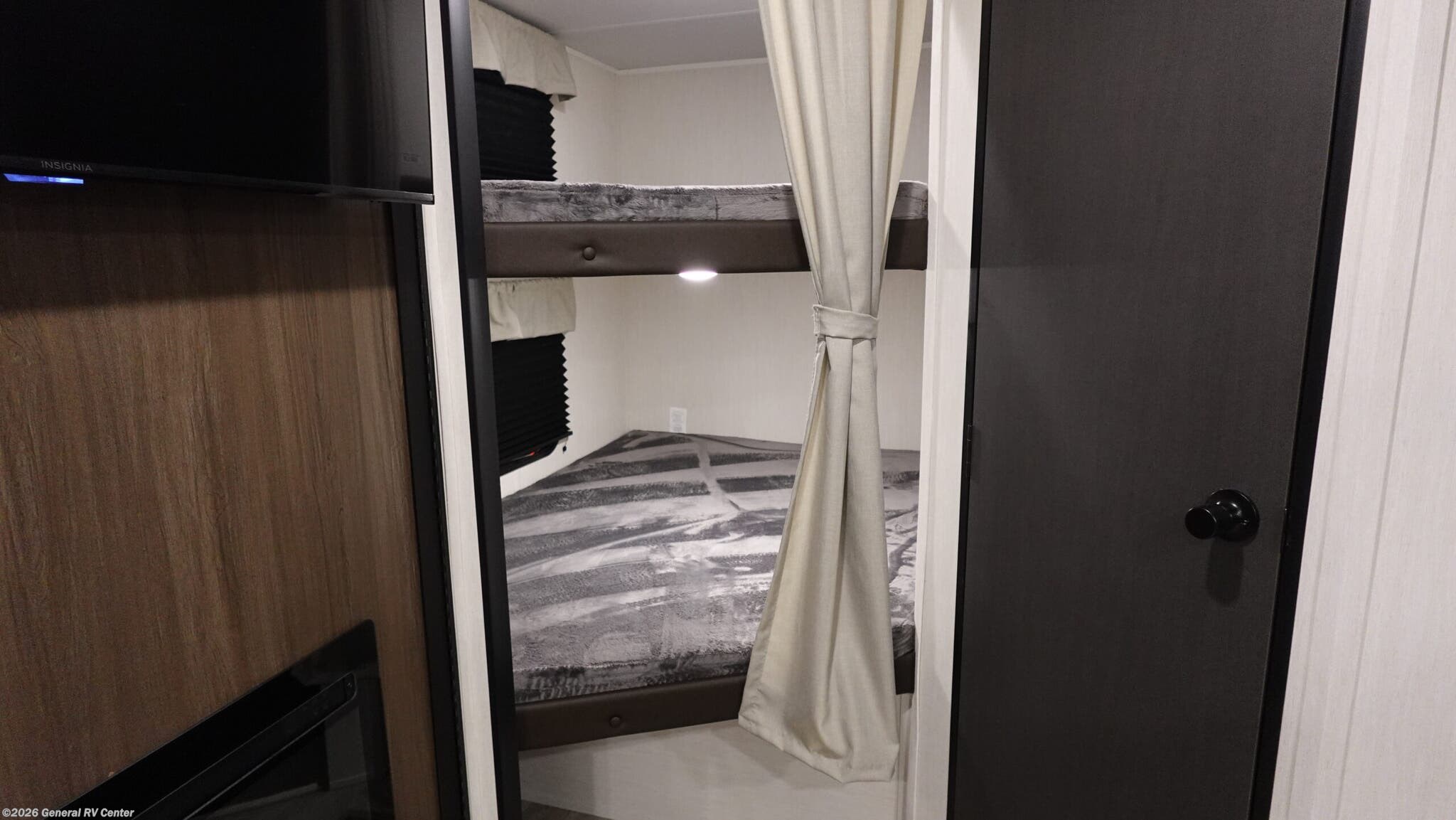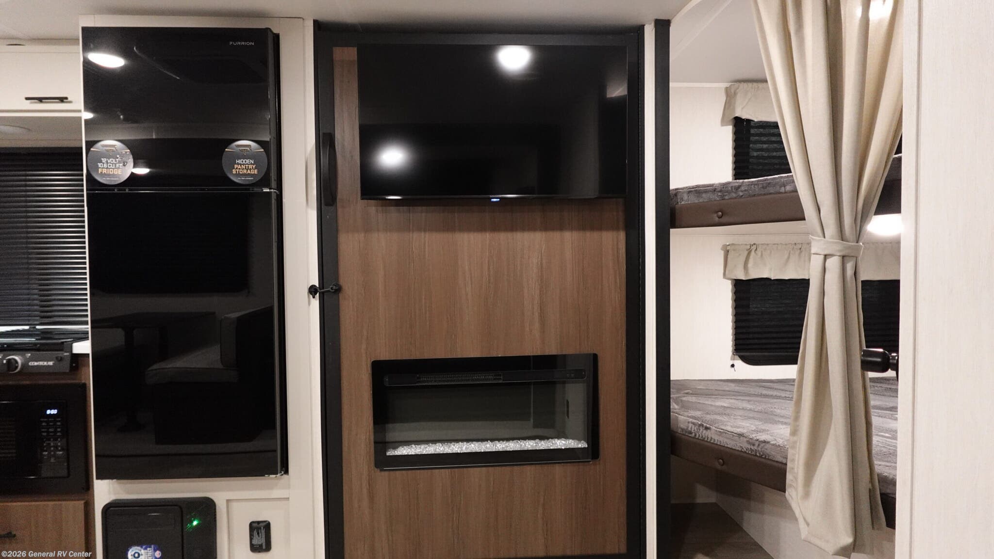 **Prime Time Avenger travel trailer 26DBS highlights:** - Large Slide Out - TV and Fireplace - Oversized Window - Double-Size Bunks You'll appreciate the added space in this travel trailer thanks to the large slide out! The booth dinette and sofa are found here, and there is a moveable storage ottoman for extra blankets or board games. You'll have your own space up front in the private bedroom, complete with a camp king bed and storage for your things, while your guests take the double-size bunk beds towards the back. The chef of your group will find a three burner cooktop and a built-in convection microwave with an air fryer to cook meals, plus there is a 12V refrigerator and large hidden pantry for food storage. This unit also includes a power awning outdoors and an outside refrigerator to keep cold drinks close by. With any Avenger travel trailer by Prime Time RV, you will find innovation, a solid build, and comfort at every turn. Each model is built with Tuff Coat on the exterior metal, a fully enclosed underbelly, and a PVC roof membrane to help extend the life of your trailer. You will also find automotive name badging on the exterior, along with an exterior shower, front rail LED light strips, plus an XL padded entry grab handle to name a few conveniences. There are plenty of storage spaces inside, as well as Congoleum flooring and woven PVC marine grade slide out flooring, a designer shower surround, and seamless pressed countertops. You are sure to appreciate the onboard water filtration system, tankless water heater, plus 30K BTU furnace and 15K ducted A/C to help keep you comfortable.