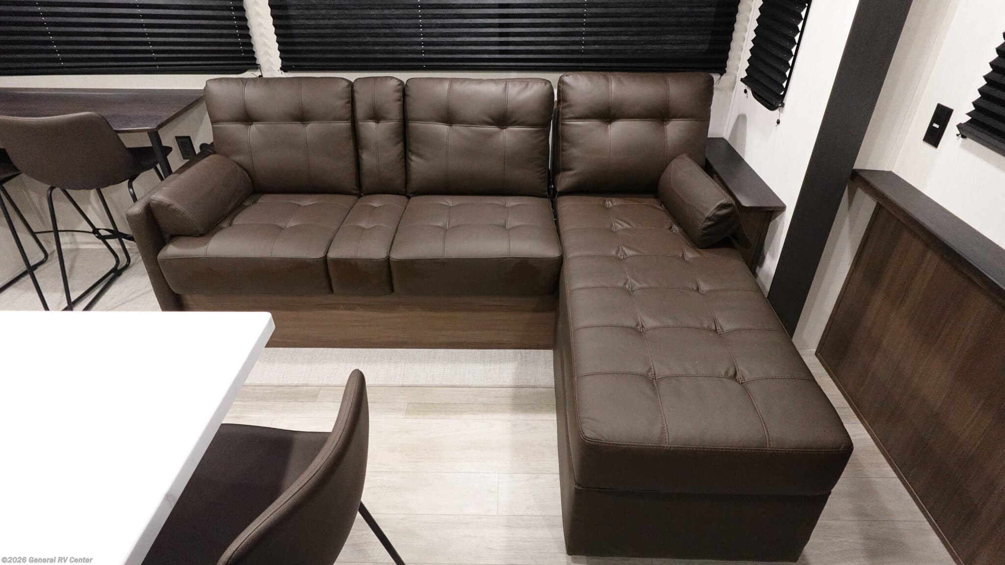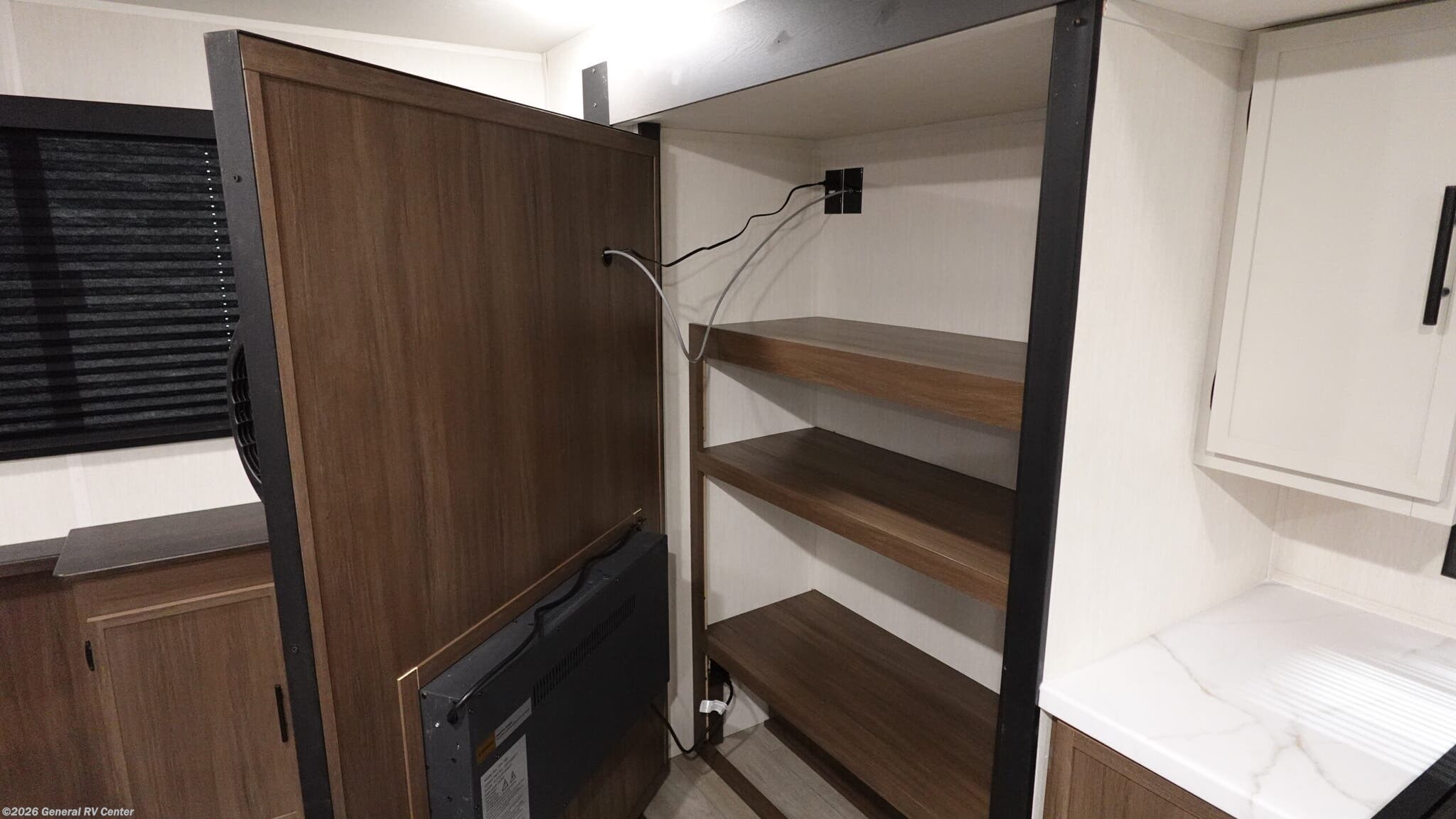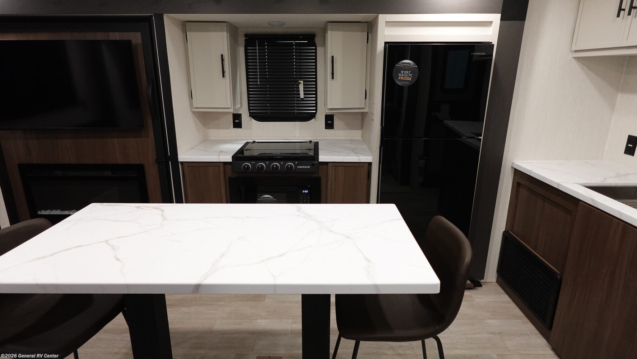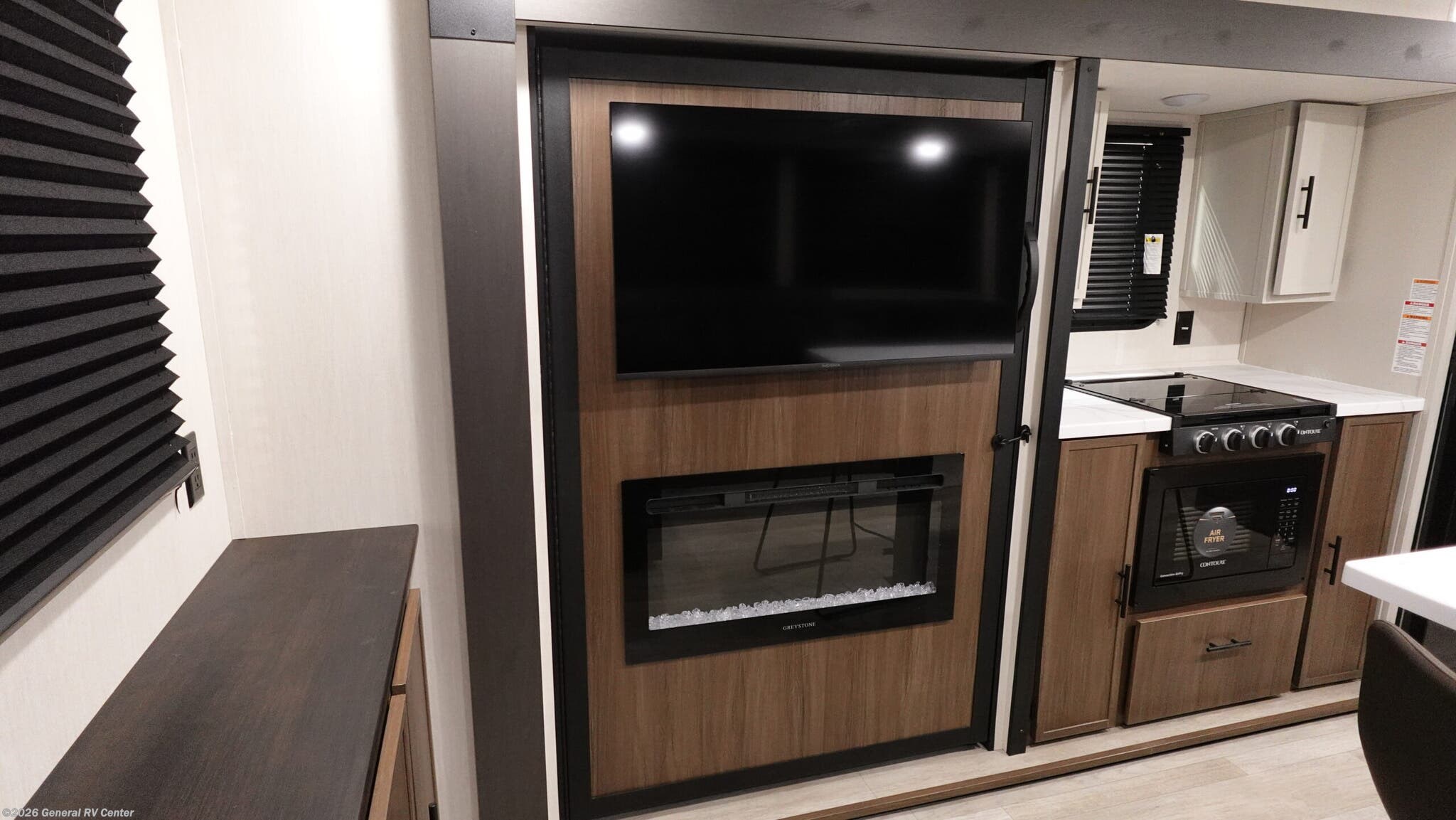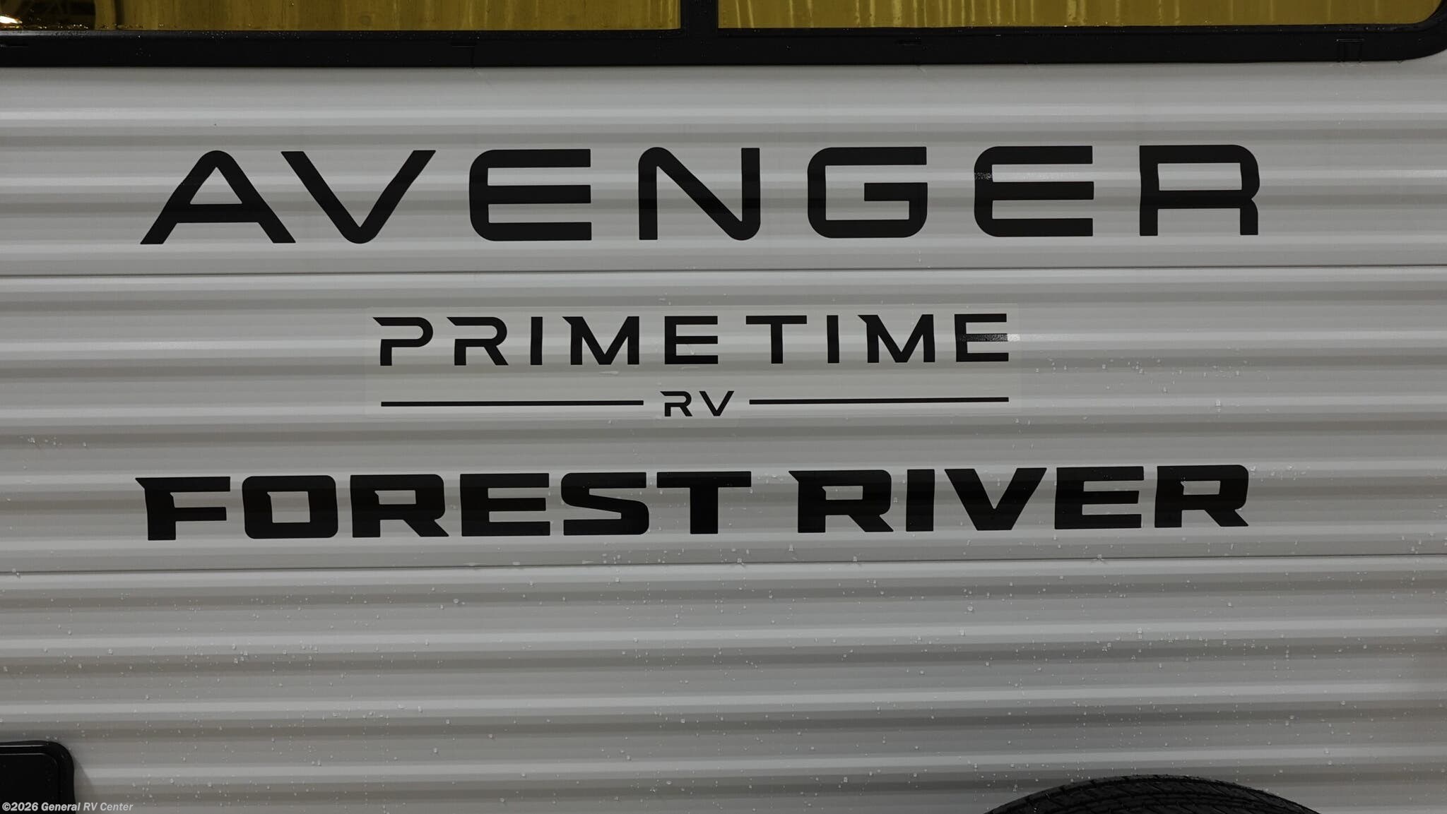 **Prime Time Avenger travel trailer 27REI highlights:** * Dual Opposing Slides * Camp King Bed * Spacious Full Bath * Best-In-Class Pass-Thru Storage There is ample space to move about in this travel trailer thanks to the dual opposing slides! Here, you'll find an L-shaped sofa with a chaise lounge in direct view of TV and fireplace. There is also a hidden pantry behind the TV for snacks and movies! The center farm table includes four stools so you can gather around for meal times, and the desk with a chair will provide a place for you to get some work done if needed. This unit features a full bath towards the front private bedroom for easy access at night, and you're sure to get a great night's rest on the camp king bed! With any Avenger travel trailer by Prime Time RV, you will find innovation, a solid build, and comfort at every turn. Each model is built with Tuff Coat on the exterior metal, a fully enclosed underbelly, and a PVC roof membrane to help extend the life of your trailer. You will also find automotive name badging on the exterior, along with an exterior shower, front rail LED light strips, plus an XL padded entry grab handle to name a few conveniences. There are plenty of storage spaces inside, as well as Congoleum flooring and woven PVC marine grade slide out flooring, a designer shower surround, and seamless pressed countertops. You are sure to appreciate the onboard water filtration system, tankless water heater, plus 30K BTU furnace and 15K ducted A/C to help keep you comfortable.