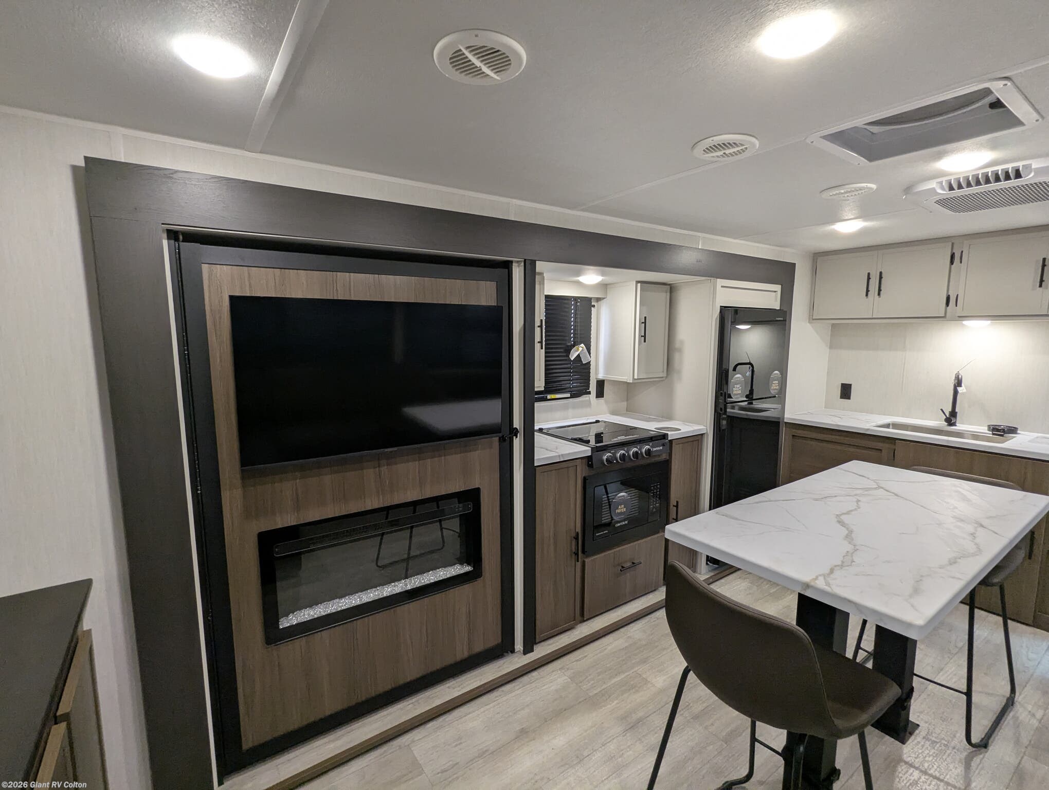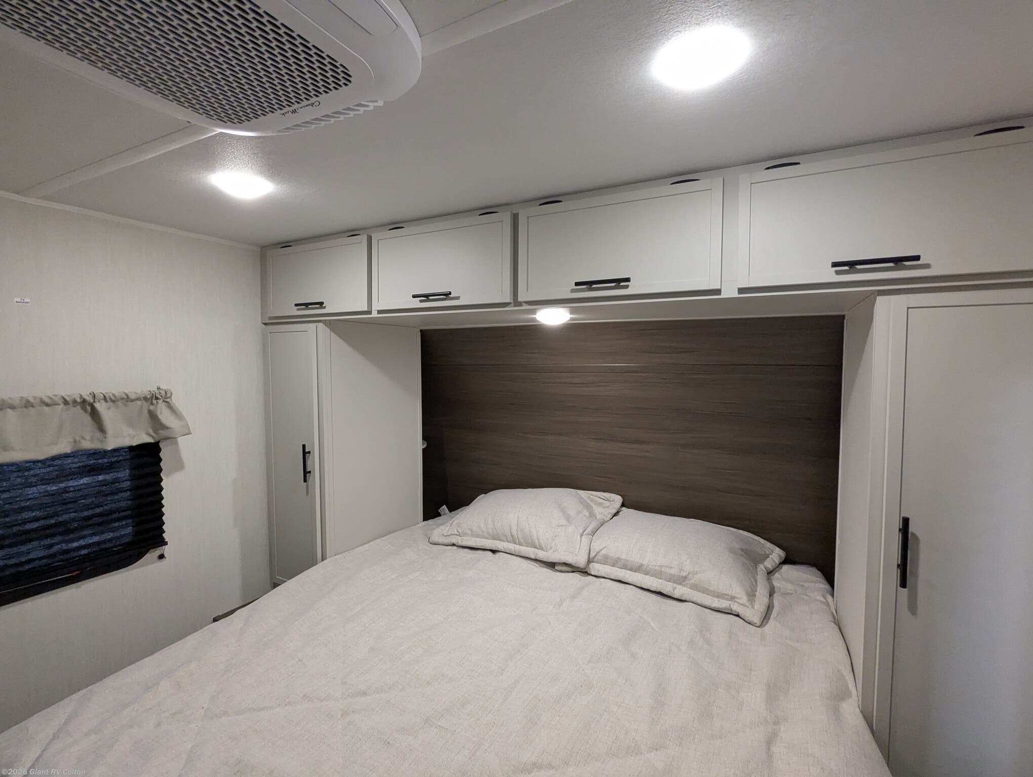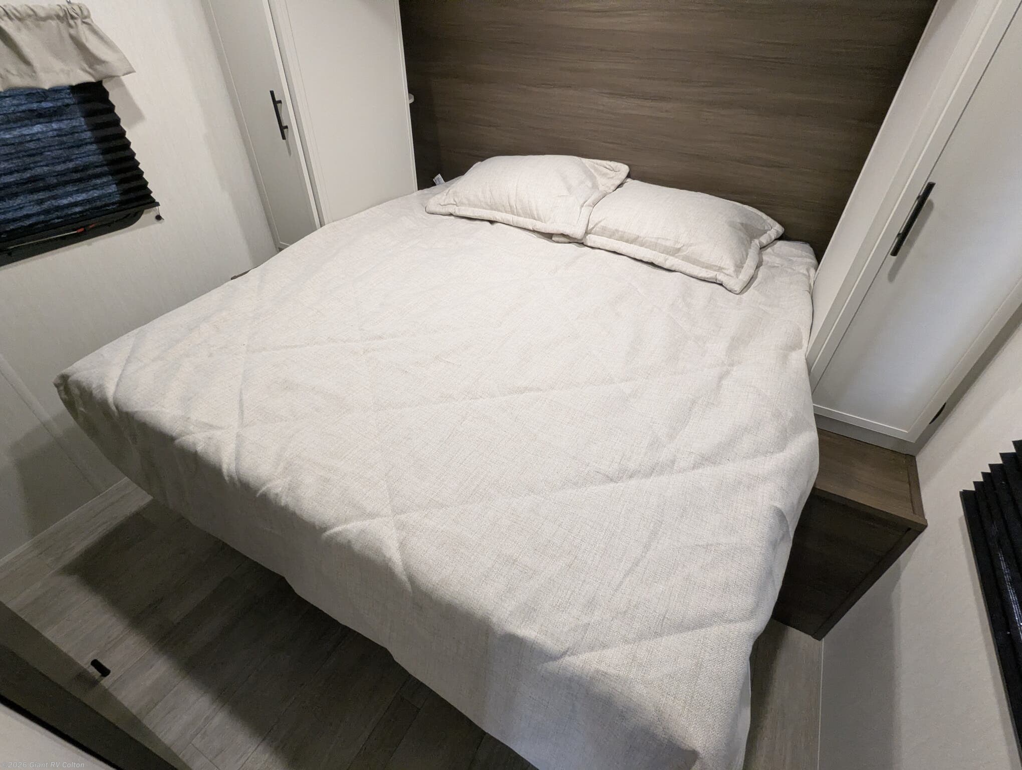 • Private Front Bedroom & Extended Stay Features with a camp king bed, washer/dryer prep, tankless water heater, 15K BTU A/C, enclosed underbelly, and generous tank capacities (42/68/34 gallons) for longer trips