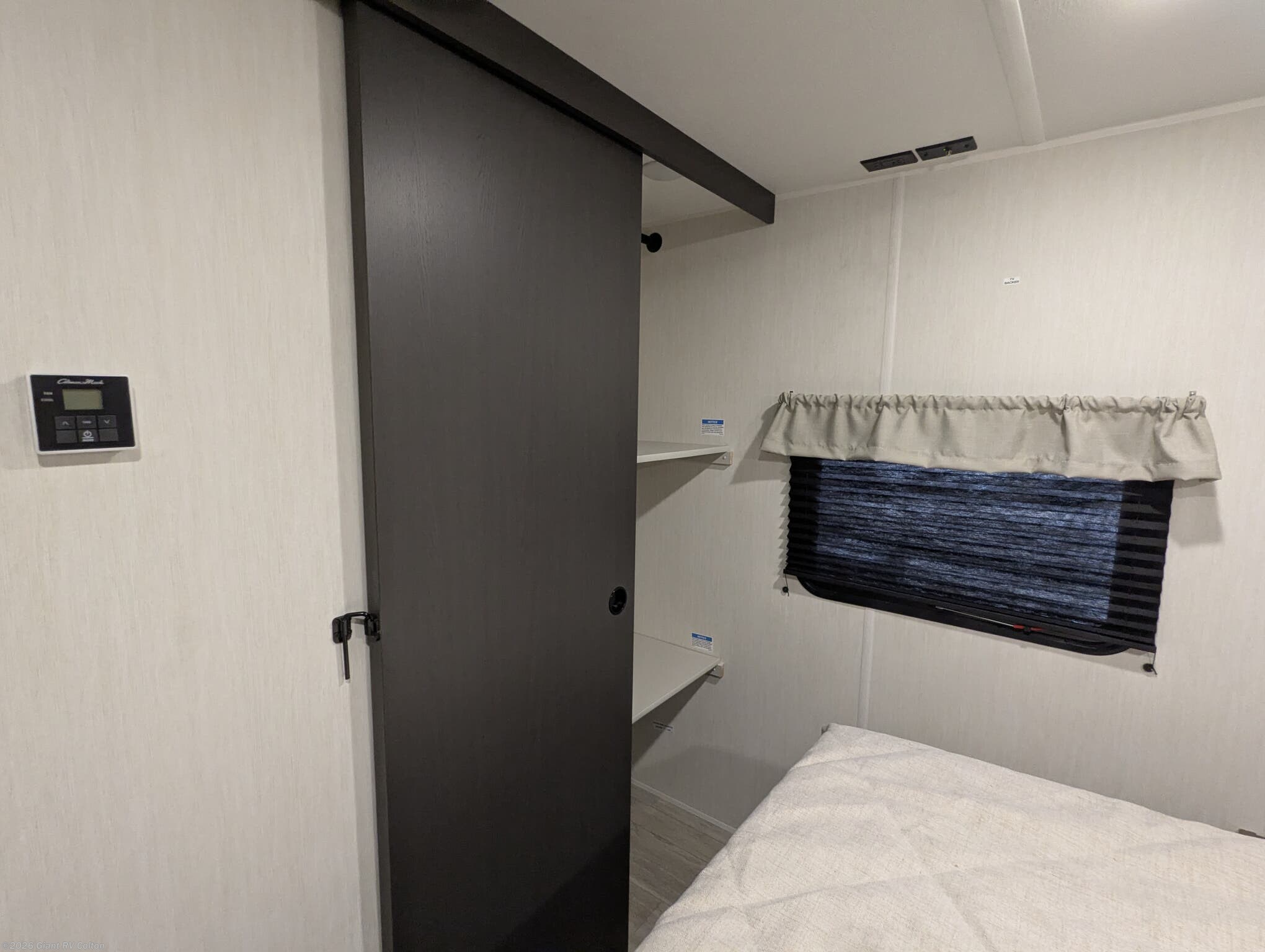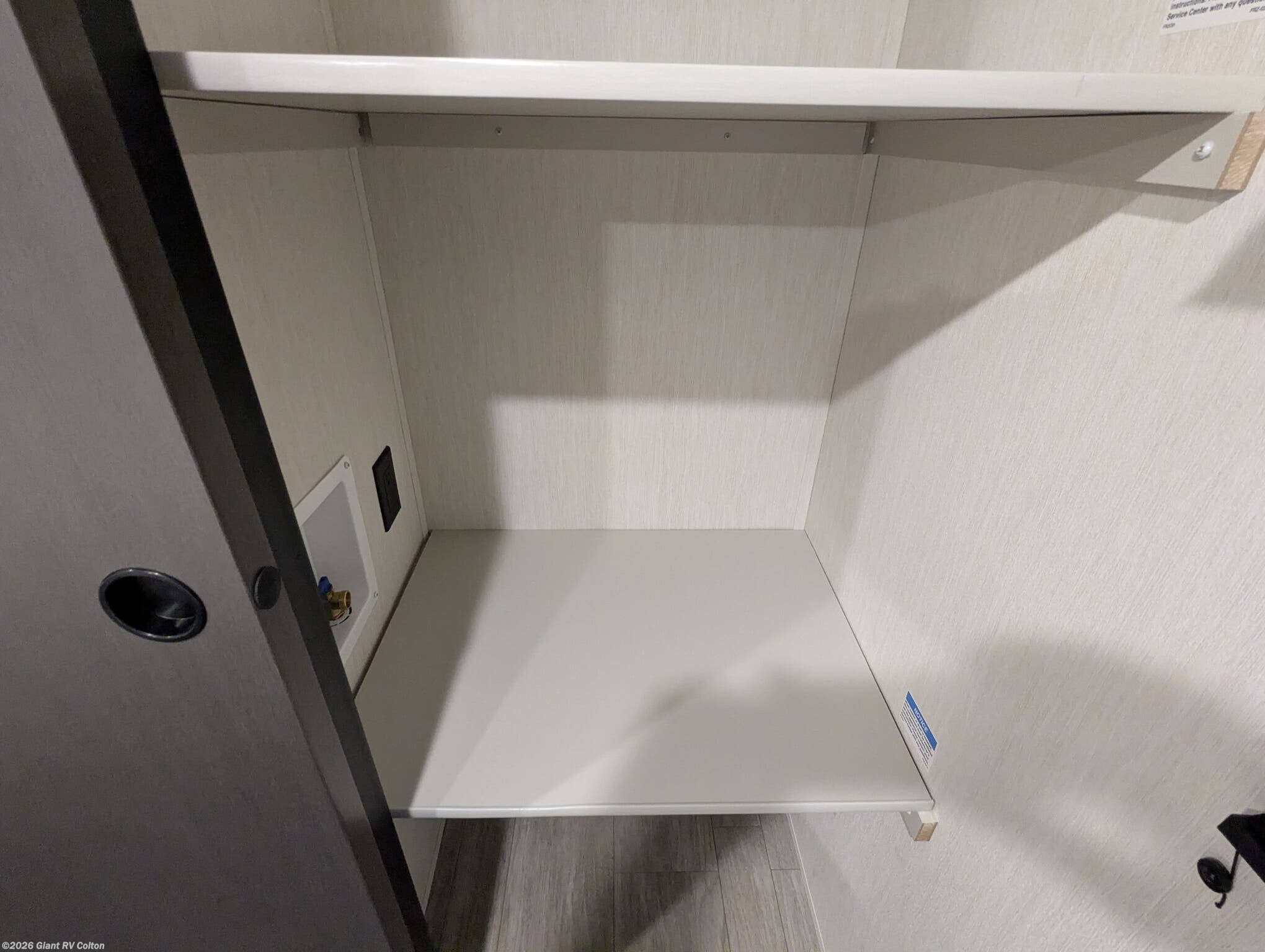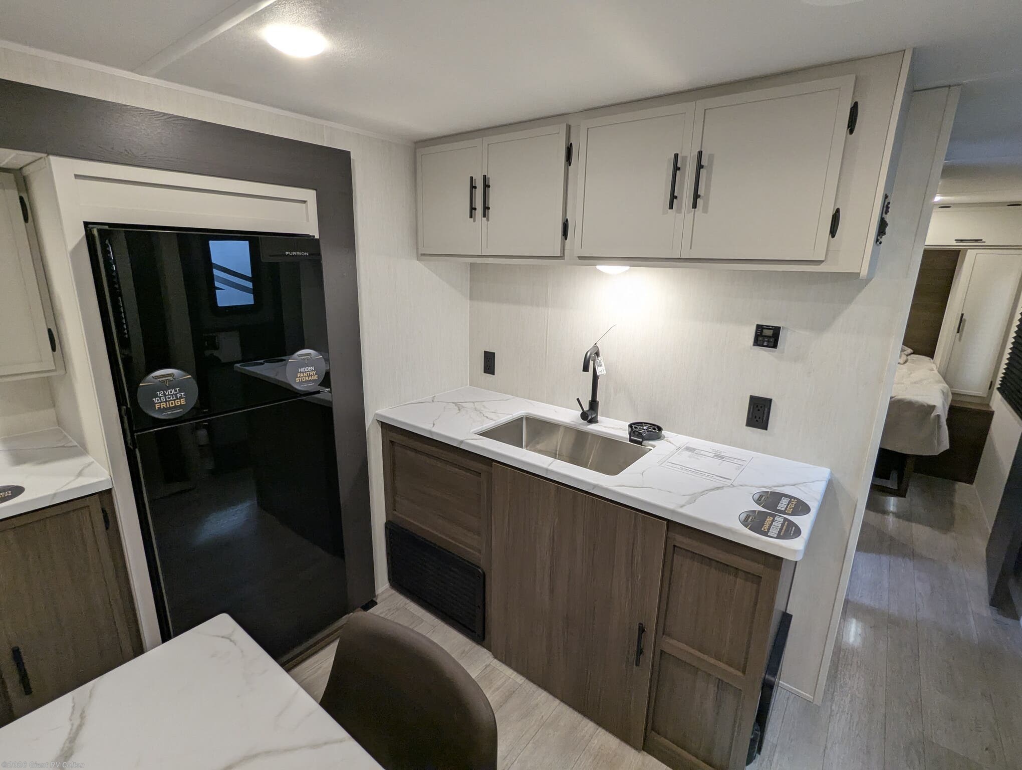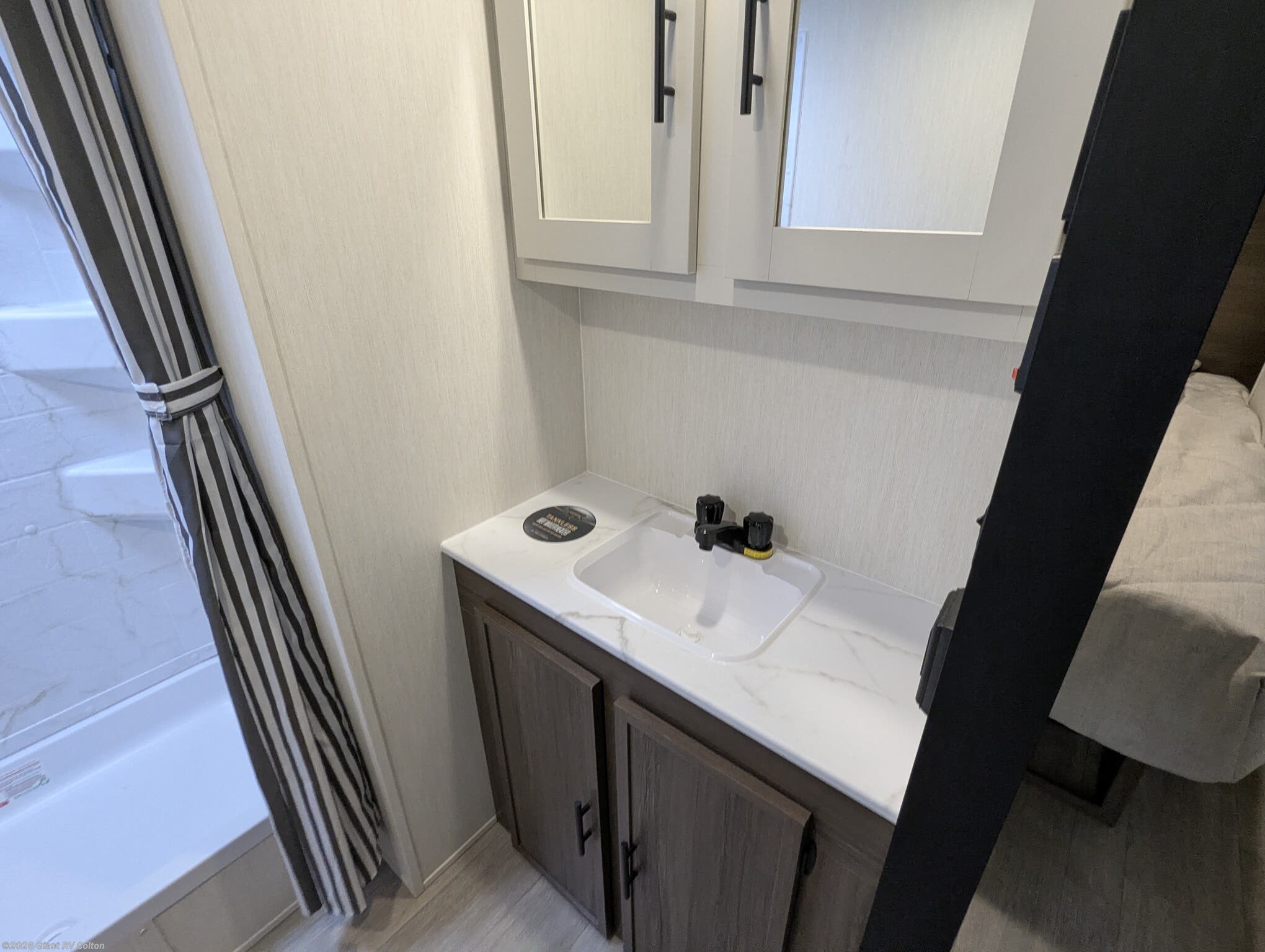 • Private Front Bedroom & Extended Stay Features with a camp king bed, washer/dryer prep, tankless water heater, 15K BTU A/C, enclosed underbelly, and generous tank capacities (42/68/34 gallons) for longer trips