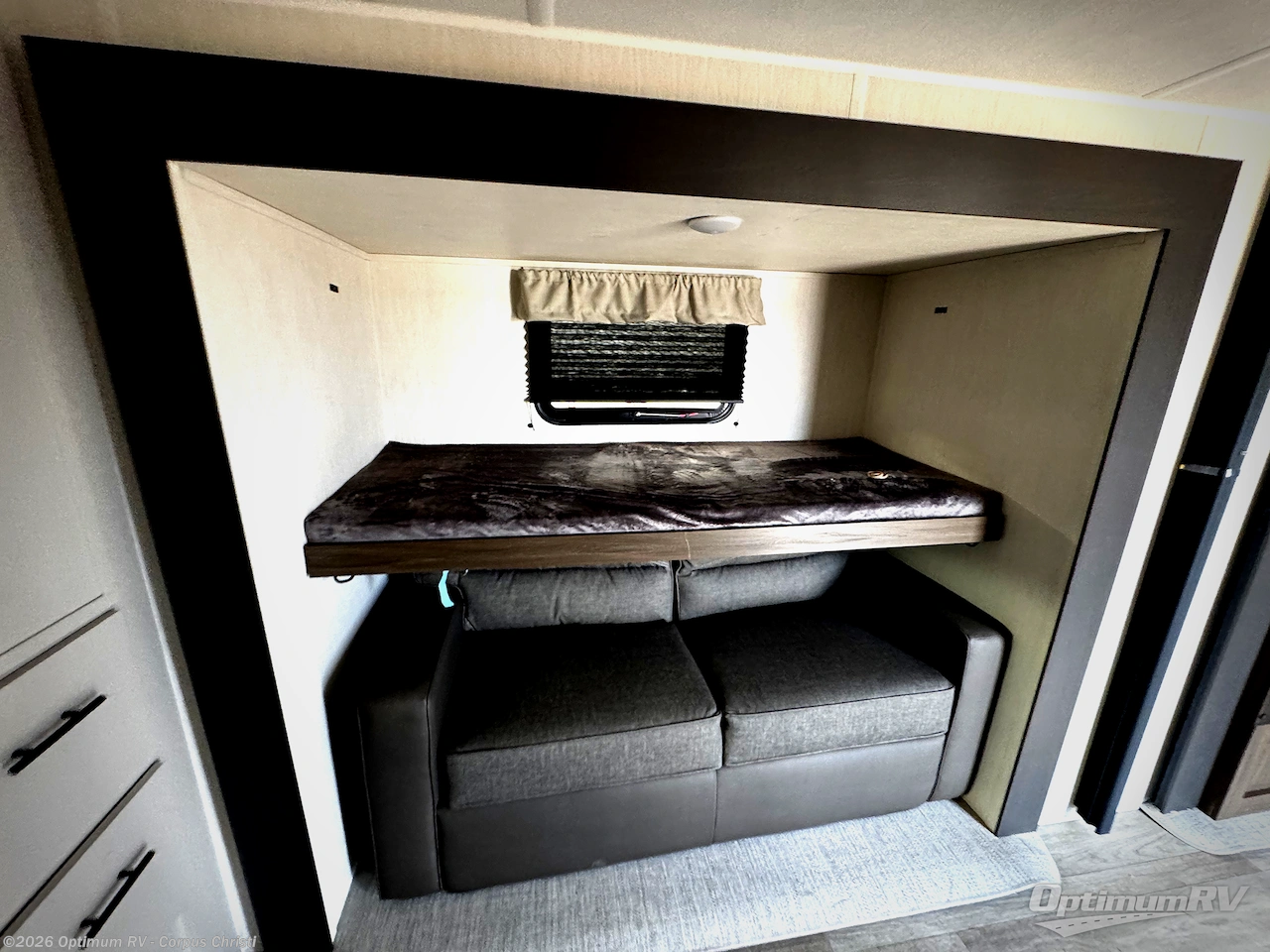 The whole gang will love camping in this spacious travel trailer that can sleep nine to ten people! The rear bunkhouse features dual opposing slides with hide-a-bed sofas and hinged bunk beds, plus a hidden desk, fireplace, and projector for movie nights! You'll appreciate your own space up front in the private bedroom, complete with a camp king bed and storage space. Everyone can meet in the combined kitchen and living area as the chef of your group makes breakfast in the fully equipped kitchen. There is a sofa and booth dinette here for seating space, or you can take your plate outdoors to sit under the power awning. And the outdoor refrigerator is sure to come in handy when you want another cold drink!