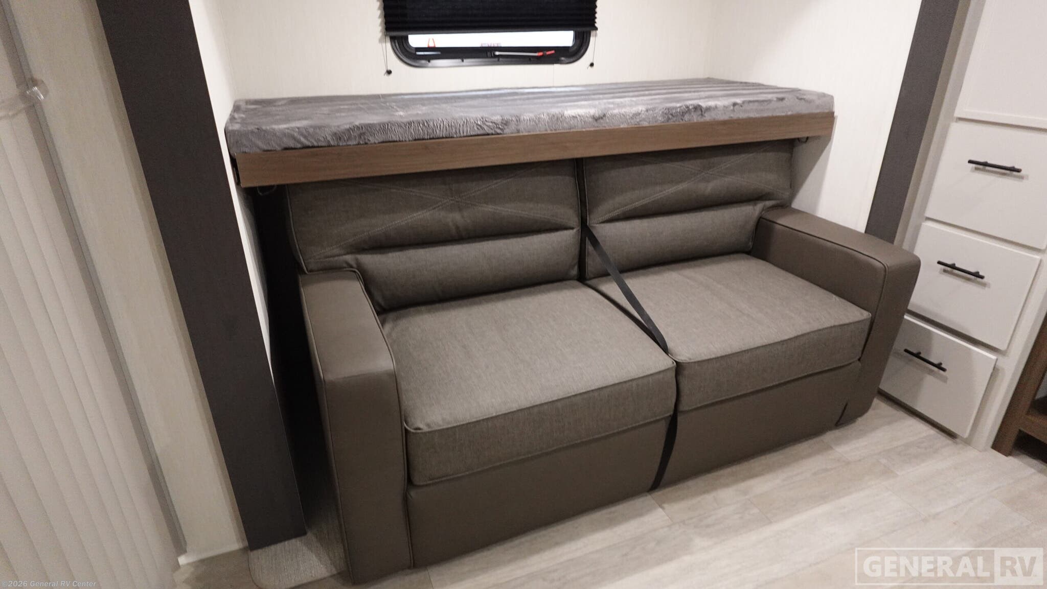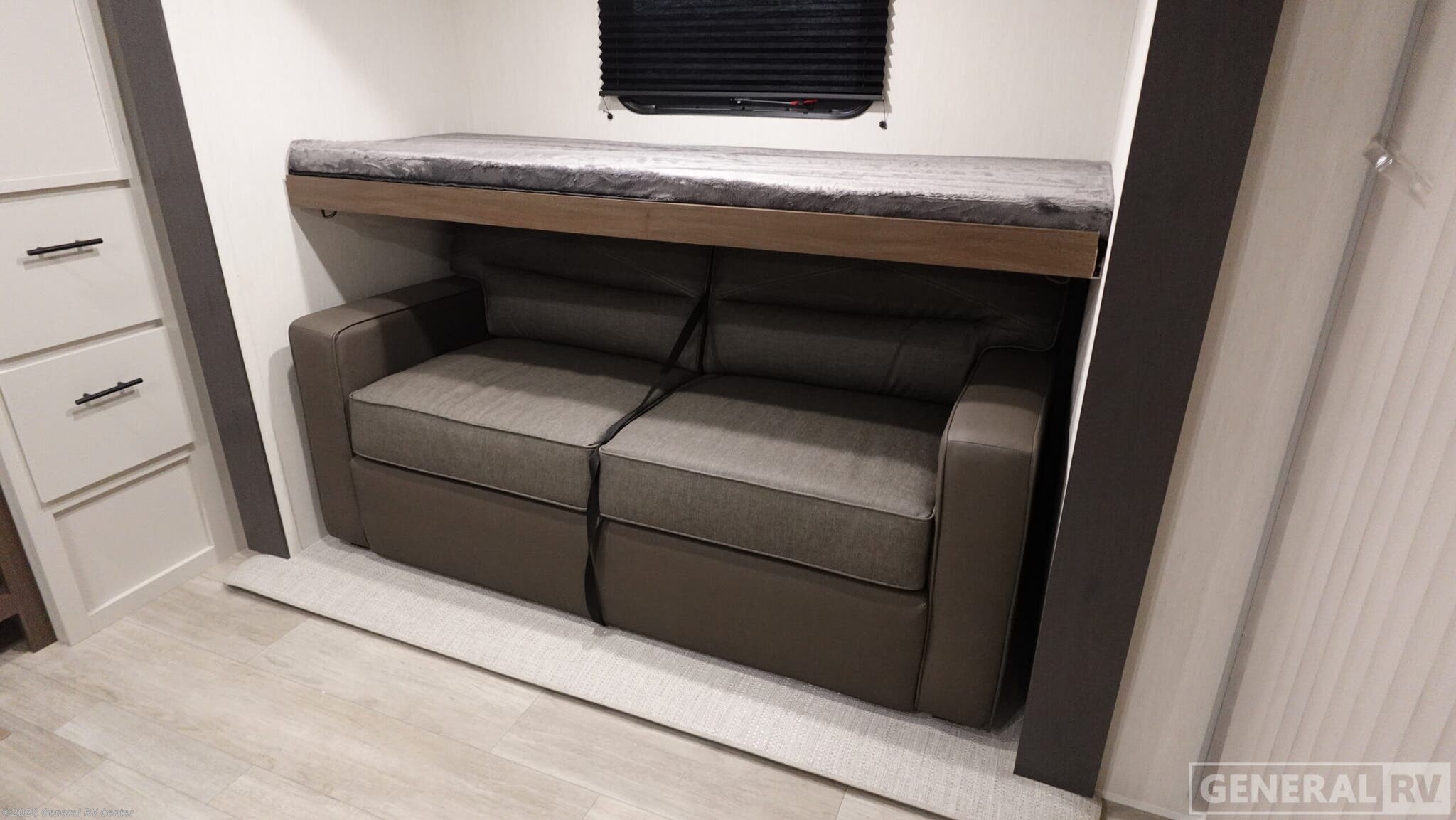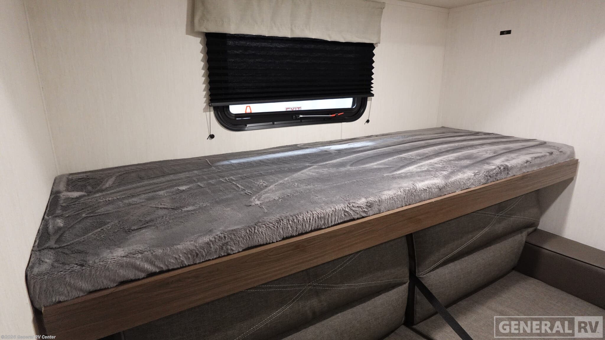 Prime Time Avenger travel trailer 30PO highlights: Triple Slides Sofa with Moveable Storage Ottoman Front Private Bedroom Oversized Bedroom Window Hinged Bunk Beds The whole gang will love camping in this spacious travel trailer that can sleep nine to ten people! The rear bunkhouse features dual opposing slides with hide-a-bed sofas and hinged bunk beds, plus a hidden desk, fireplace, and projector for movie nights! You'll appreciate your own space up front in the private bedroom, complete with a camp king bed and storage space. Everyone can meet in the combined kitchen and living area as the chef of your group makes breakfast in the fully equipped kitchen. There is a sofa and booth dinette here for seating space, or you can take your plate outdoors to sit under the power awning. And the outdoor refrigerator is sure to come in handy when you want another cold drink! With any Avenger travel trailer by Prime Time RV, you will find innovation, a solid build, and comfort at every turn. Each model is built with Tuff Coat on the exterior metal, a fully enclosed underbelly, and a PVC roof membrane to help extend the life of your trailer. You will also find automotive name badging on the exterior, along with an exterior shower, front rail LED light strips, plus an XL padded entry grab handle to name a few conveniences. There are plenty of storage spaces inside, as well as Congoleum flooring and woven PVC marine grade slide out flooring, a designer shower surround, and seamless pressed countertops. You are sure to appreciate the onboard water filtration system, tankless water heater, plus 30K BTU furnace and 15K ducted A/C to help keep you comfortable.
