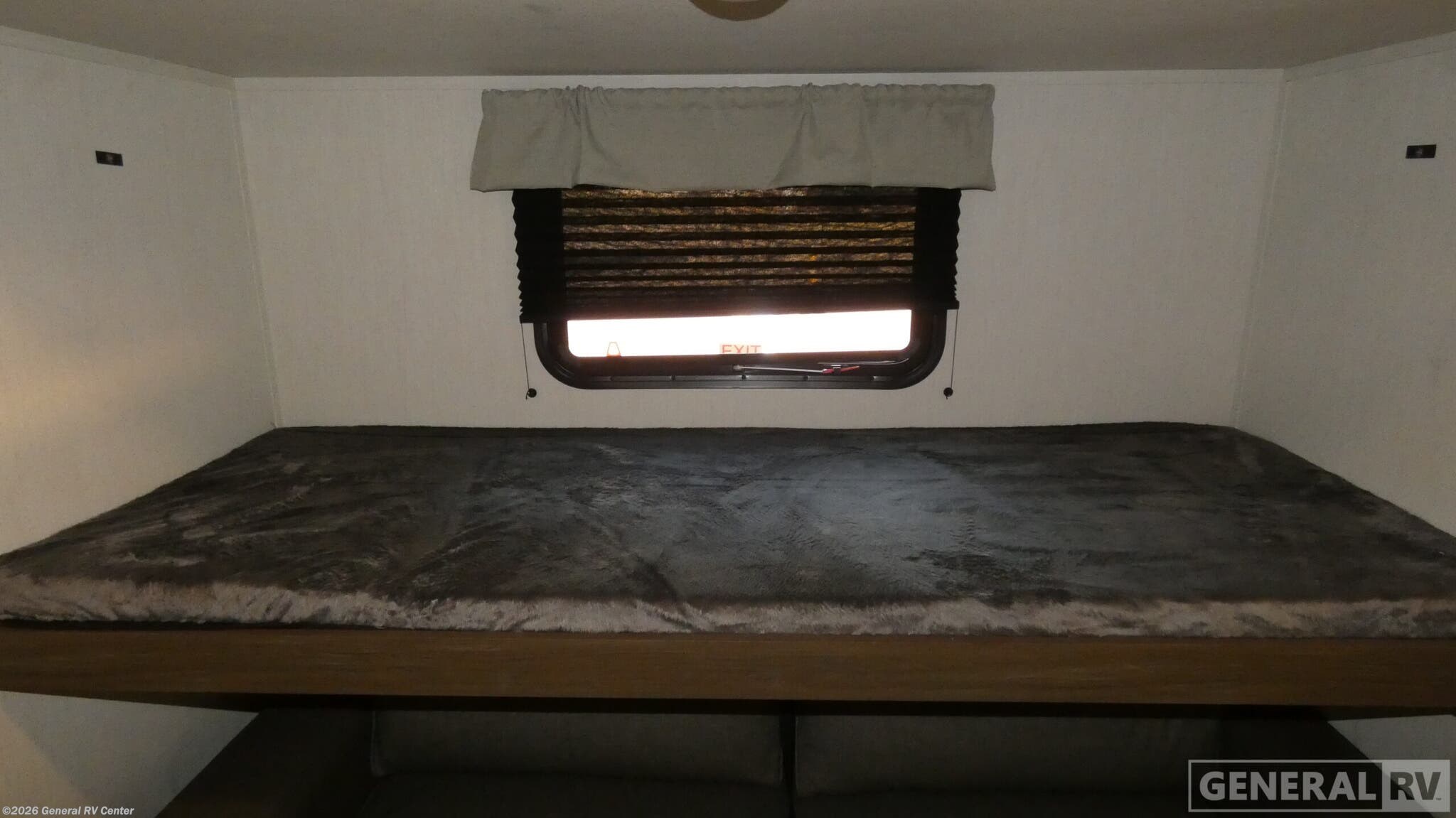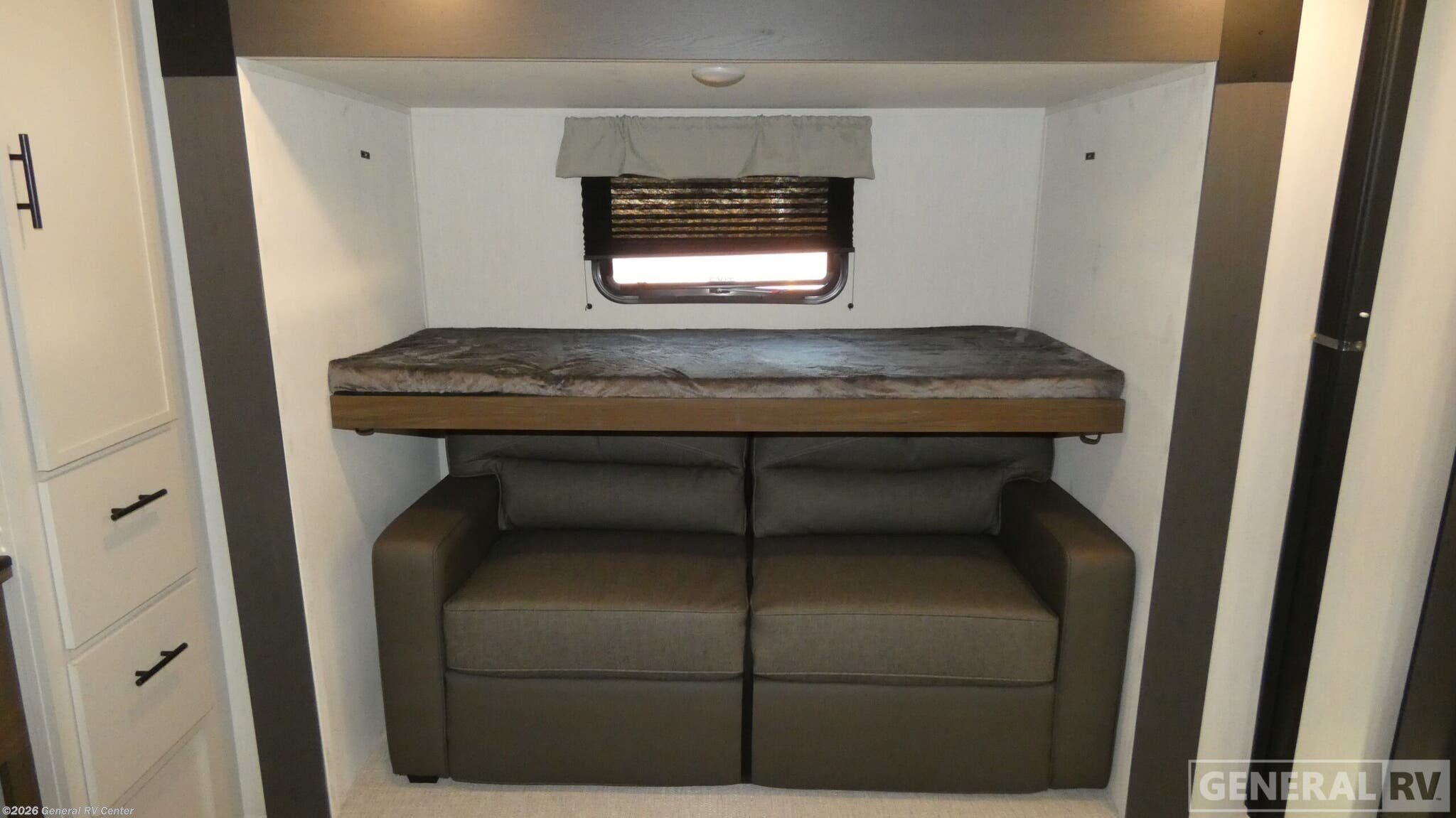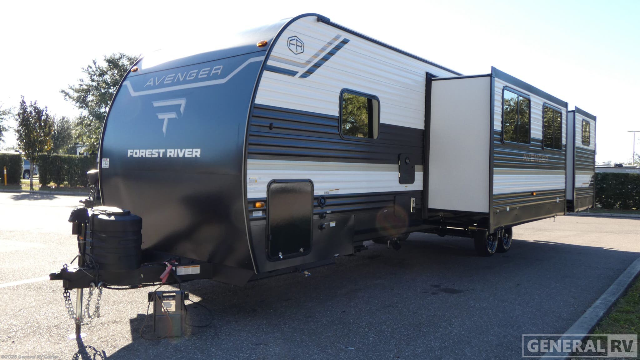 Prime Time Avenger travel trailer 30PO highlights: Triple Slides Sofa with Moveable Storage Ottoman Front Private Bedroom Oversized Bedroom Window Hinged Bunk Beds The whole gang will love camping in this spacious travel trailer that can sleep nine to ten people! The rear bunkhouse features dual opposing slides with hide-a-bed sofas and hinged bunk beds, plus a hidden desk, fireplace, and projector for movie nights! You'll appreciate your own space up front in the private bedroom, complete with a camp king bed and storage space. Everyone can meet in the combined kitchen and living area as the chef of your group makes breakfast in the fully equipped kitchen. There is a sofa and booth dinette here for seating space, or you can take your plate outdoors to sit under the power awning. And the outdoor refrigerator is sure to come in handy when you want another cold drink! With any Avenger travel trailer by Prime Time RV, you will find innovation, a solid build, and comfort at every turn. Each model is built with Tuff Coat on the exterior metal, a fully enclosed underbelly, and a PVC roof membrane to help extend the life of your trailer. You will also find automotive name badging on the exterior, along with an exterior shower, front rail LED light strips, plus an XL padded entry grab handle to name a few conveniences. There are plenty of storage spaces inside, as well as Congoleum flooring and woven PVC marine grade slide out flooring, a designer shower surround, and seamless pressed countertops. You are sure to appreciate the onboard water filtration system, tankless water heater, plus 30K BTU furnace and 15K ducted A/C to help keep you comfortable.