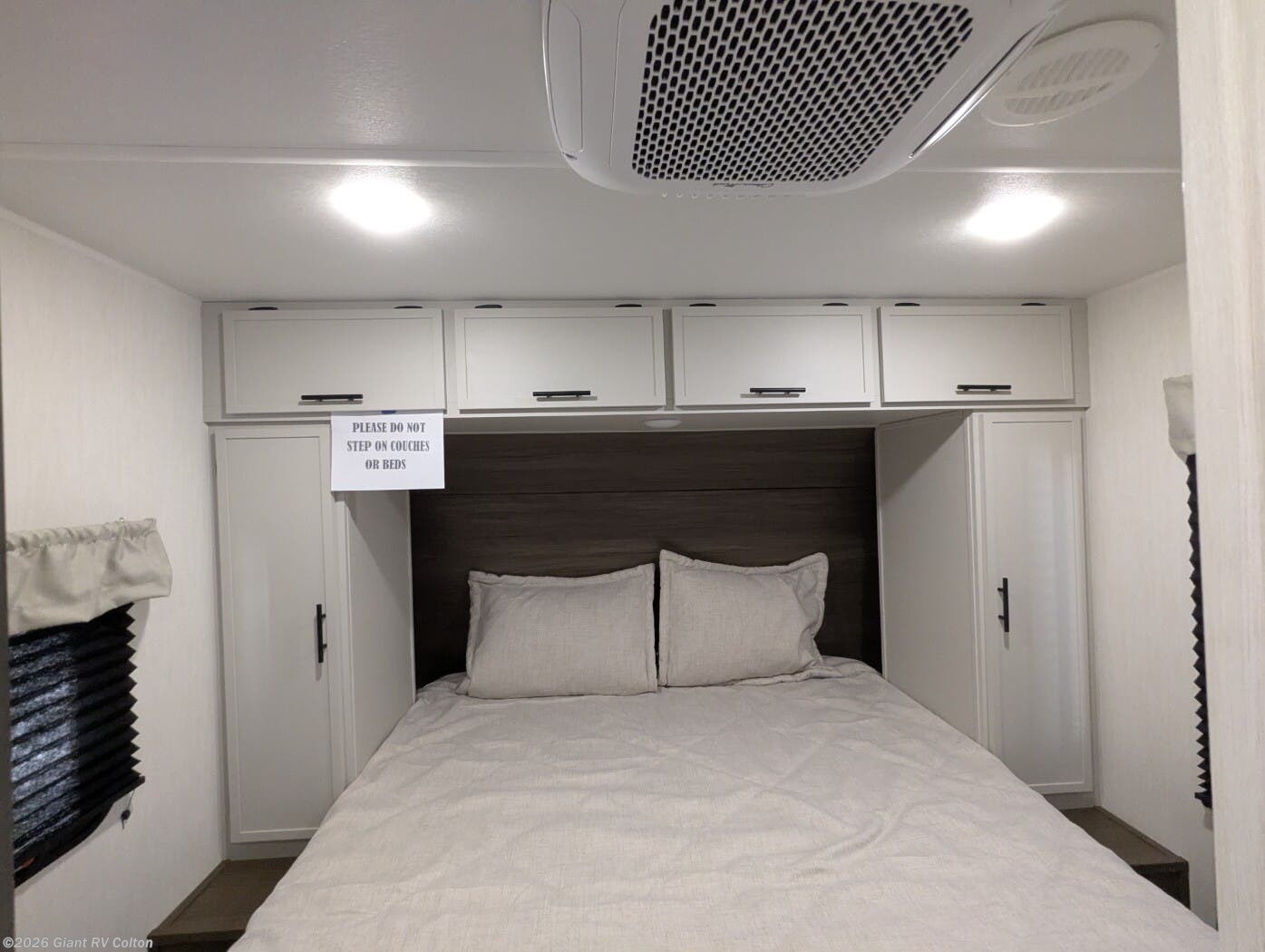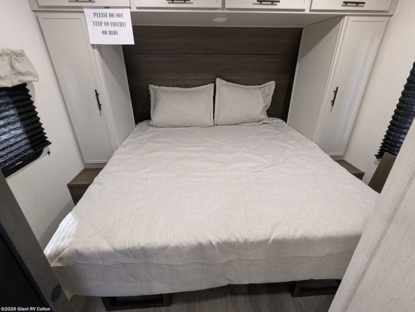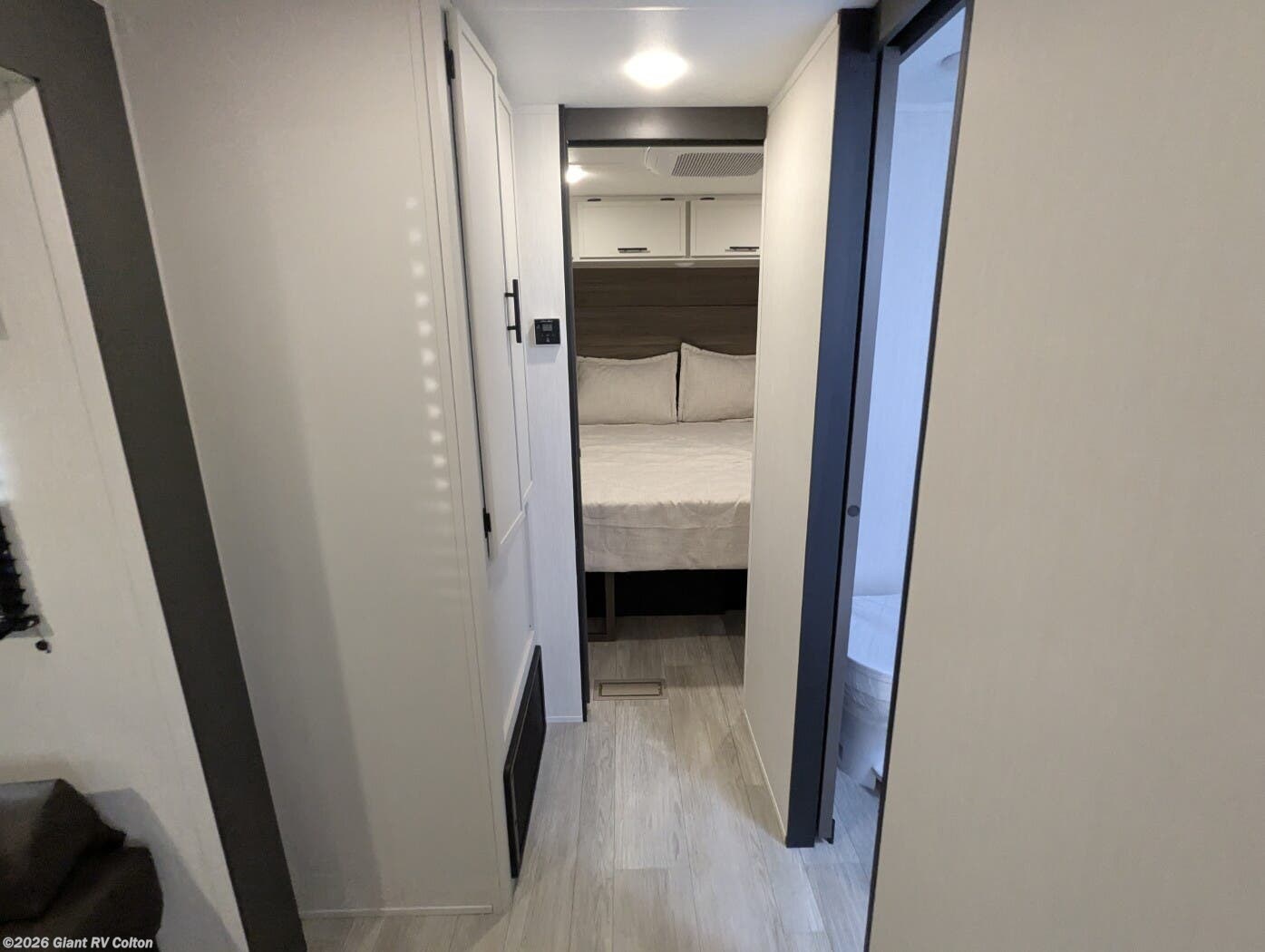 • Private Master Bedroom & Premium Features with a camp king bed, dual wardrobes, under-bed storage, tankless water heater, power awning with LED lighting, available dual A/C, exterior storage, and sleeping capacity for up to 10+.