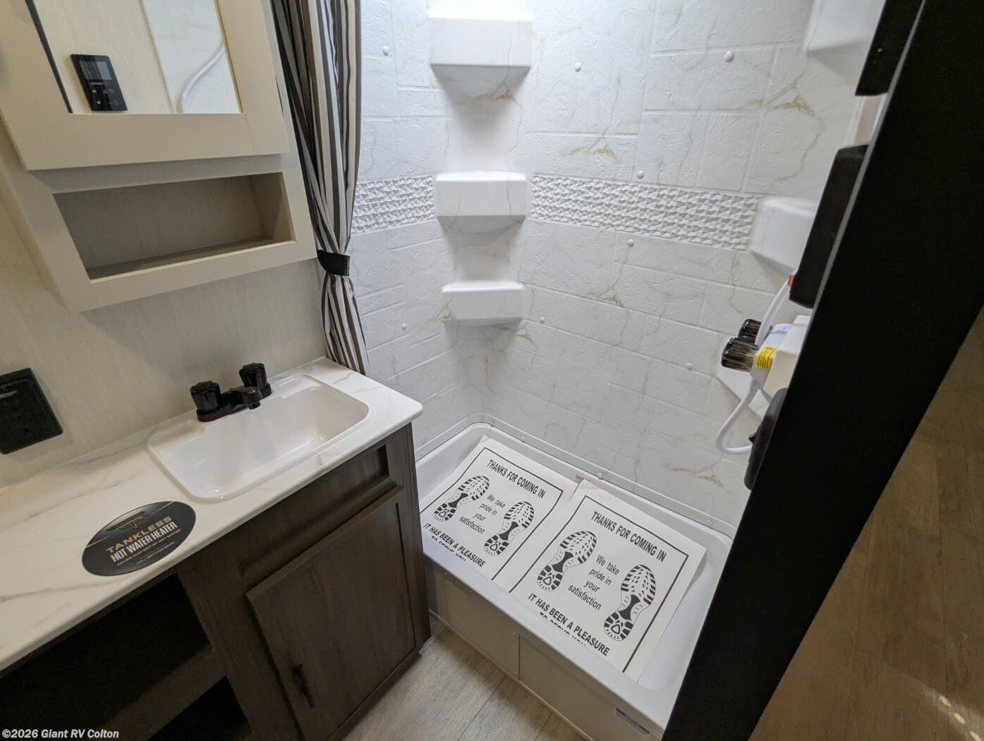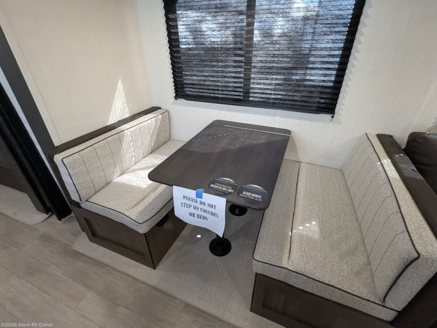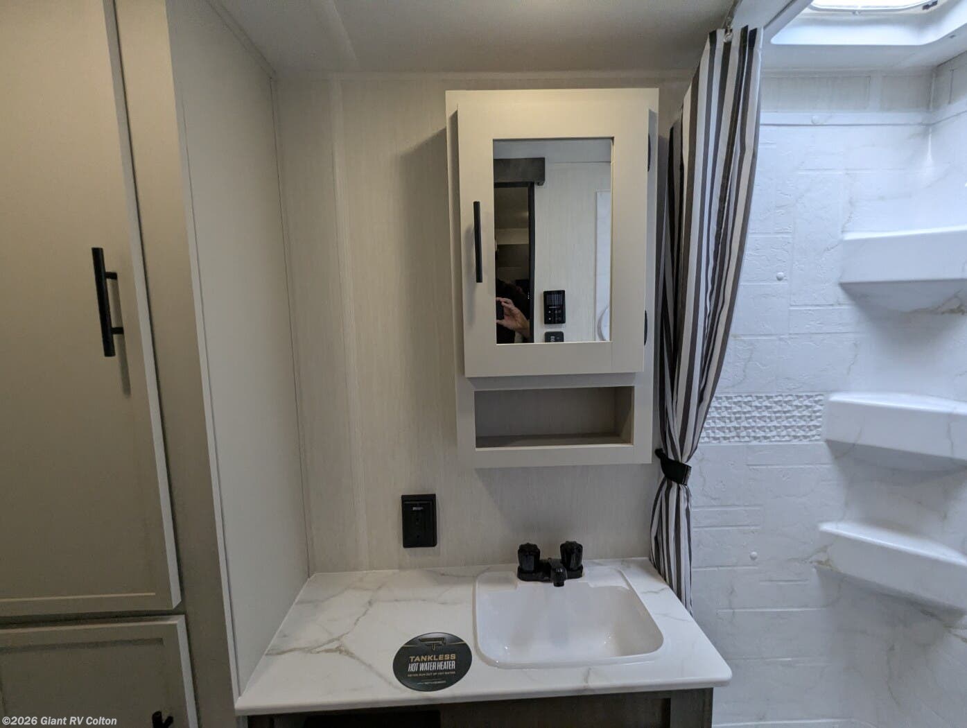 • Private Master Bedroom & Premium Features with a camp king bed, dual wardrobes, under-bed storage, tankless water heater, power awning with LED lighting, available dual A/C, exterior storage, and sleeping capacity for up to 10+.