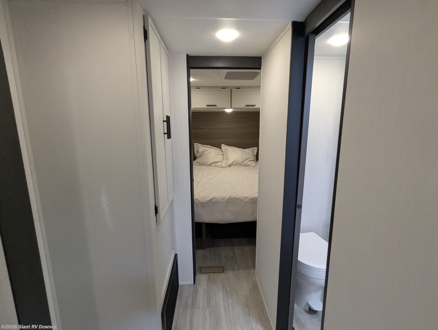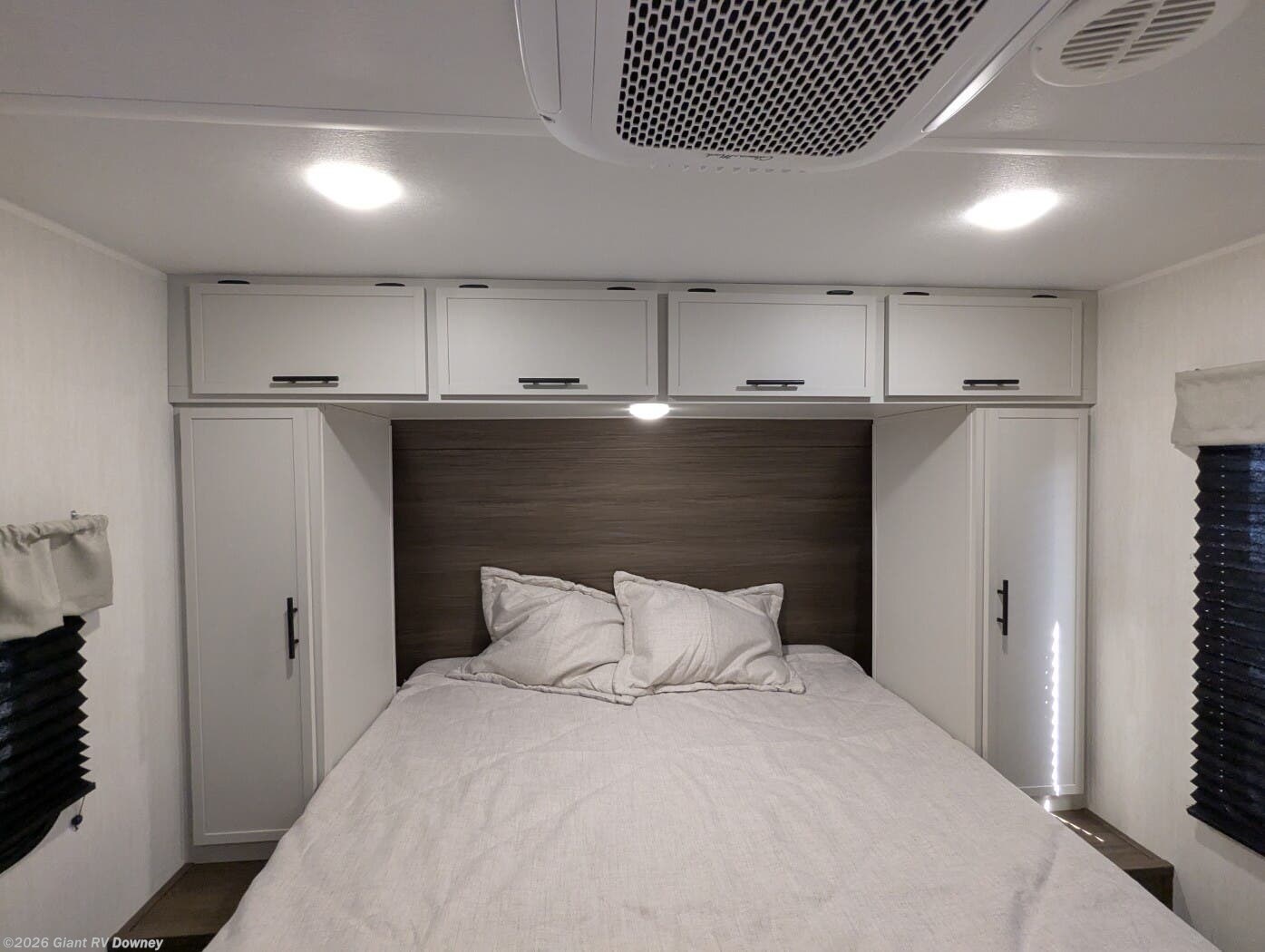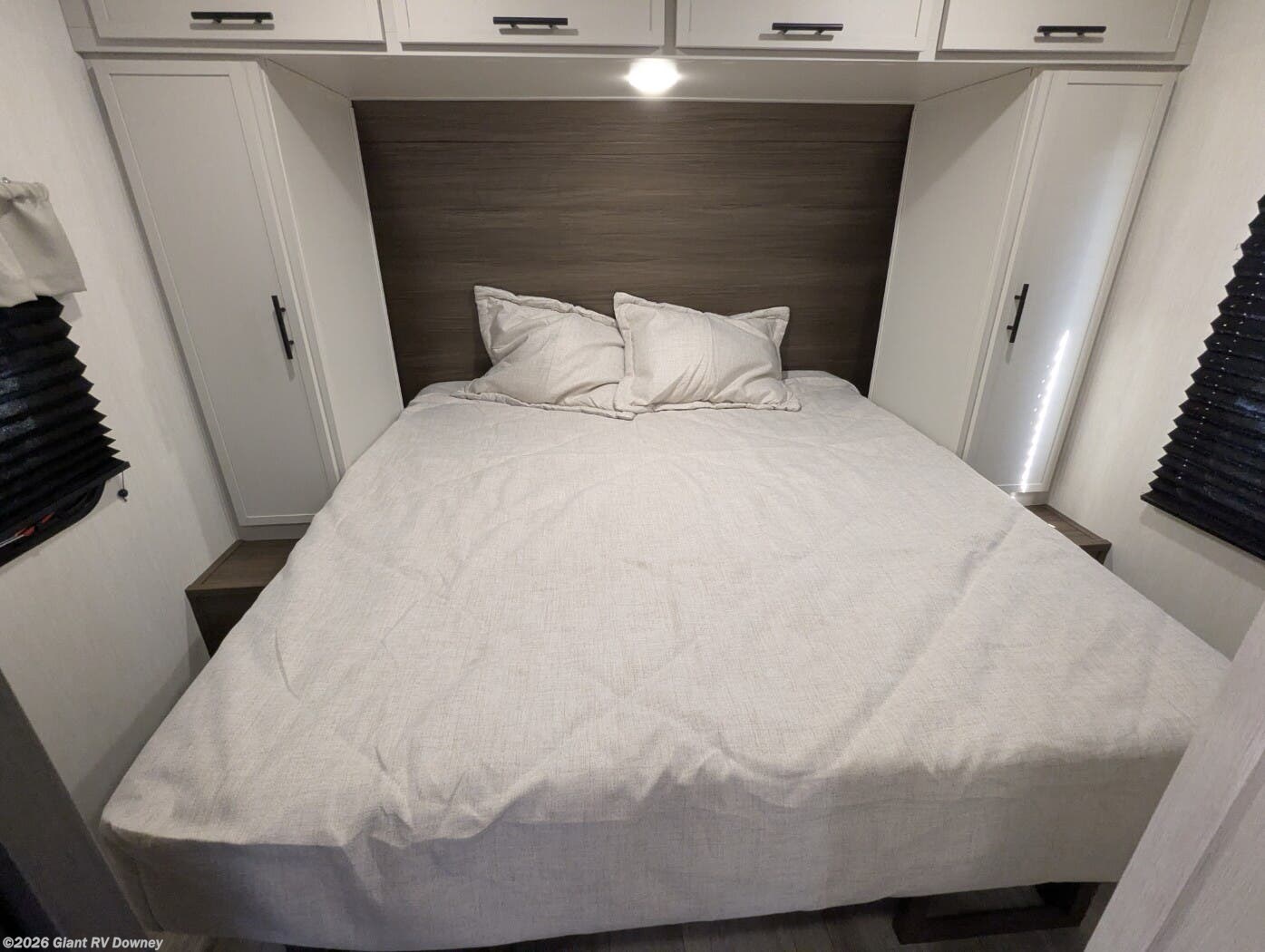 • Private Master Bedroom & Premium Features with a camp king bed, dual wardrobes, under-bed storage, tankless water heater, power awning with LED lighting, available dual A/C, exterior storage, and sleeping capacity for up to 10+.
