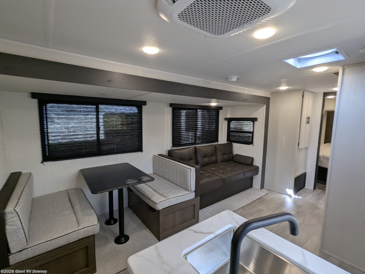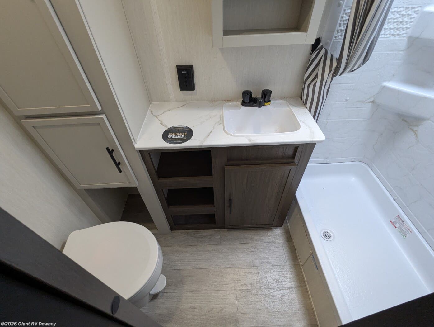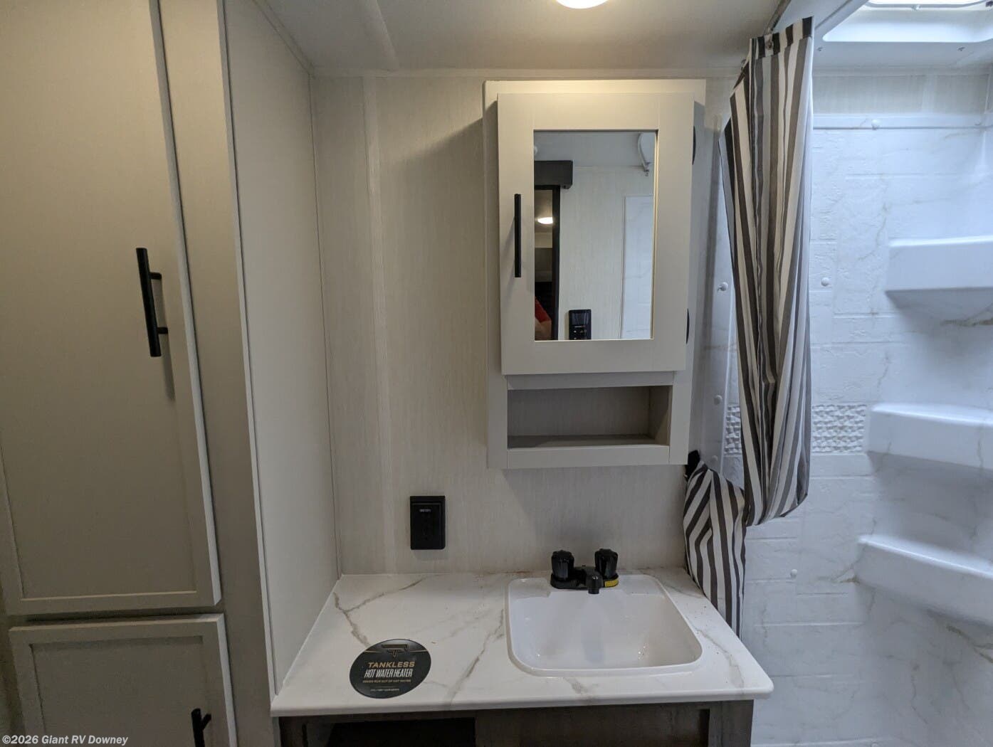 • Private Master Bedroom & Premium Features with a camp king bed, dual wardrobes, under-bed storage, tankless water heater, power awning with LED lighting, available dual A/C, exterior storage, and sleeping capacity for up to 10+.