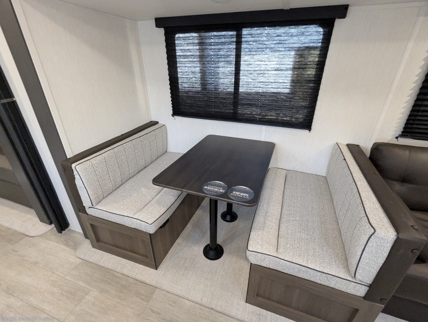 • Residential Kitchen & Dining Space including a 10.6 cu. ft. refrigerator, three-burner cooktop, convection microwave with air fryer, farmhouse sink, large dinette, and hidden pantry storage for everyday convenience.