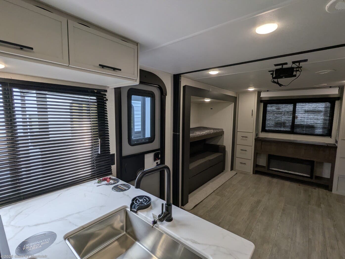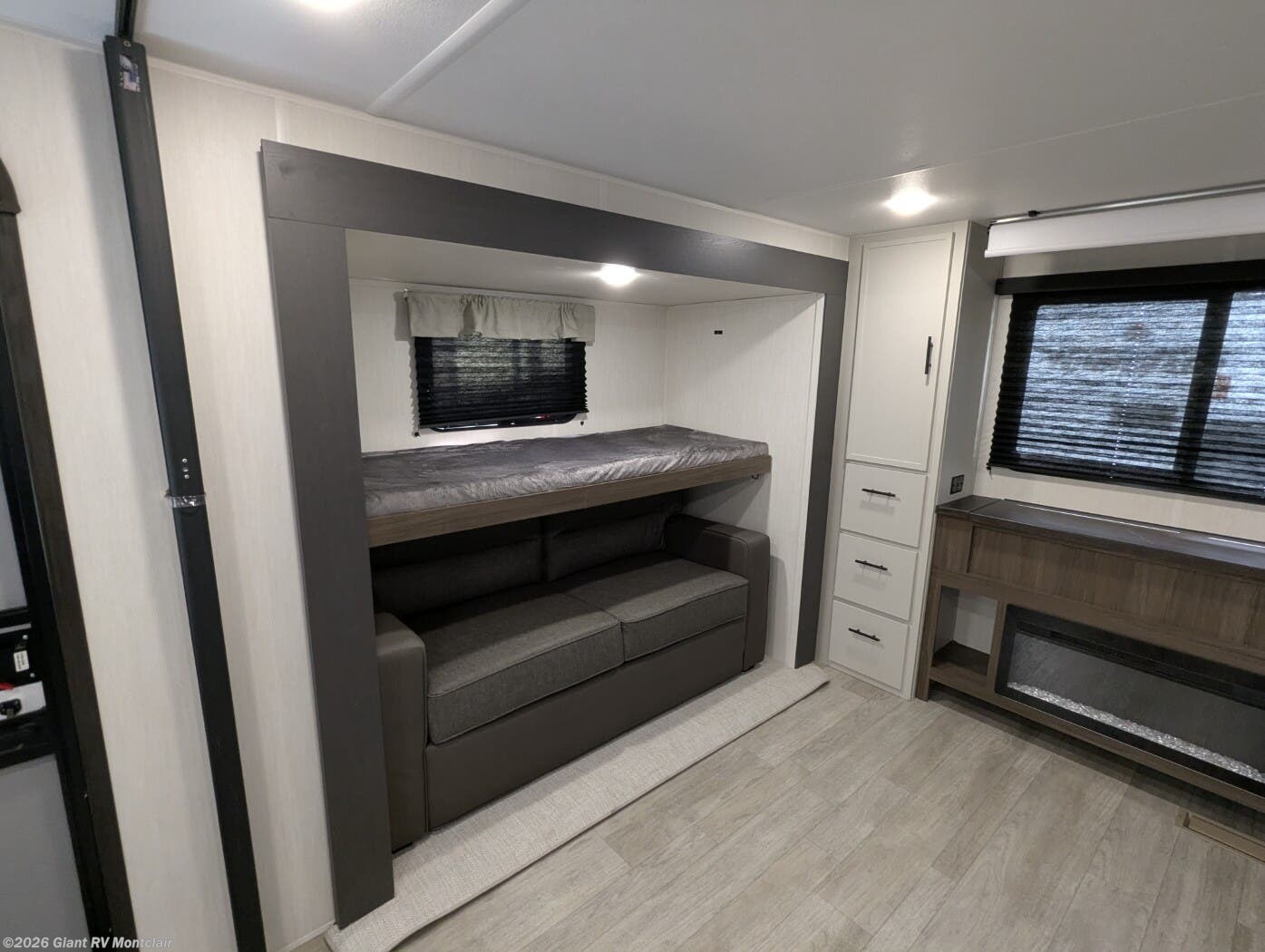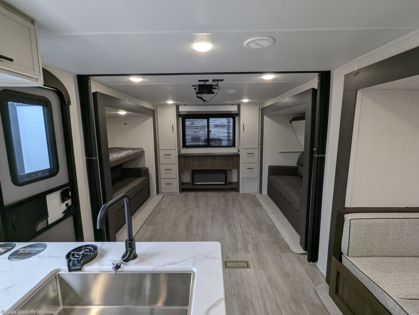 • Dual Living & Bunkhouse Design featuring a rear multi-use room with opposing slides, bunk beds, and sofa seating — perfect as a second living area or private space for kids and guests.