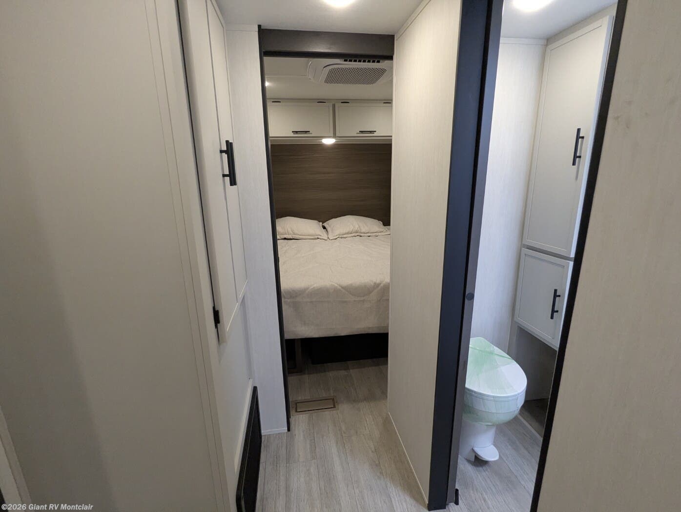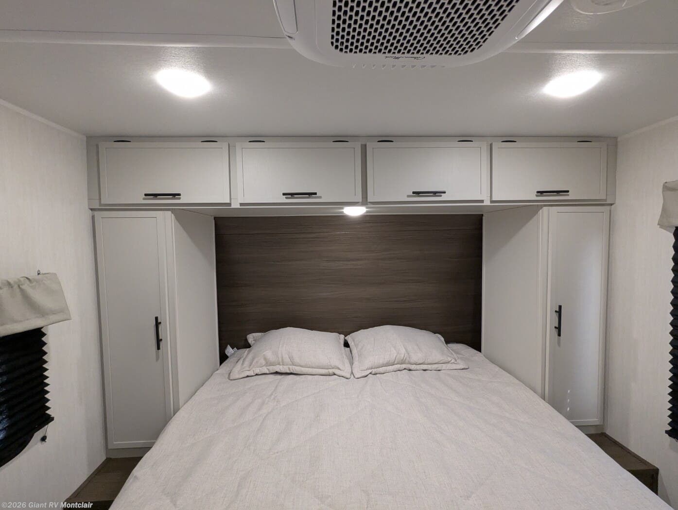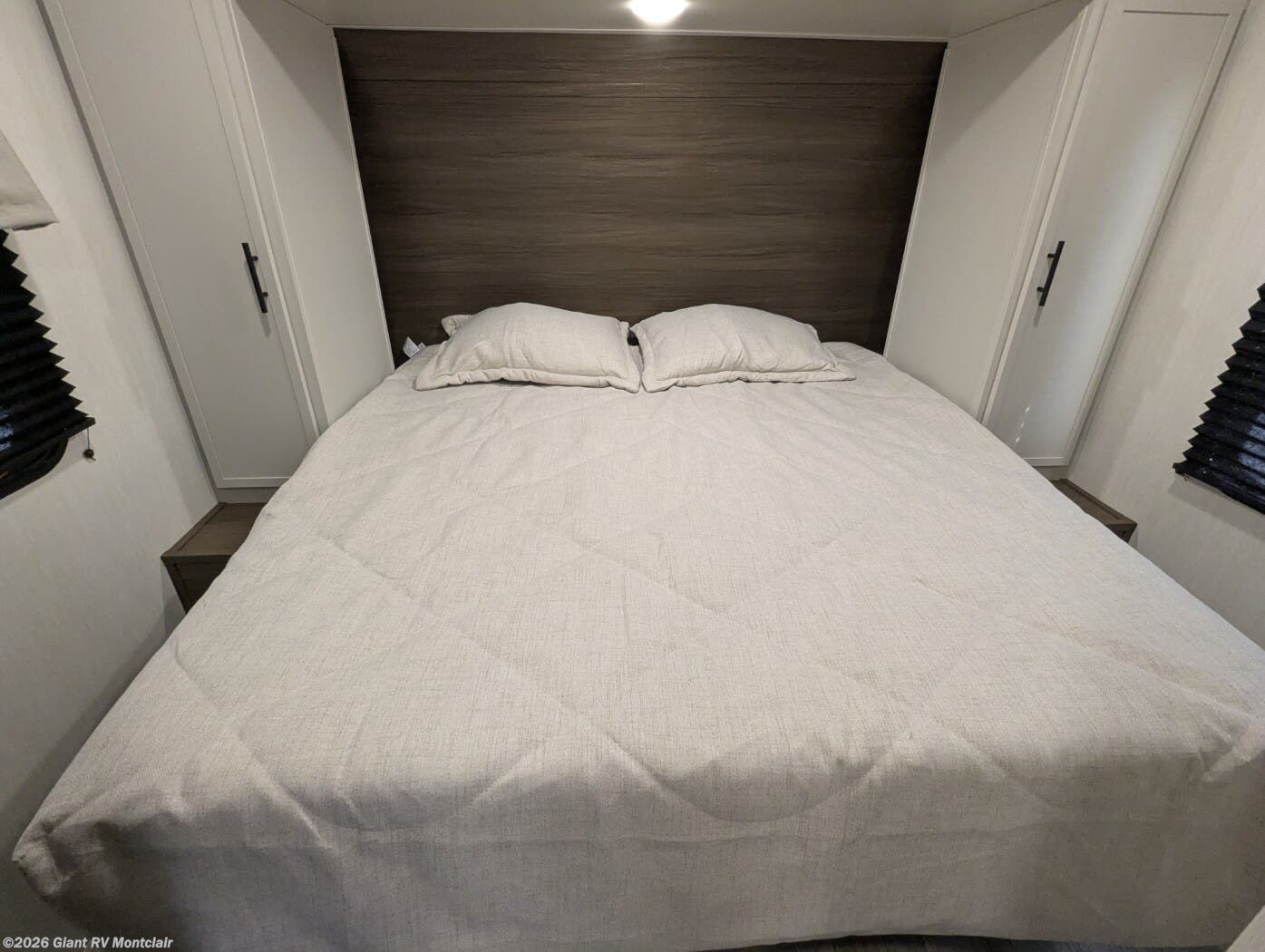 • Private Master Bedroom & Premium Features with a camp king bed, dual wardrobes, under-bed storage, tankless water heater, power awning with LED lighting, available dual A/C, exterior storage, and sleeping capacity for up to 10+.