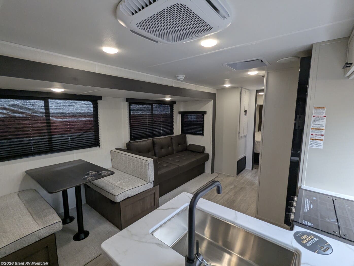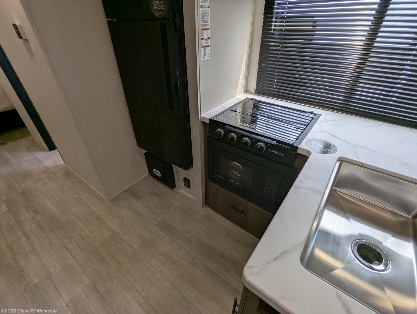 • Residential Kitchen & Dining Space including a 10.6 cu. ft. refrigerator, three-burner cooktop, convection microwave with air fryer, farmhouse sink, large dinette, and hidden pantry storage for everyday convenience.