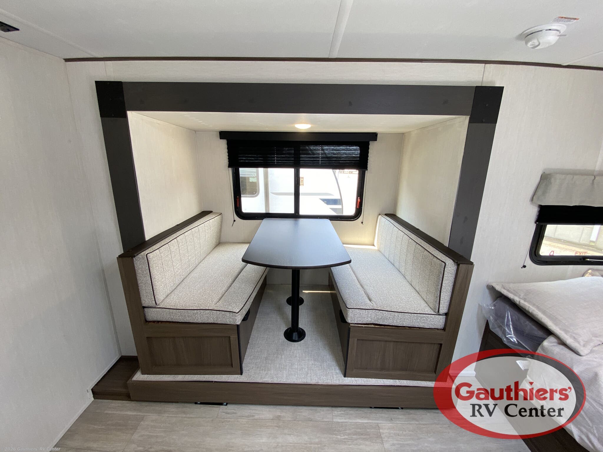 The LT 17BHS floorplan showcases bunk beds and a mid kitchen, making it a fantastic choice for families or groups seeking flexible sleeping arrangements without sacrificing living space. The interior includes a booth dinette for dining and extra sleeping versatility, a skylight to brighten the day, and roof vents for comfortable airflow. A clean, functional shower and flush toilet complete the main living area, while practical storage keeps gear organized on the road.