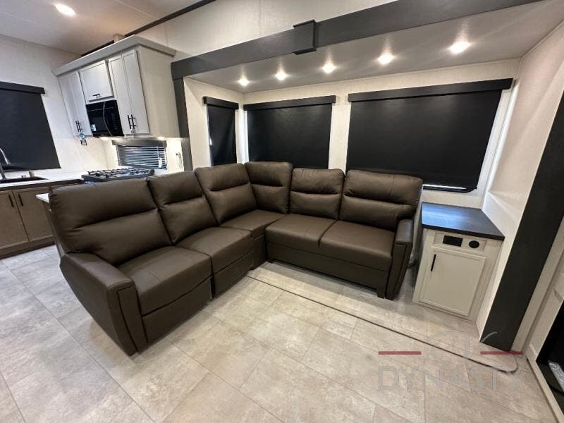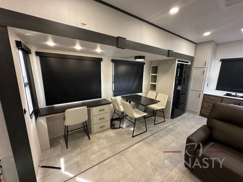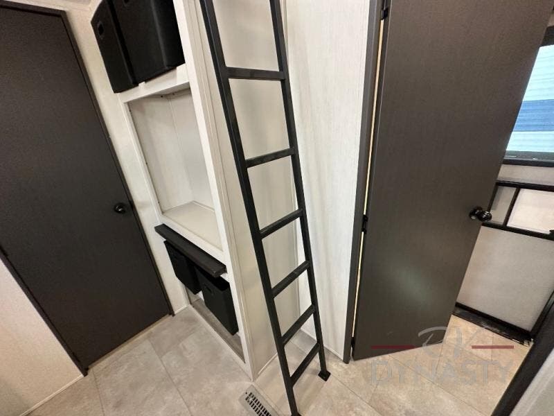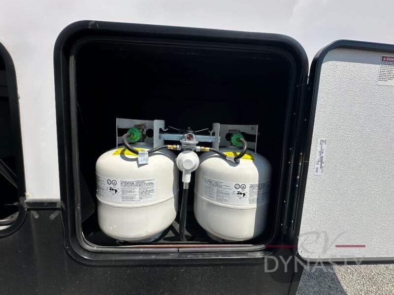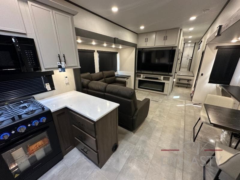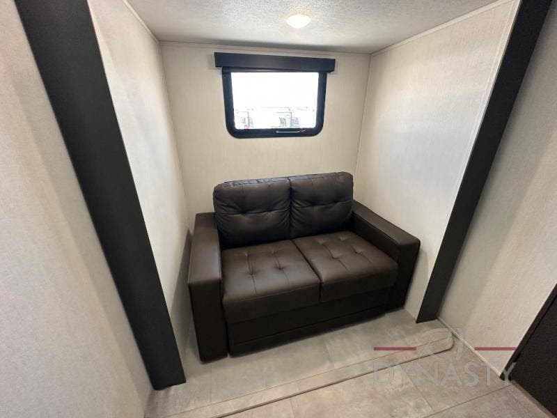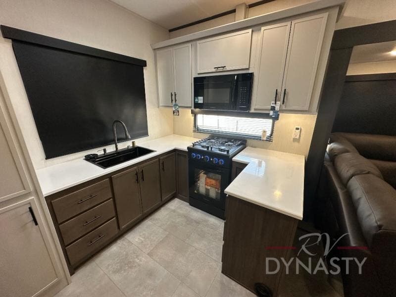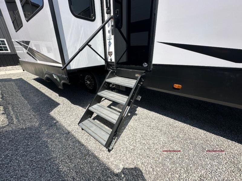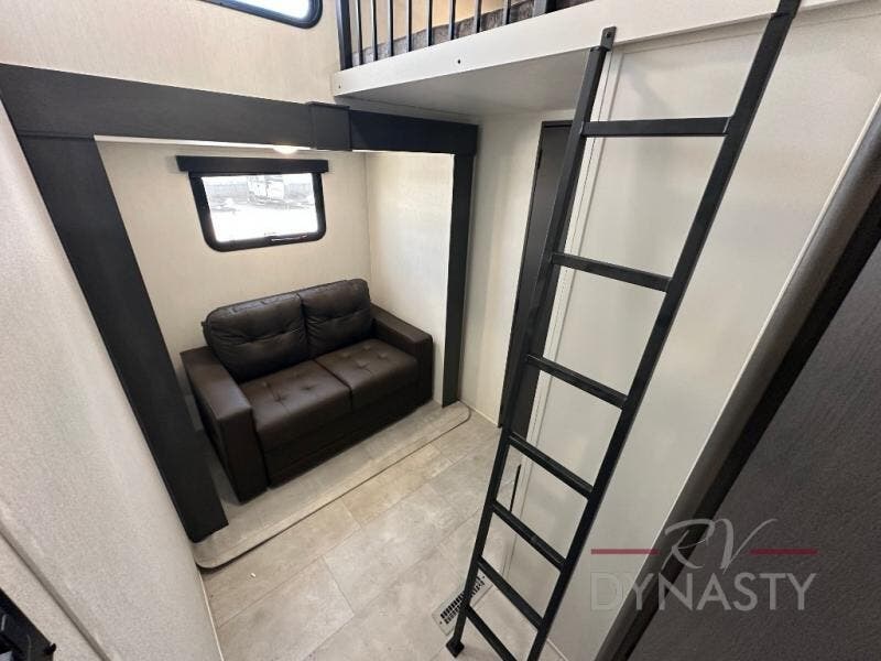 If you enjoy camping with family or friends, this fifth wheel is sure to meet all of your needs! The front bedroom includes a queen bed slide out for more space and comfort, plus a front wardrobe with washer and dryer prep. And the full bath is right next door for easy nighttime use. Your guests can utilize the middle bonus room that includes an E-Z glide sofa slide out, a private loft, and a half bath! The living room is made spacious thanks to the dual opposing slides, and you'll find a sectional sleeper sofa here, as well as desk with a chair and a free-standing table with chairs. And don't overlook the rear kitchen with ample counter space, a four burner range, an accessory sink and a French door 12V refrigerator!