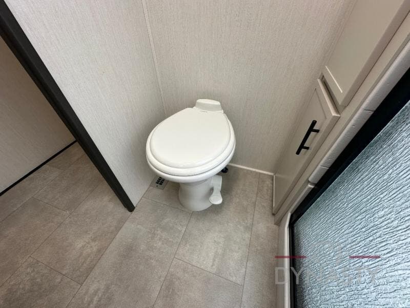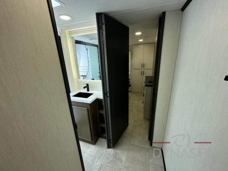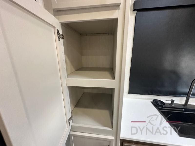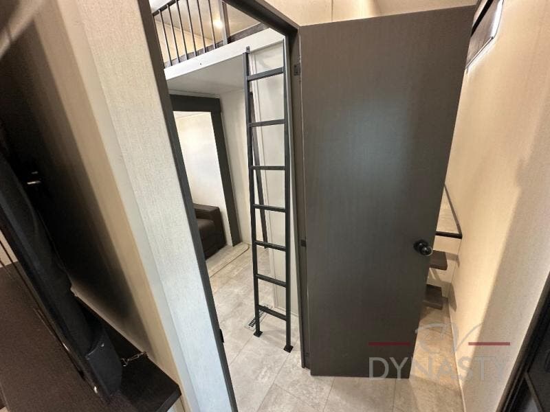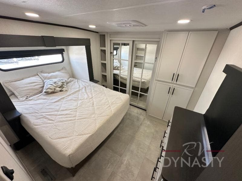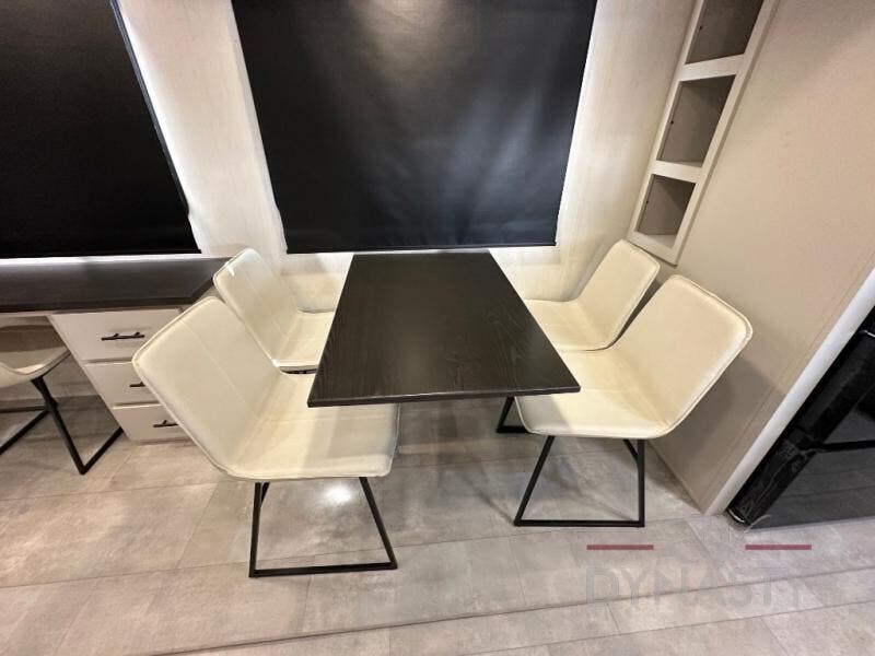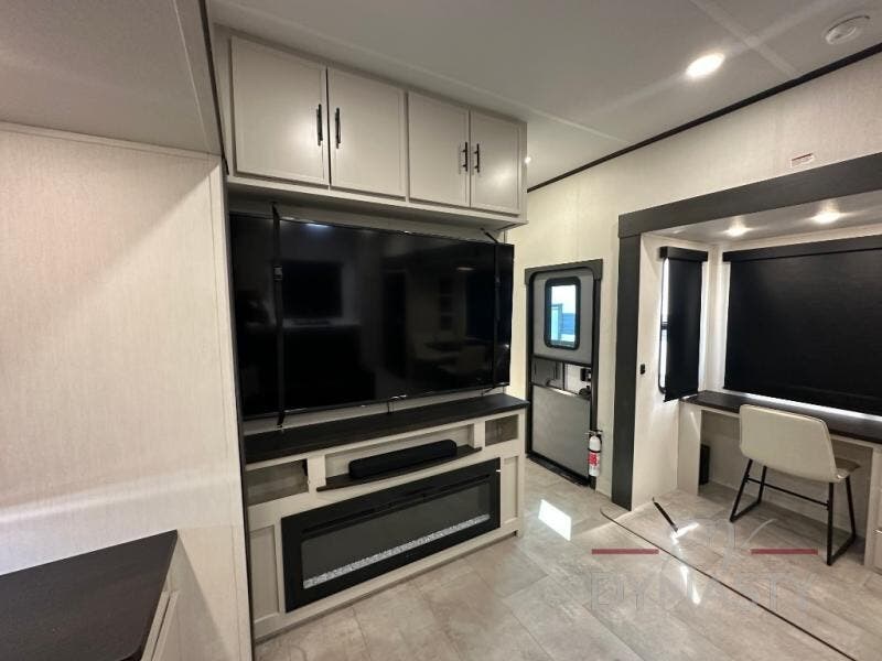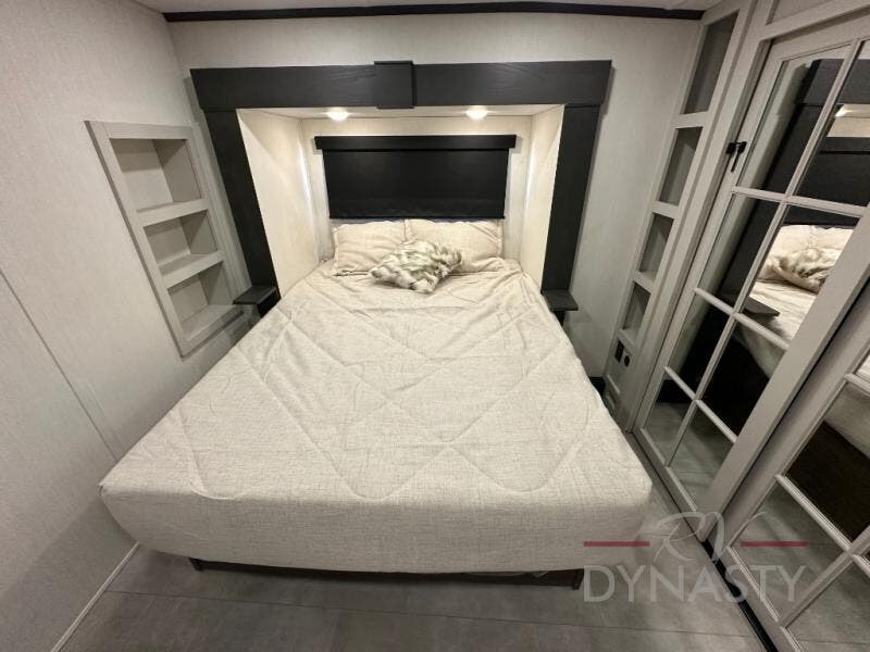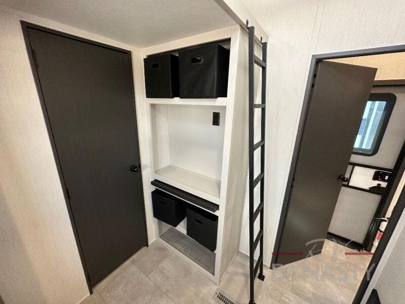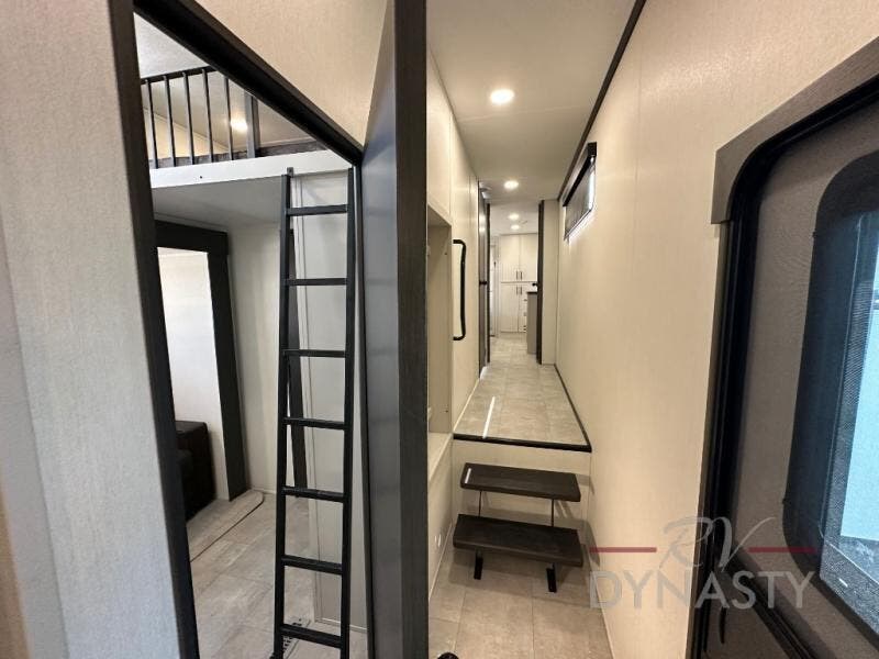 If you enjoy camping with family or friends, this fifth wheel is sure to meet all of your needs! The front bedroom includes a queen bed slide out for more space and comfort, plus a front wardrobe with washer and dryer prep. And the full bath is right next door for easy nighttime use. Your guests can utilize the middle bonus room that includes an E-Z glide sofa slide out, a private loft, and a half bath! The living room is made spacious thanks to the dual opposing slides, and you'll find a sectional sleeper sofa here, as well as desk with a chair and a free-standing table with chairs. And don't overlook the rear kitchen with ample counter space, a four burner range, an accessory sink and a French door 12V refrigerator!