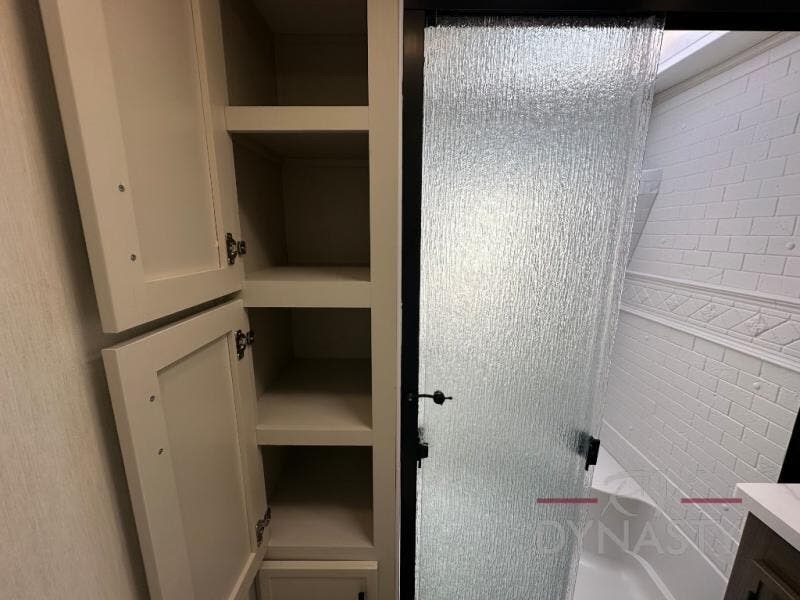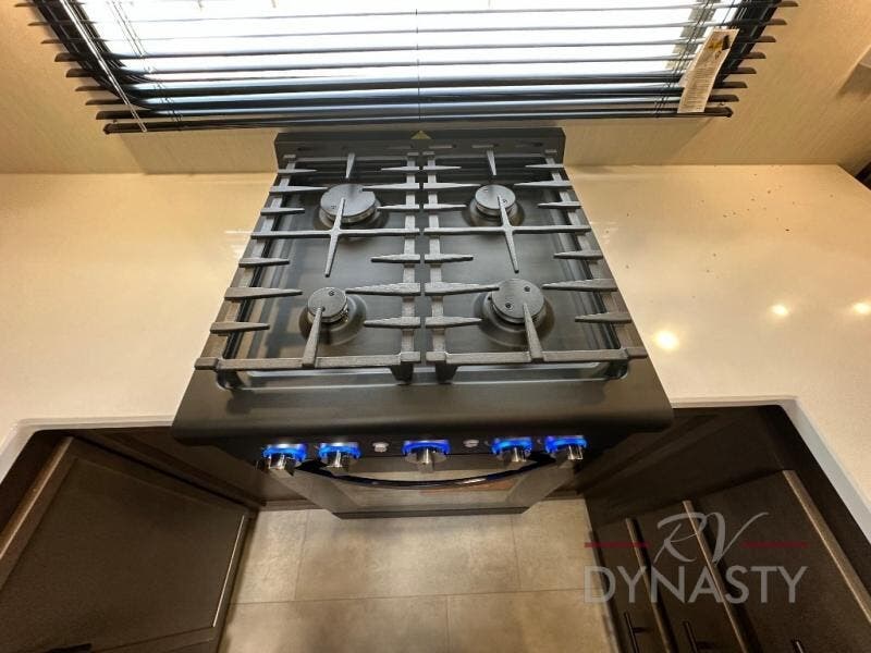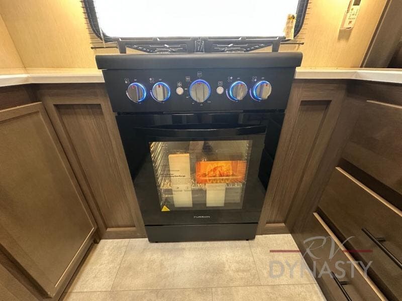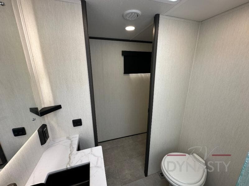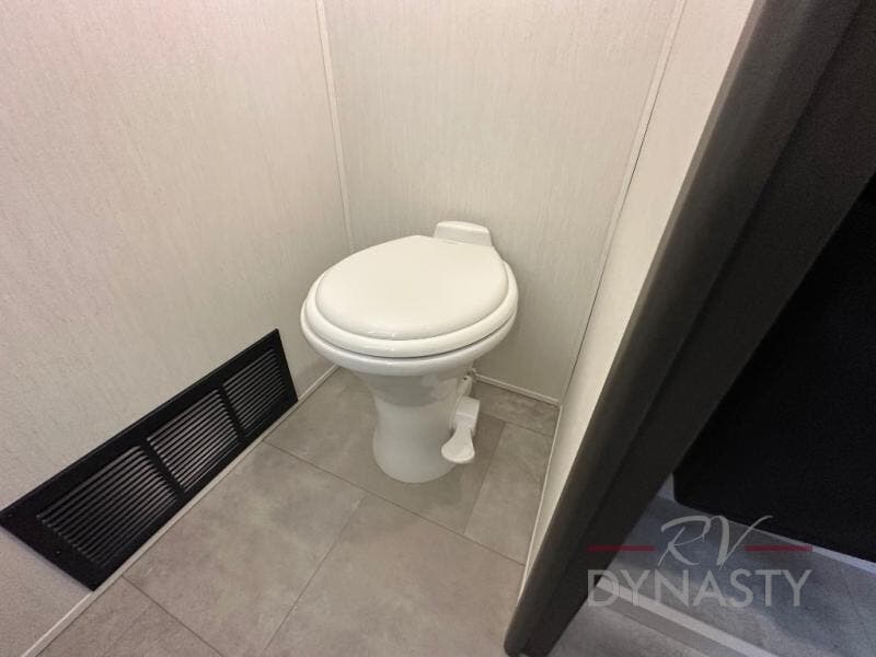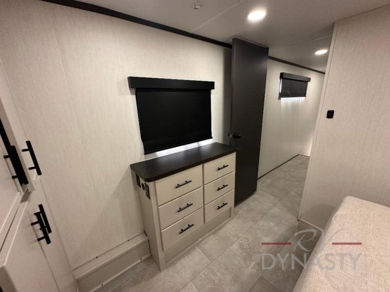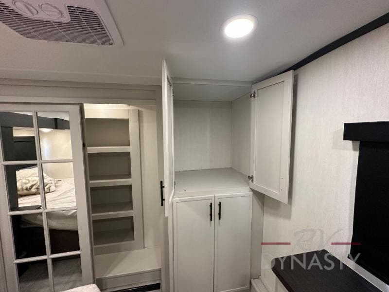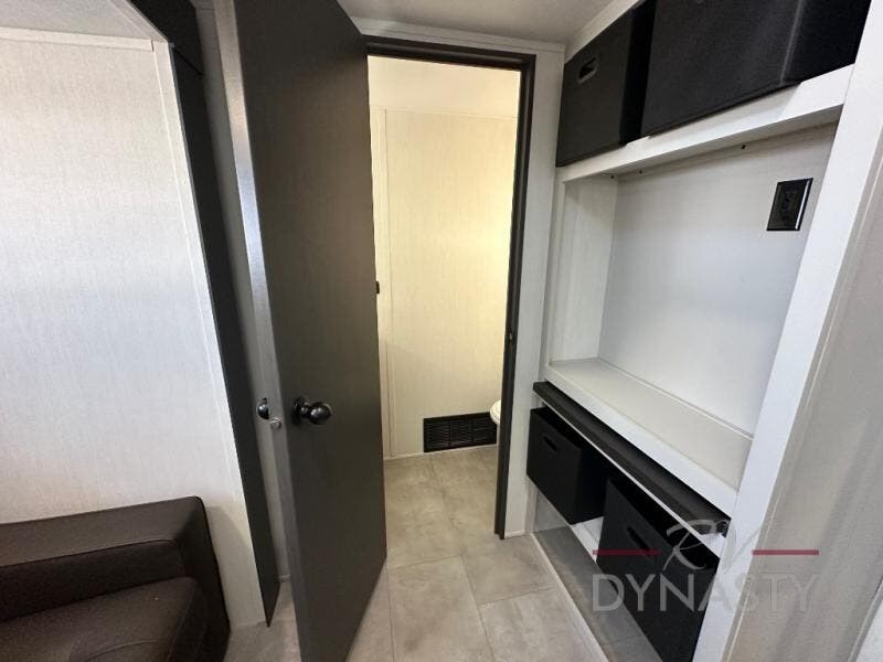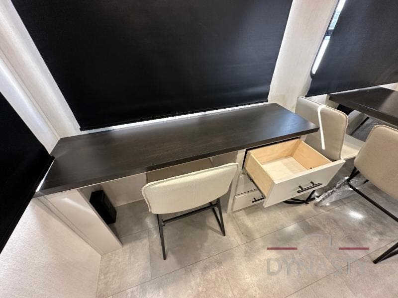 If you enjoy camping with family or friends, this fifth wheel is sure to meet all of your needs! The front bedroom includes a queen bed slide out for more space and comfort, plus a front wardrobe with washer and dryer prep. And the full bath is right next door for easy nighttime use. Your guests can utilize the middle bonus room that includes an E-Z glide sofa slide out, a private loft, and a half bath! The living room is made spacious thanks to the dual opposing slides, and you'll find a sectional sleeper sofa here, as well as desk with a chair and a free-standing table with chairs. And don't overlook the rear kitchen with ample counter space, a four burner range, an accessory sink and a French door 12V refrigerator!