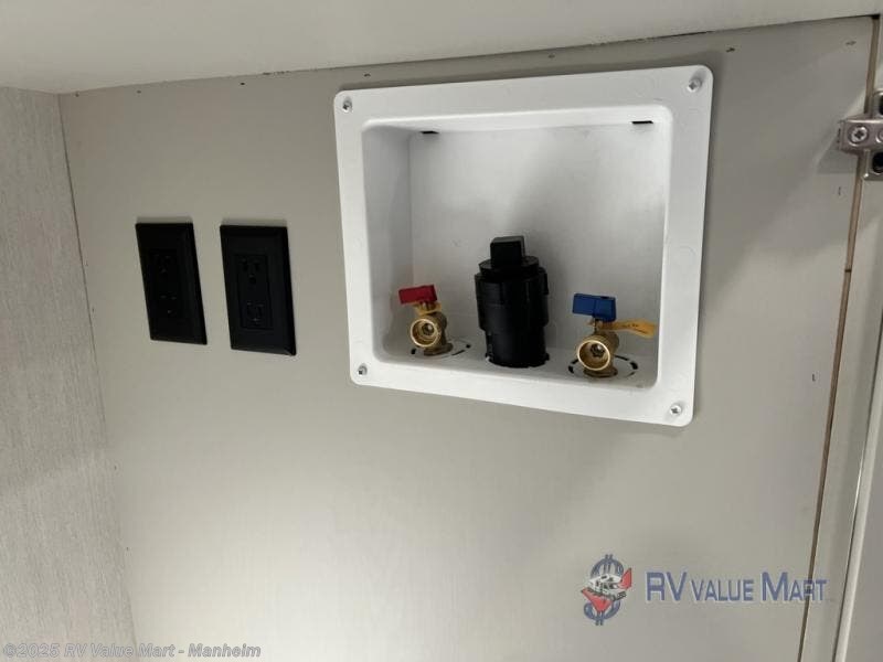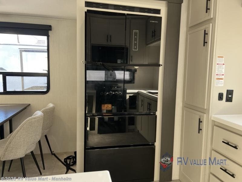 If you enjoy camping with family or friends, this fifth wheel is sure to meet all of your needs! The front bedroom includes a queen bed slide out for more space and comfort, plus a front wardrobe with washer and dryer prep. And the full bath is right next door for easy nighttime use. Your guests can utilize the middle bonus room that includes an E-Z glide sofa slide out, a private loft, and a half bath! The living room is made spacious thanks to the dual opposing slides, and you'll find a sectional sleeper sofa here, as well as desk with a chair and a free-standing table with chairs. And don't overlook the rear kitchen with ample counter space, a four burner range, an accessory sink and a French door 12V refrigerator!