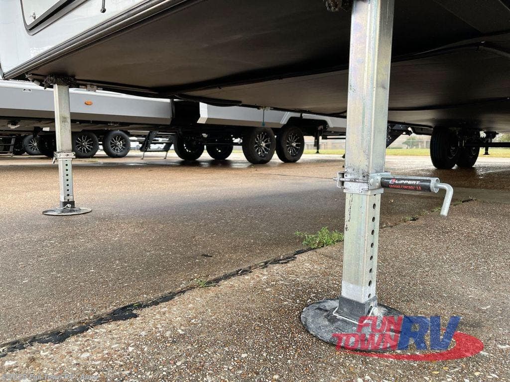 If you enjoy camping with family or friends, this fifth wheel is sure to meet all of your needs! The front bedroom includes a queen bed slide out for more space and comfort, plus a front wardrobe with washer and dryer prep. And the full bath is right next door for easy nighttime use. Your guests can utilize the middle bonus room that includes an E-Z glide sofa slide out, a private loft, and a half bath! The living room is made spacious thanks to the dual opposing slides, and you'll find a sectional sleeper sofa here, as well as desk with a chair and a free-standing table with chairs. And don't overlook the rear kitchen with ample counter space, a four burner range, an accessory sink and a French door 12V refrigerator!
