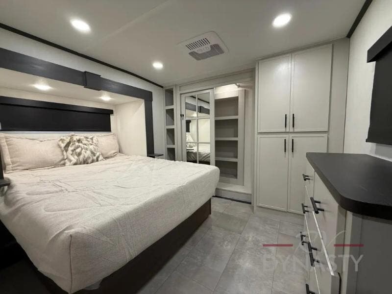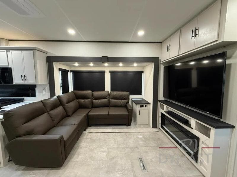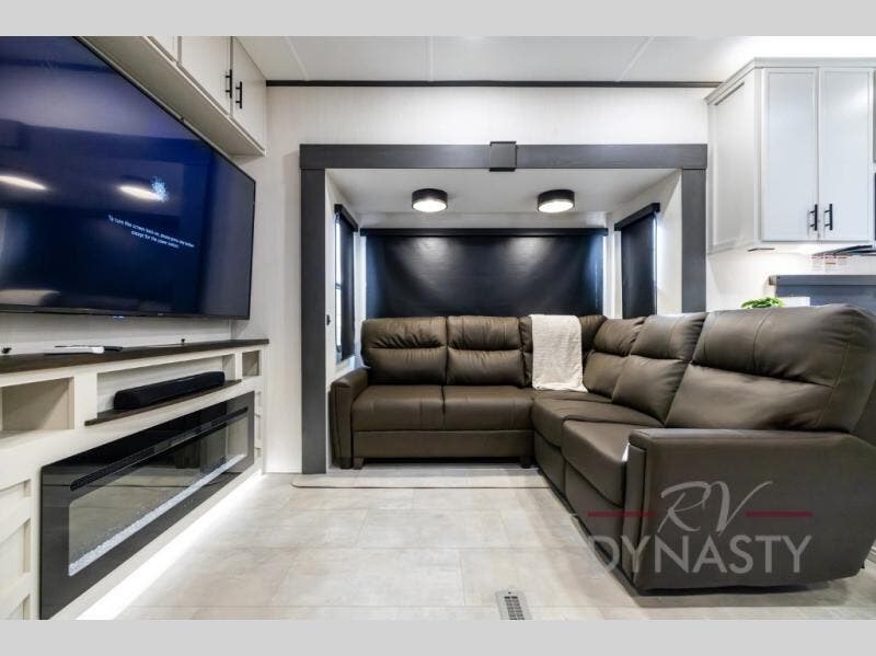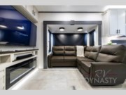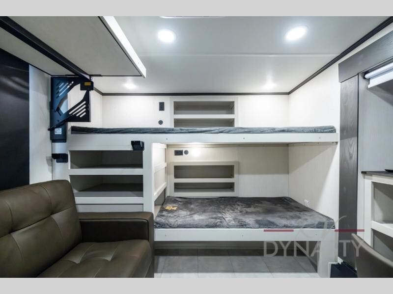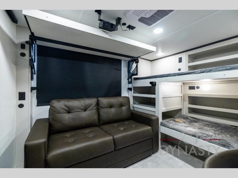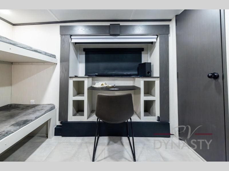 If you enjoy long trips with family and friends, this fifth wheel is sure to meet all of your needs! There is a private bedroom with a king bed slide-out for more space and comfort, plus a front wardrobe. And you will be amazed by the lovely full bathroom behind the barn door next to the bedroom with a double vanity for you and your partner! The living room is made spacious thanks to the dual opposing slides, and you'll find a sectional sleeper sofa here, as well as desk/dinette for meals and even work. And don't overlook the kitchen area with ample counter space, a four burner range, an accessory sink and a French door 12V refrigerator! If you thought it can“t get better, wait until you see the front room that will be the best place to relax and hang out, featuring a sleeper sofa, bunks above, and an entertainment center with a projector for a movie marathon.