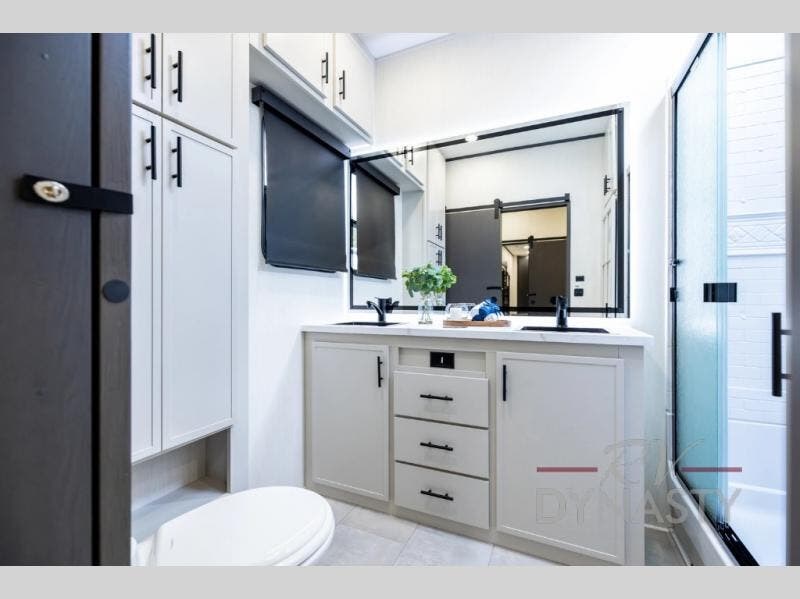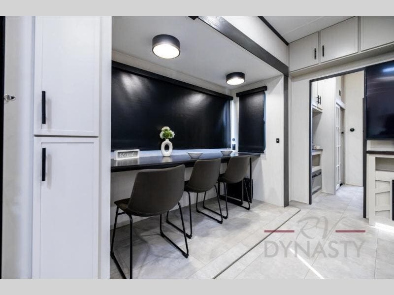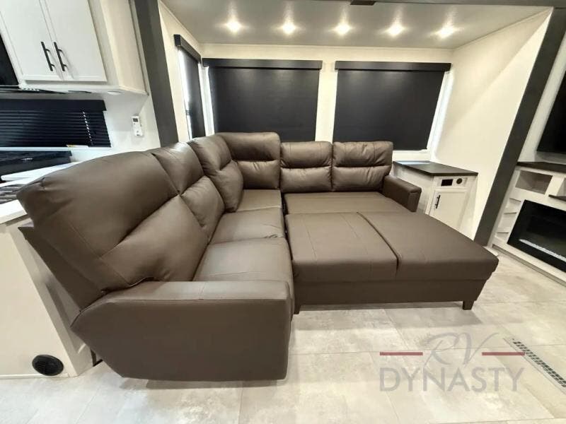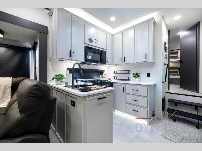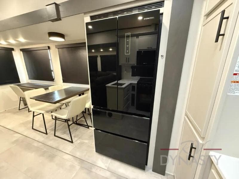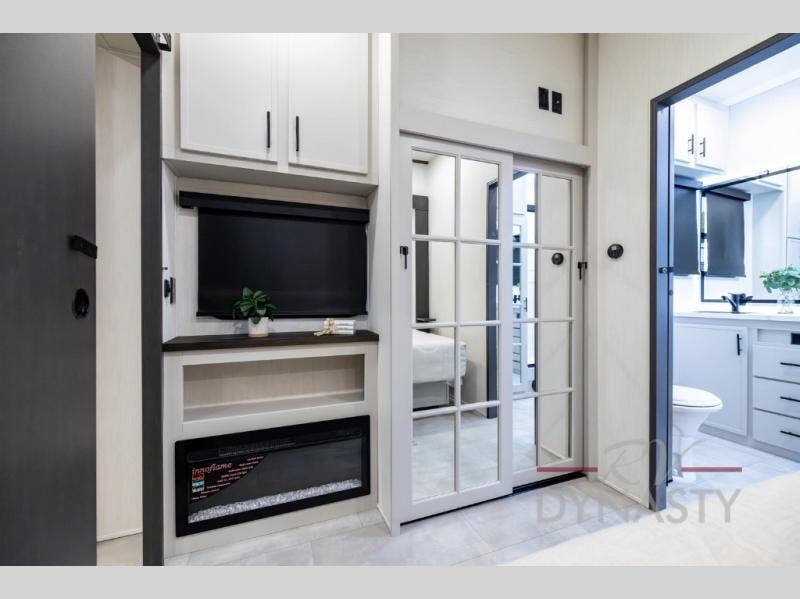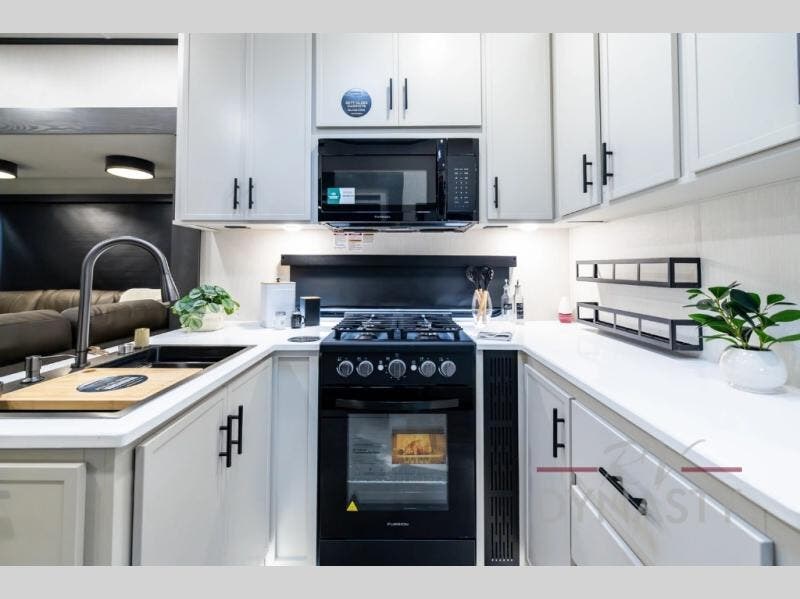 If you enjoy long trips with family and friends, this fifth wheel is sure to meet all of your needs! There is a private bedroom with a king bed slide-out for more space and comfort, plus a front wardrobe. And you will be amazed by the lovely full bathroom behind the barn door next to the bedroom with a double vanity for you and your partner! The living room is made spacious thanks to the dual opposing slides, and you'll find a sectional sleeper sofa here, as well as desk/dinette for meals and even work. And don't overlook the kitchen area with ample counter space, a four burner range, an accessory sink and a French door 12V refrigerator! If you thought it can“t get better, wait until you see the front room that will be the best place to relax and hang out, featuring a sleeper sofa, bunks above, and an entertainment center with a projector for a movie marathon.