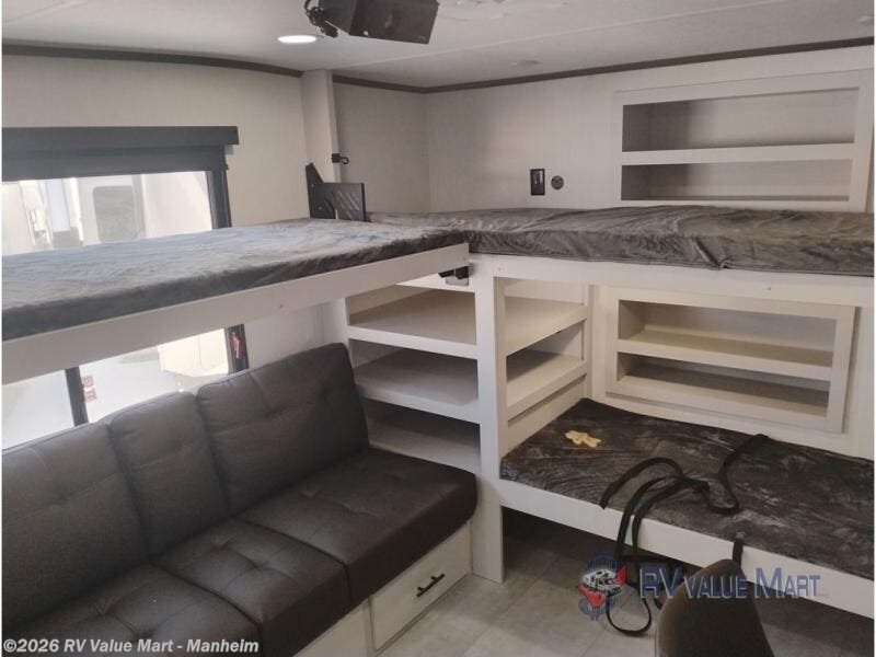 If you enjoy long trips with family and friends, this fifth wheel is sure to meet all of your needs! There is a private bedroom with a king bed slide-out for more space and comfort, plus a front wardrobe. And you will be amazed by the lovely full bathroom behind the barn door next to the bedroom with a double vanity for you and your partner! The living room is made spacious thanks to the dual opposing slides, and you'll find a sectional sleeper sofa here, as well as desk/dinette for meals and even work. And don't overlook the kitchen area with ample counter space, a four burner range, an accessory sink and a French door 12V refrigerator! If you thought it can“t get better, wait until you see the front room that will be the best place to relax and hang out, featuring a sleeper sofa, bunks above, and an entertainment center with a projector for a movie marathon.