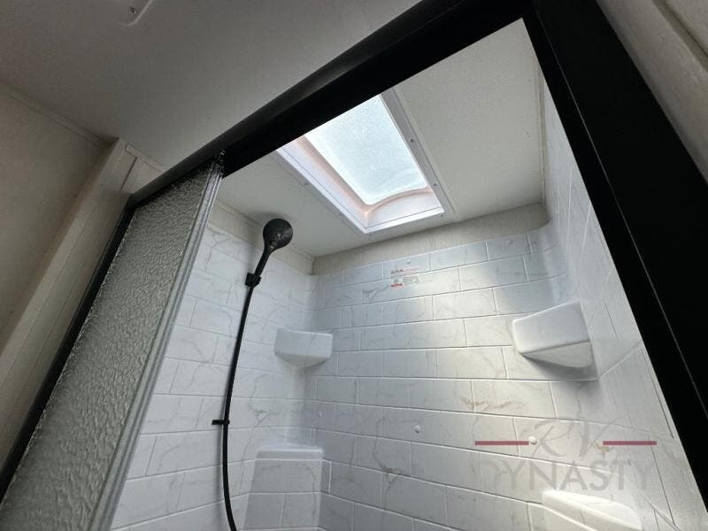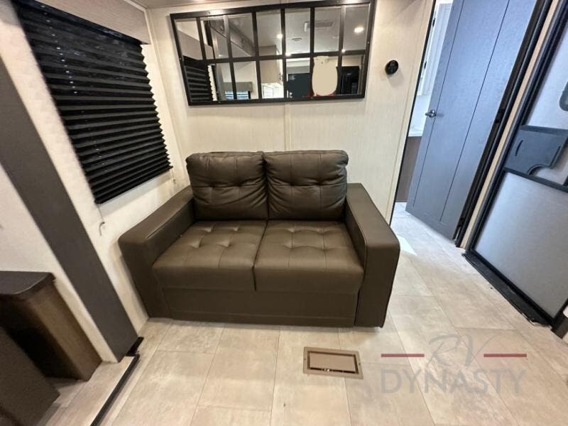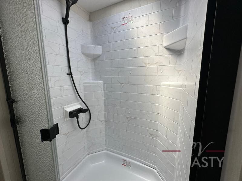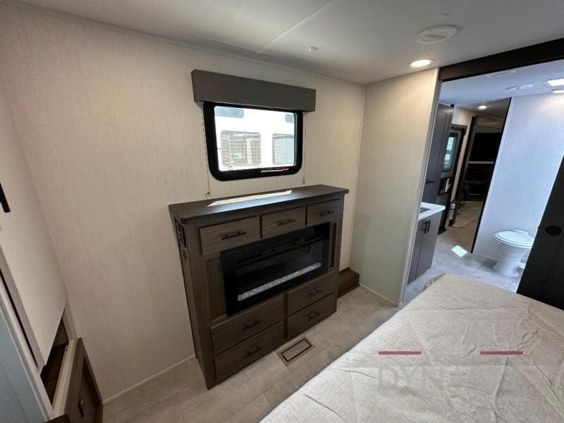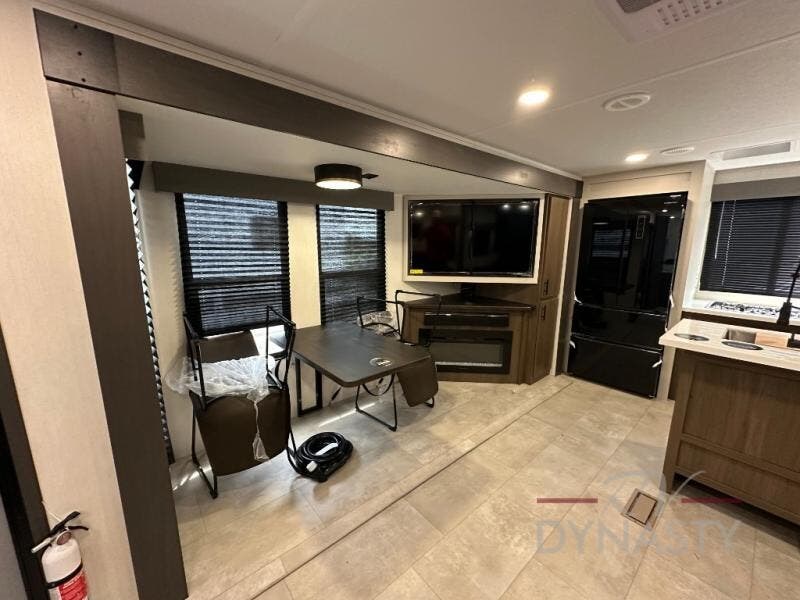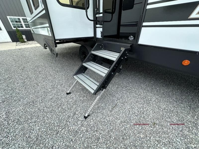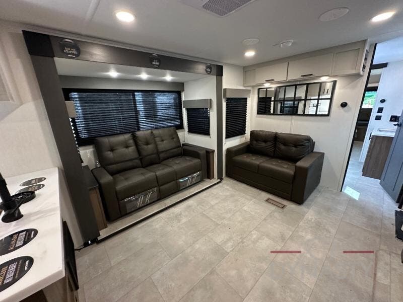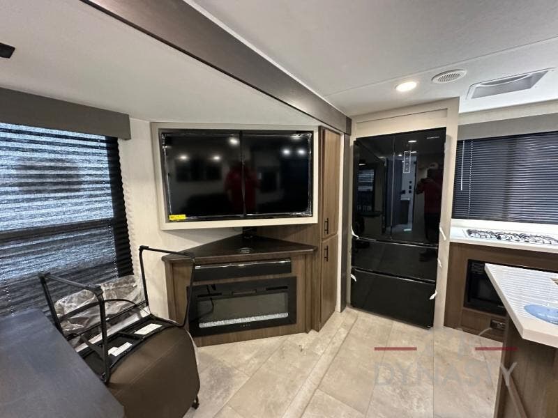 You will be ultra impressed by this LaCrosse travel trailer! First, the interior is made to feel just like your own home with its theater seating, hide-a-bed sofa, free-standing table with chairs, and entertainment center with 50" LED TV and fireplace. Second, you'll find even more residential comfort in the rear kitchen that has a three burner cooktop, a 30" microwave oven, and a 16.2 cubic foot 12V refrigerator. And lastly, the walk-through bathroom has two doors on either side with one of those doors leading directly into the front private bedroom, so you know you'll enjoy great comfort in this space each night. There is also a bedroom bench at the front of this trailer which gives you an enjoyable place to relax as you take in the views from the front windshield.