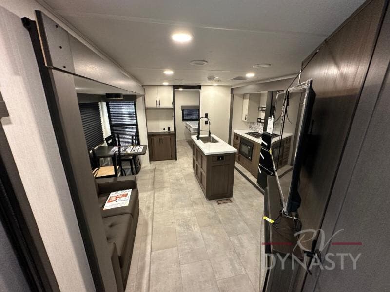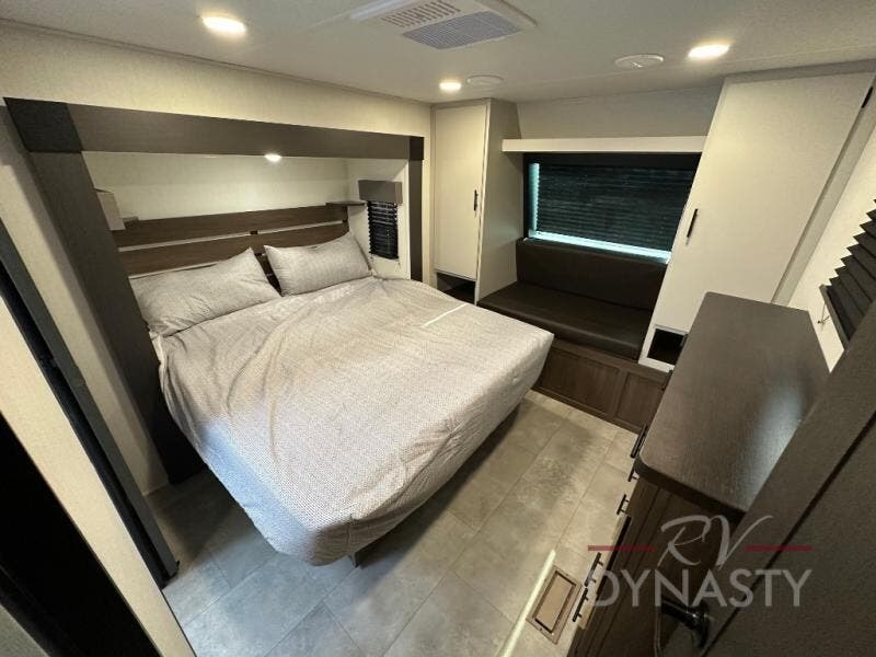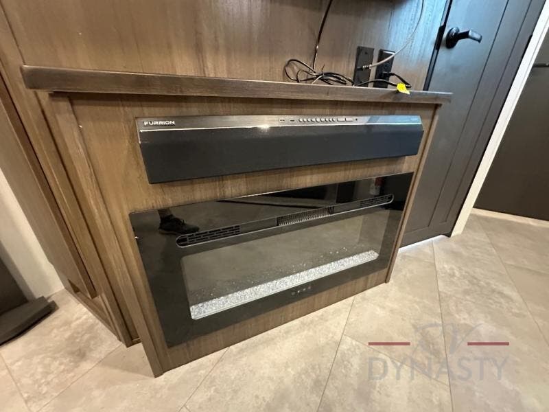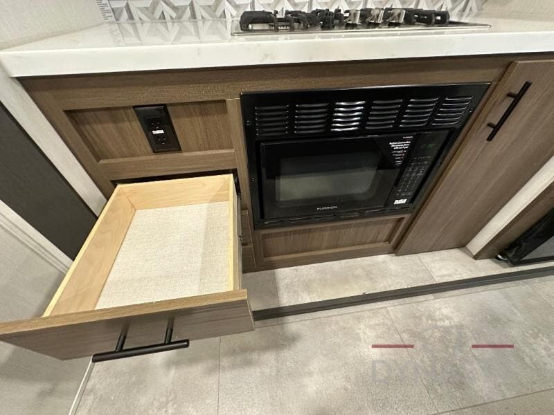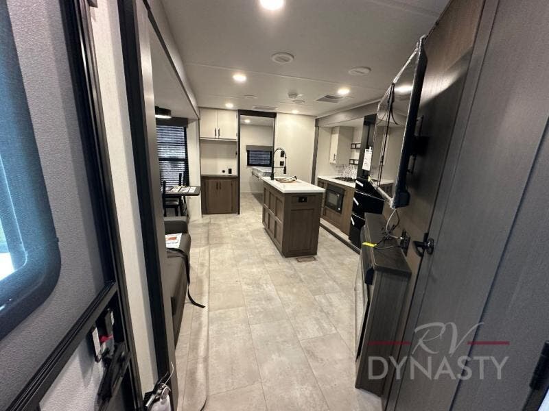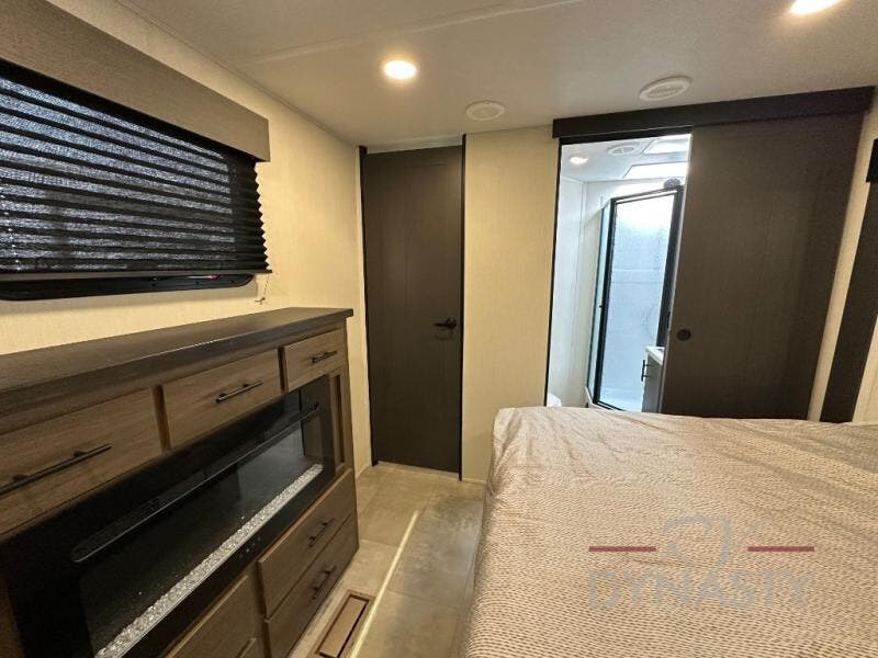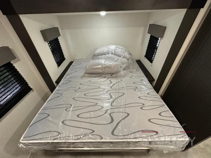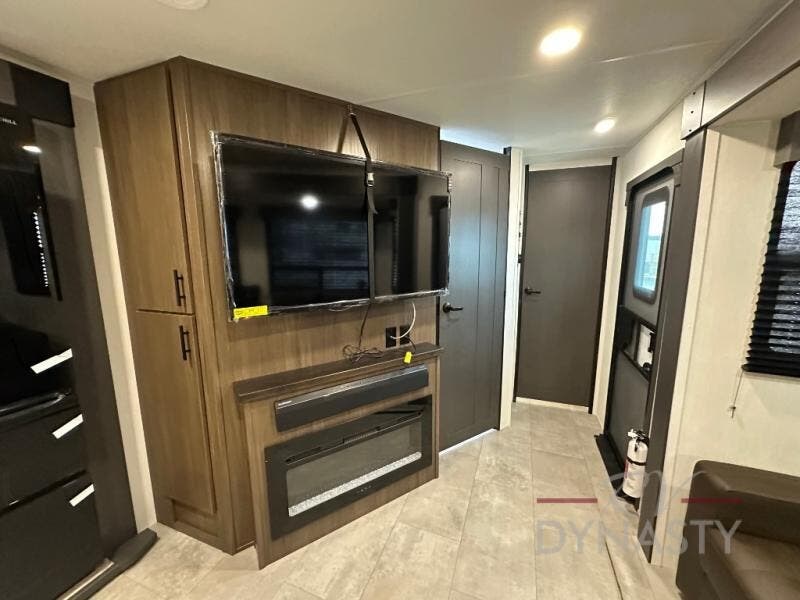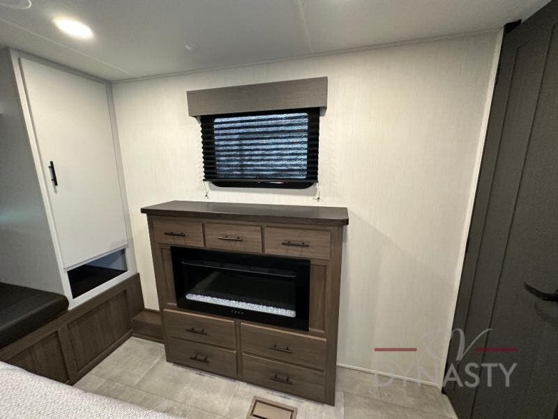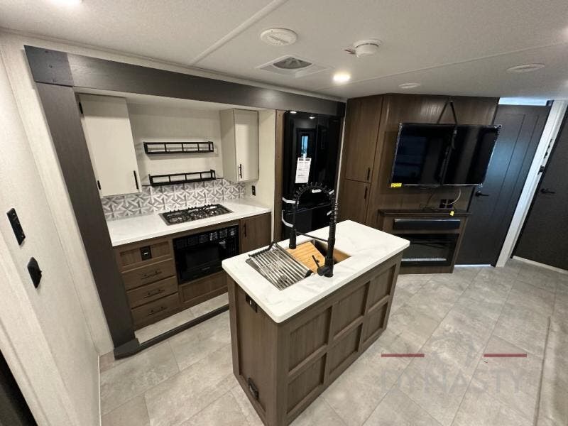 Privacy abounds in this travel trailer with a bedroom at each end! A king bed slide in the front has its own fireplace for cozy nights. Dual wardrobes frame the reading bench which looks out the front window for peaceful moments appreciating the view. At the rear, a second bedroom with queen bed has its own half bath. A pantry closet here also has prep for an optional washer/dryer for convenience on the road. In the center everyone can meet up in the spacious kitchen/living room. A hide-a-bed sofa has even more sleeping space, or relax there and watch the TV which is in the entertainment center along with another fireplace. The kitchen is well-equipped with a three-burner cooktop, microwave, and even an island where the sink is located for easy meal prep. Outside there are not one but two 10' power awnings for extra protection from the elements!