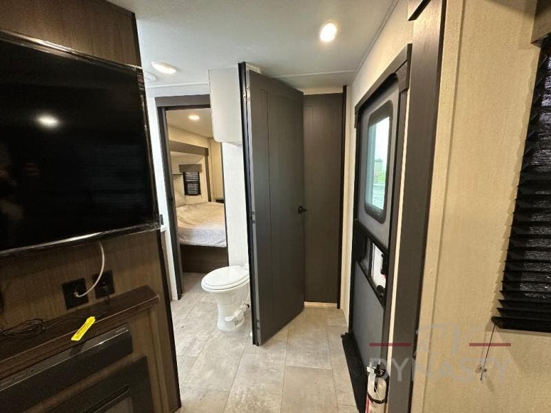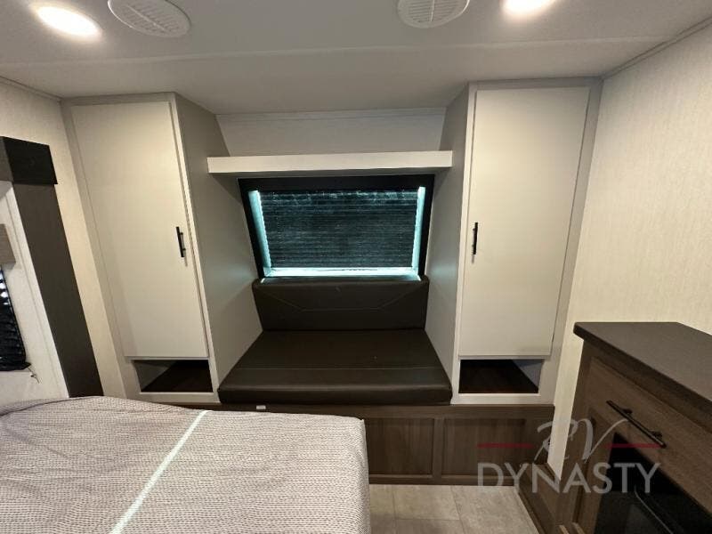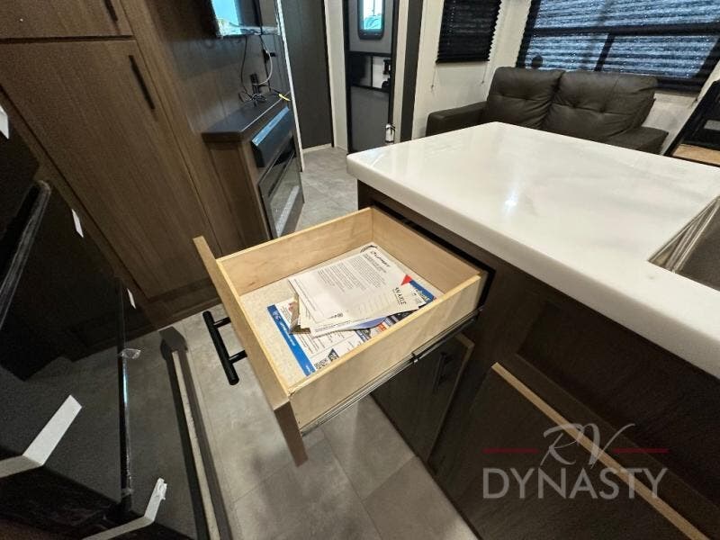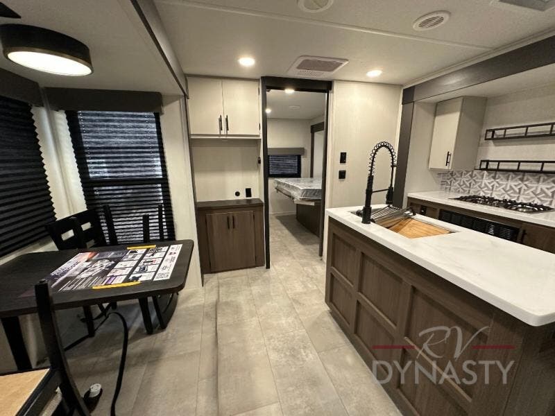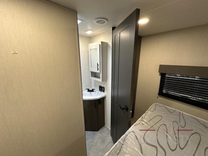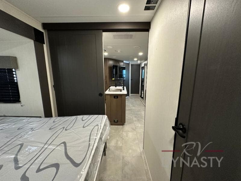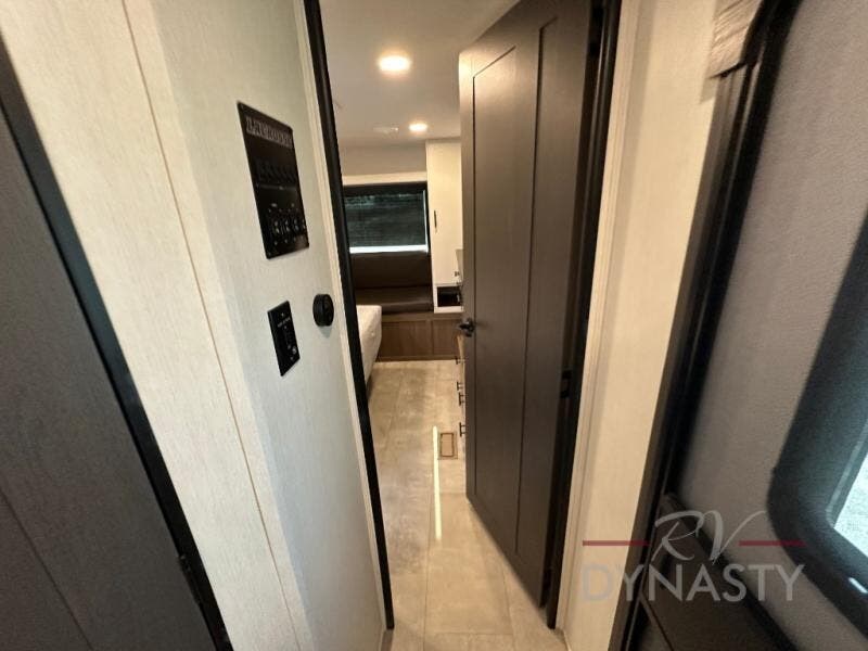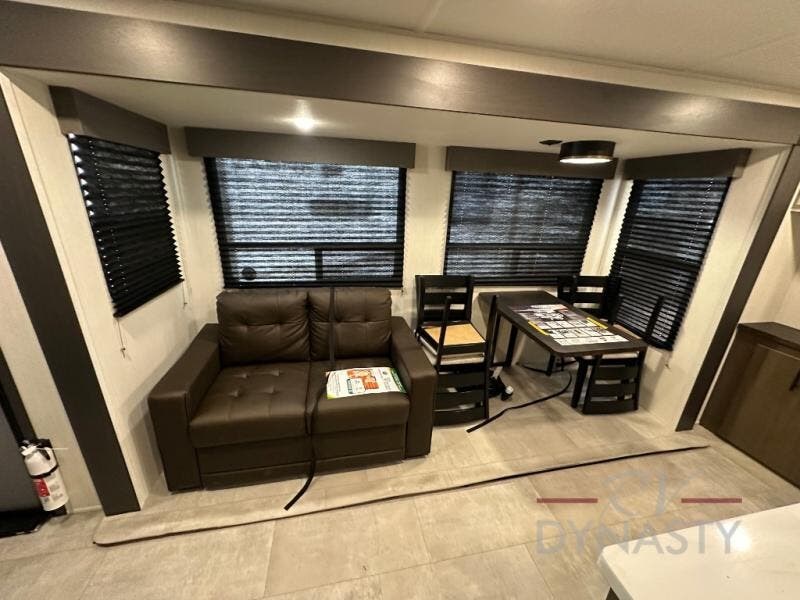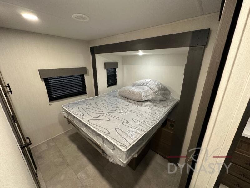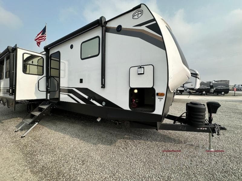 Privacy abounds in this travel trailer with a bedroom at each end! A king bed slide in the front has its own fireplace for cozy nights. Dual wardrobes frame the reading bench which looks out the front window for peaceful moments appreciating the view. At the rear, a second bedroom with queen bed has its own half bath. A pantry closet here also has prep for an optional washer/dryer for convenience on the road. In the center everyone can meet up in the spacious kitchen/living room. A hide-a-bed sofa has even more sleeping space, or relax there and watch the TV which is in the entertainment center along with another fireplace. The kitchen is well-equipped with a three-burner cooktop, microwave, and even an island where the sink is located for easy meal prep. Outside there are not one but two 10' power awnings for extra protection from the elements!